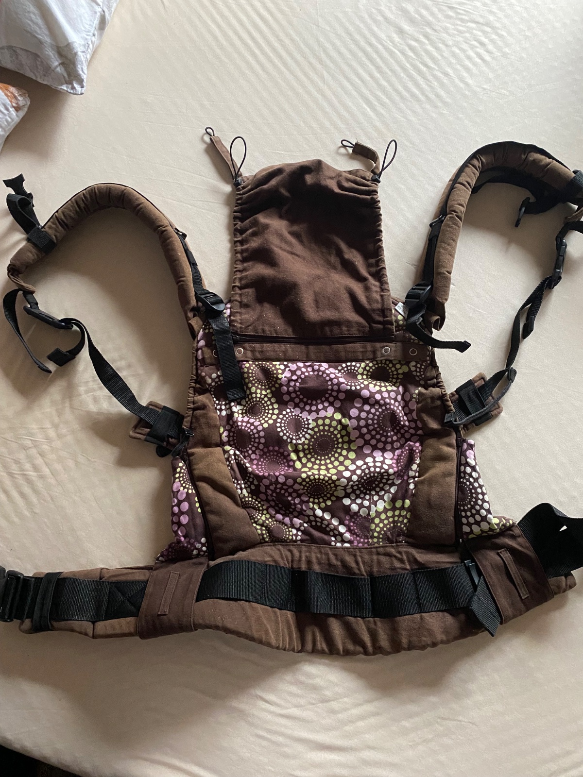Používaný nosič po dvoch deťoch. Vidno vyblednutie. Je to starší model bez extendorov. Vhodny do jeden a polroka. Je kompletný aj s kapuckou a novorodeneckou vložkou, vrátane látkového obalu