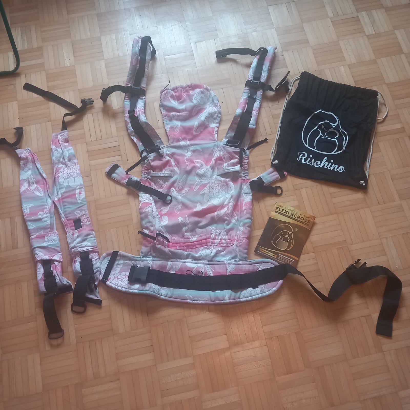 Velmi dobry noseny stav.Slovenska vyroba ergonomickeho nosica Rischino Flexi Xcross,limitovana edicia Pivony, na skladoch uz vypredana. Vhodna pre deticky velkosti 68-104, cca od 5 mesiacov. Je rozsiahle prisposobitelna rodicovi aj velkosti dietatka.