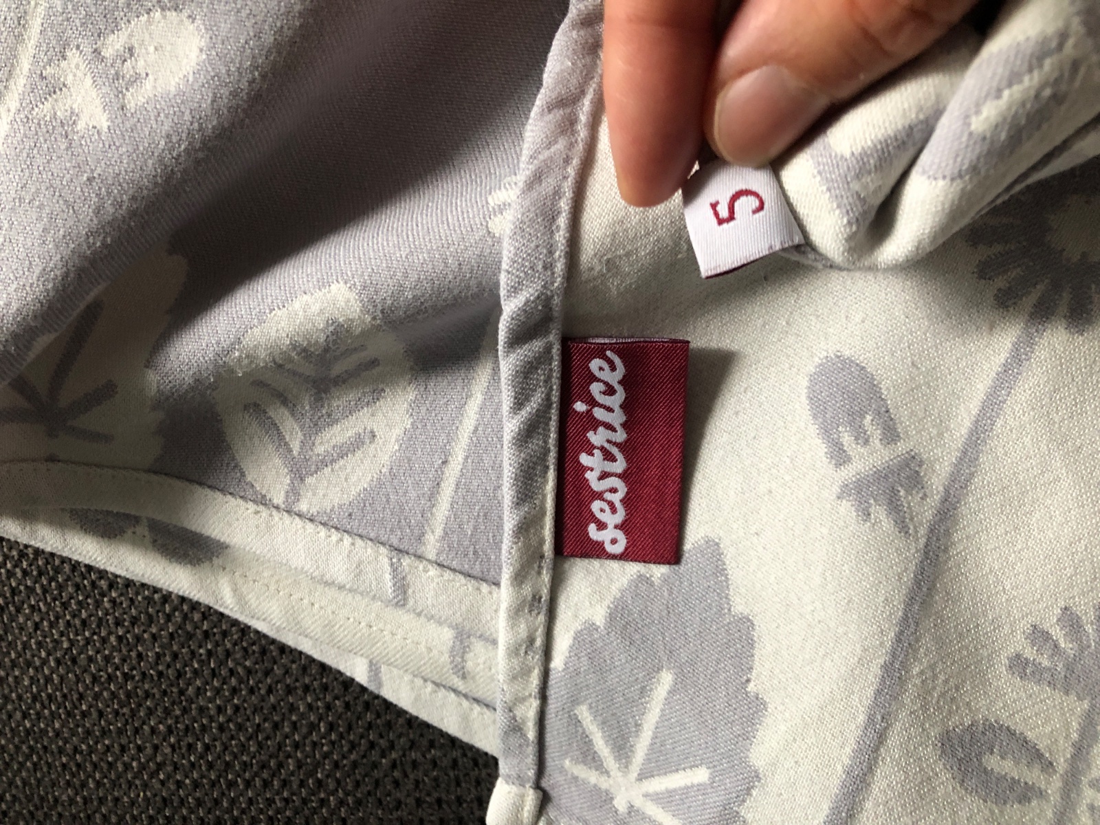 Sestrice iceberg vel 5, s tenclom. Je to ideálna šatka na celé nosiace obdobie od novorodenca -ľahko sa viaže, az po veľkáča-unesie veľa a drží super. Za mna najlepšie šatka. U nás 1x prana v modrom denkmite, kúpená od skúsenej nosiacej mamky. Malo sme sa nosili… dlhšie som vyberala šatku :D ale bude mi za ňou ľúto. Ma tri malé fliaciku vid foto a tenclovy chĺpok.