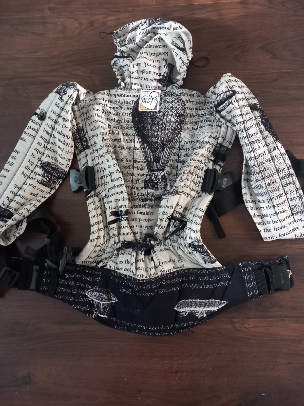 Ergonomický nosič značky Moyo, zanosený, čierny pásový popruh jemne vyblednutý. Praný v Denkmit bez parfumov,nefajčiarska domácnosť bez zvieratiek.