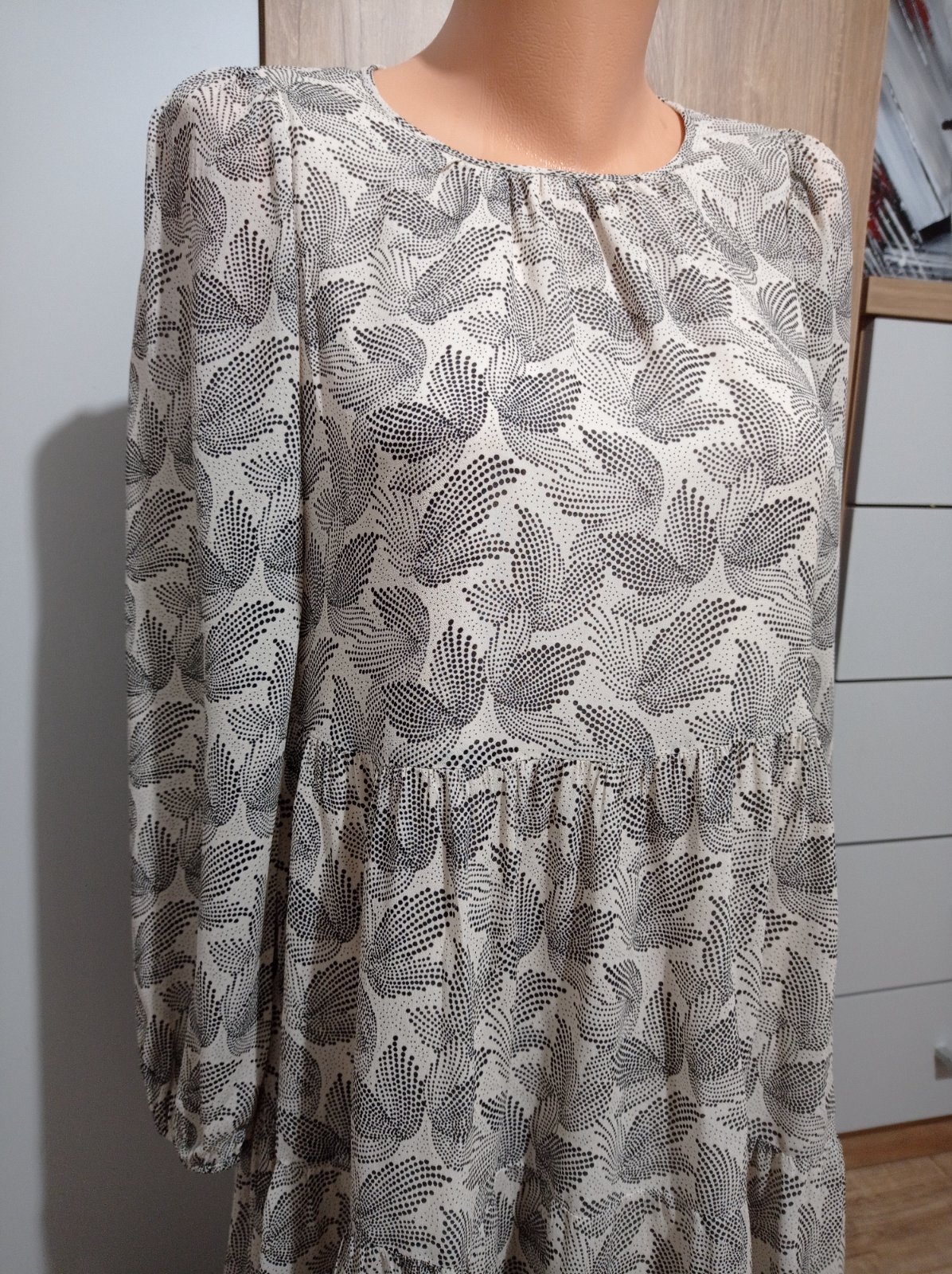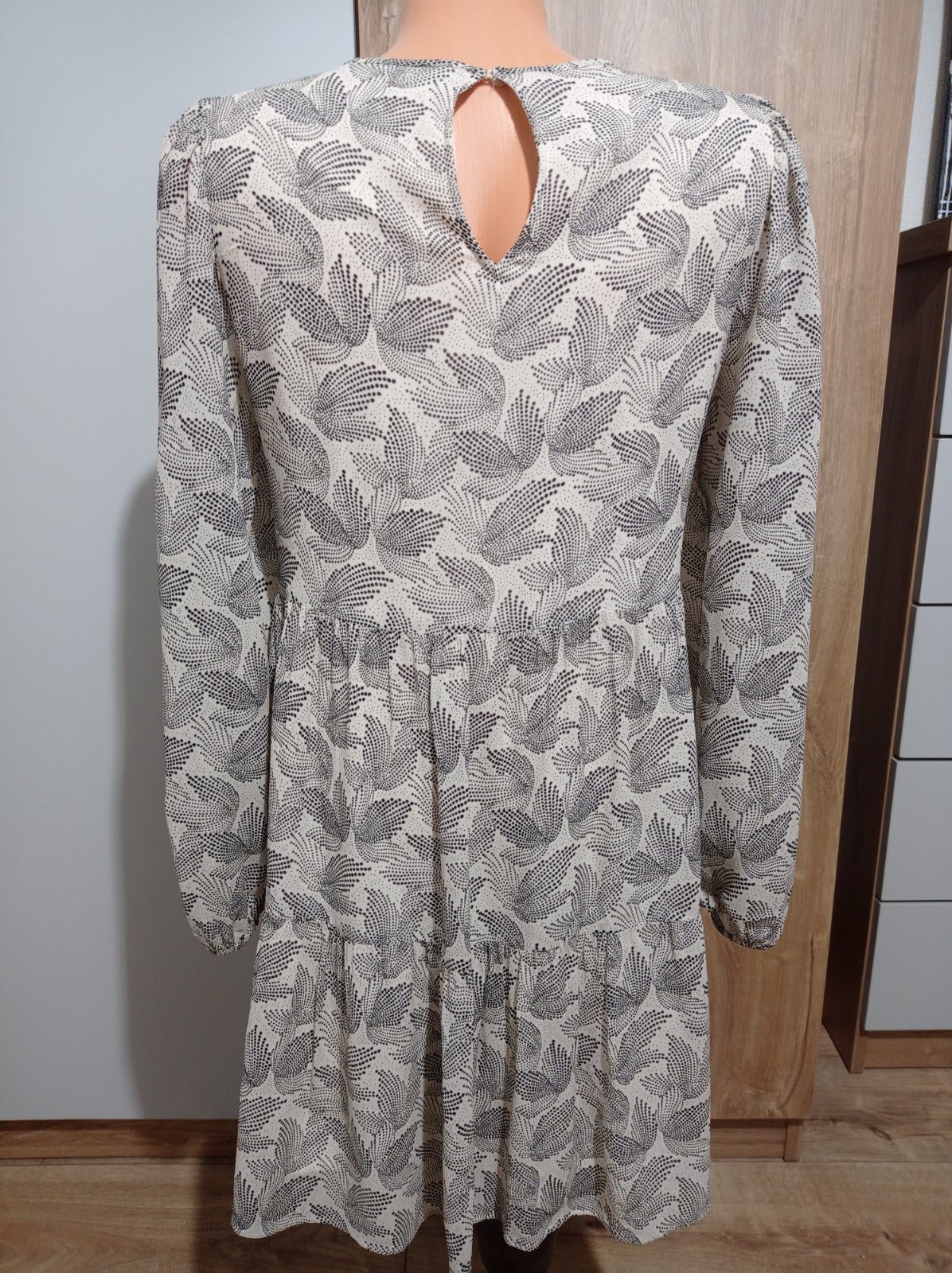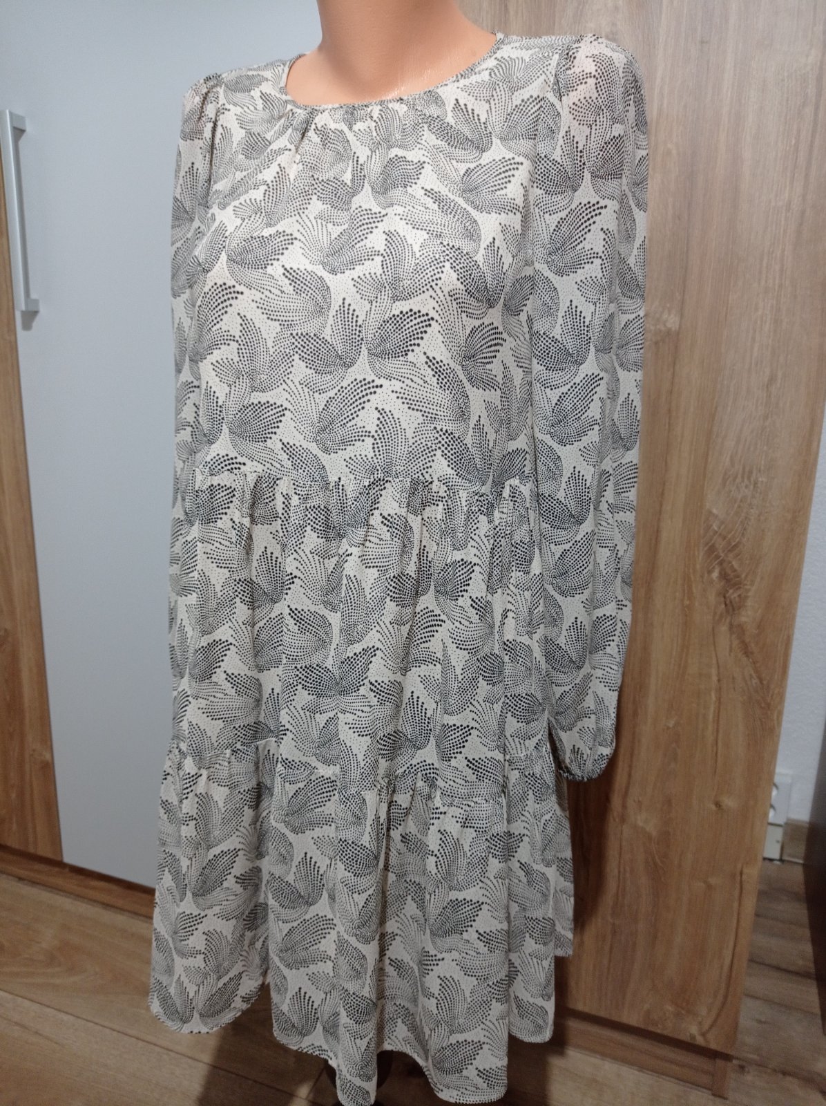 Šaty sú vo výbornom stave, z príjemného materiálu, sú celé podšite, majú zaujímavý vzor. Rukávy nie sú podšité a ukončené do gumičky. Sú voľného strihu, super vyzerajú oblečené. Využiteľné po celý rok. Veľkosť 36, šírka pod pazuchami 47 cm x 2, dĺžka 87 cm.