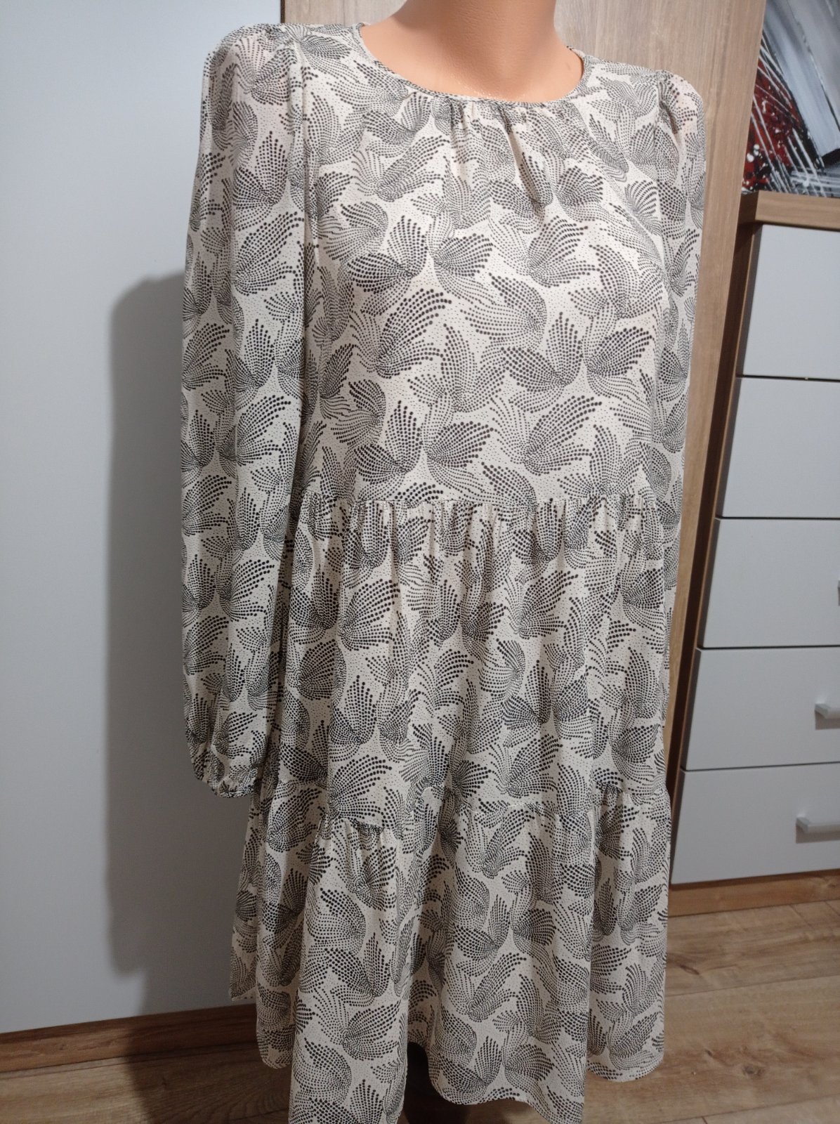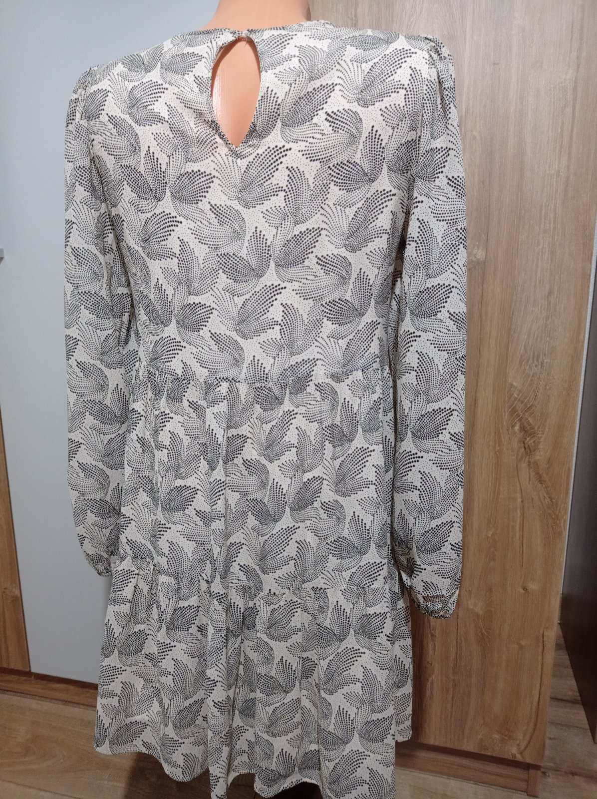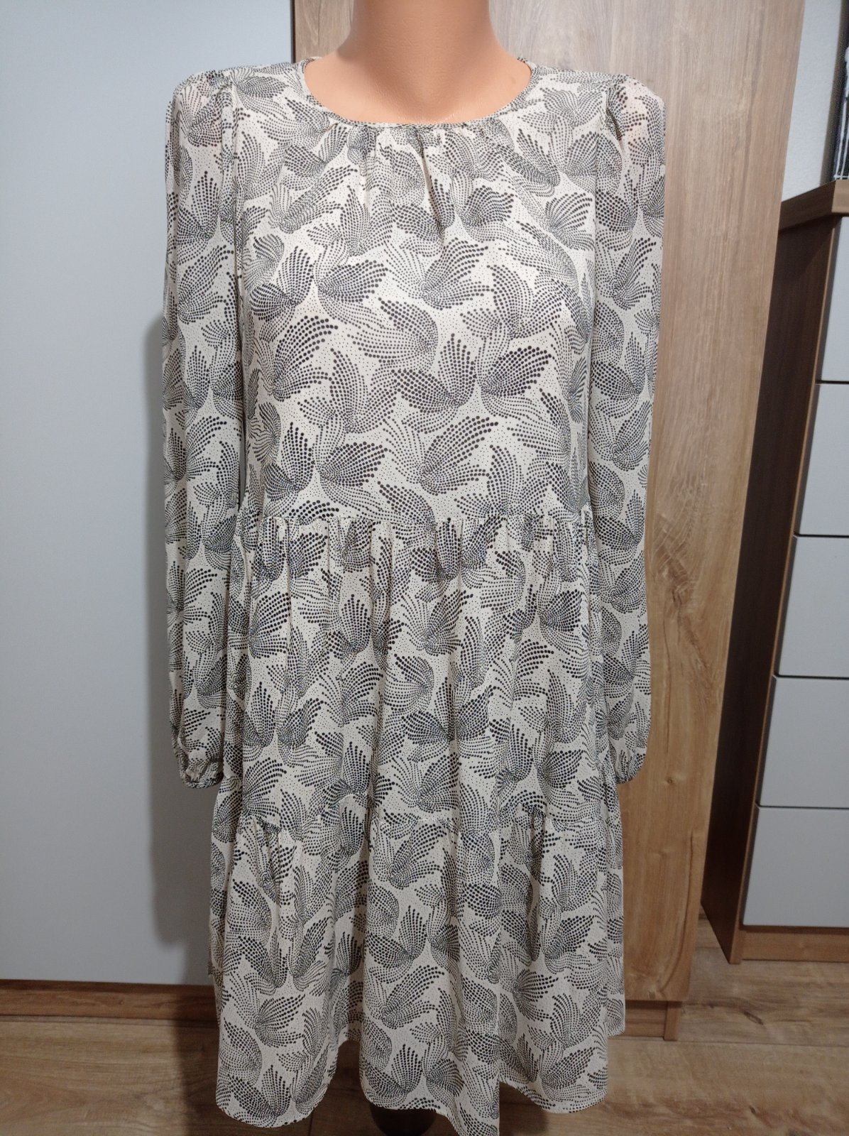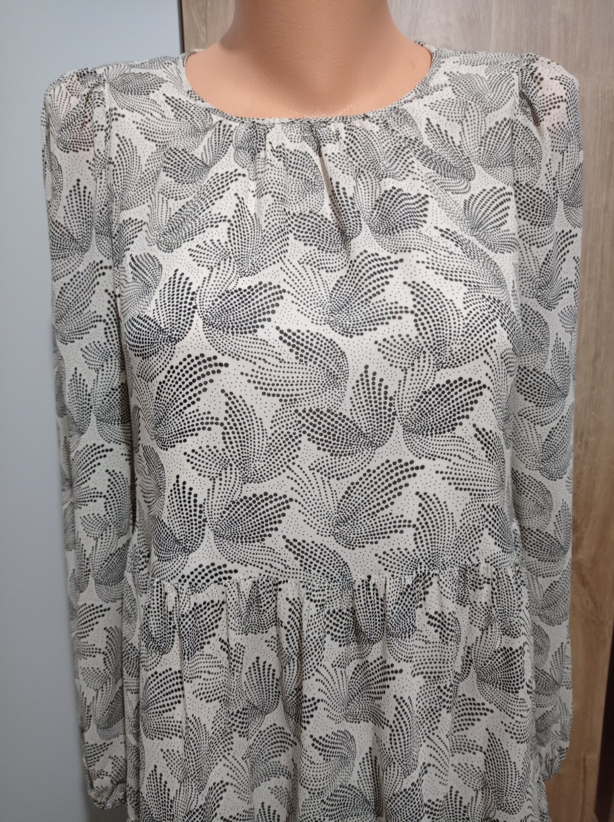 Šaty sú vo výbornom stave, z príjemného materiálu, sú celé podšite, majú zaujímavý vzor. Rukávy nie sú podšité a ukončené do gumičky. Sú voľného strihu, super vyzerajú oblečené. Využiteľné po celý rok. Veľkosť 36, šírka pod pazuchami 47 cm x 2, dĺžka 87 cm.