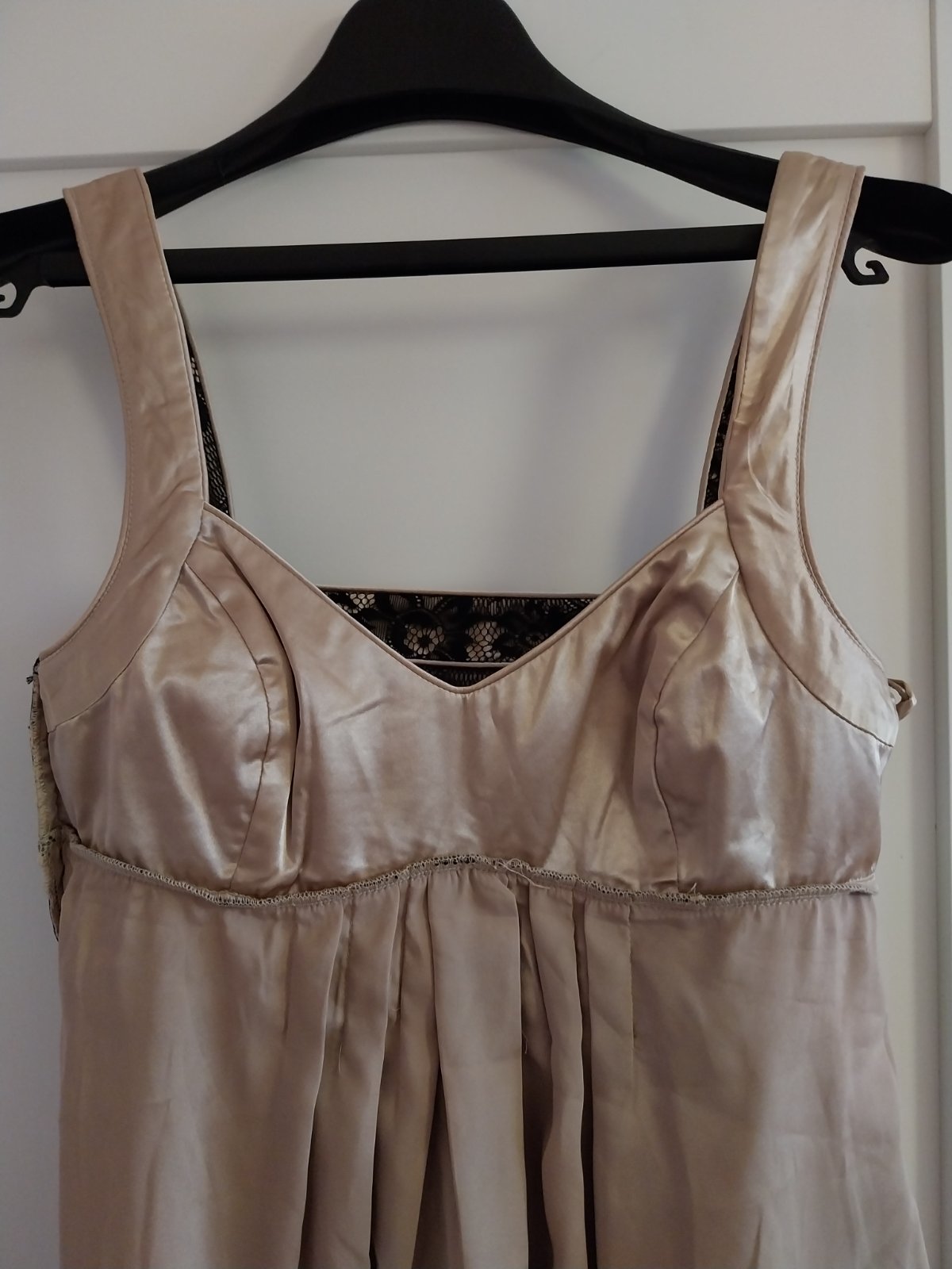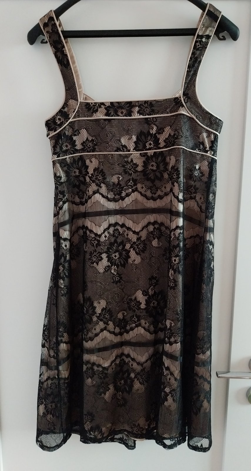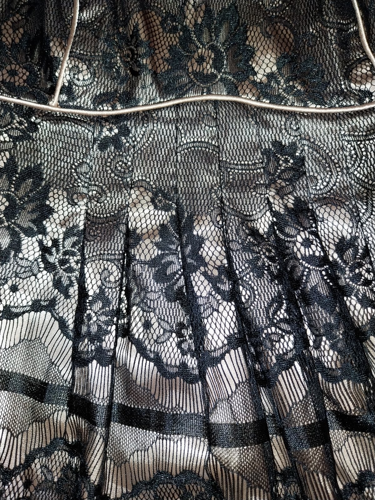 Vrchná časť z čiernej, kvetinovej čipky, ktorá je kvalitne podšitá saténom kontrastnej farby. Cez prsia hrubšie podšitė. Zapínanie na boku na zips a háčik. Voľne položené šaty cez prsia 38cm, pás 40 cm. Dĺžka od pliec 97 cm. Pri výške 170cm siahali ku kolenám.