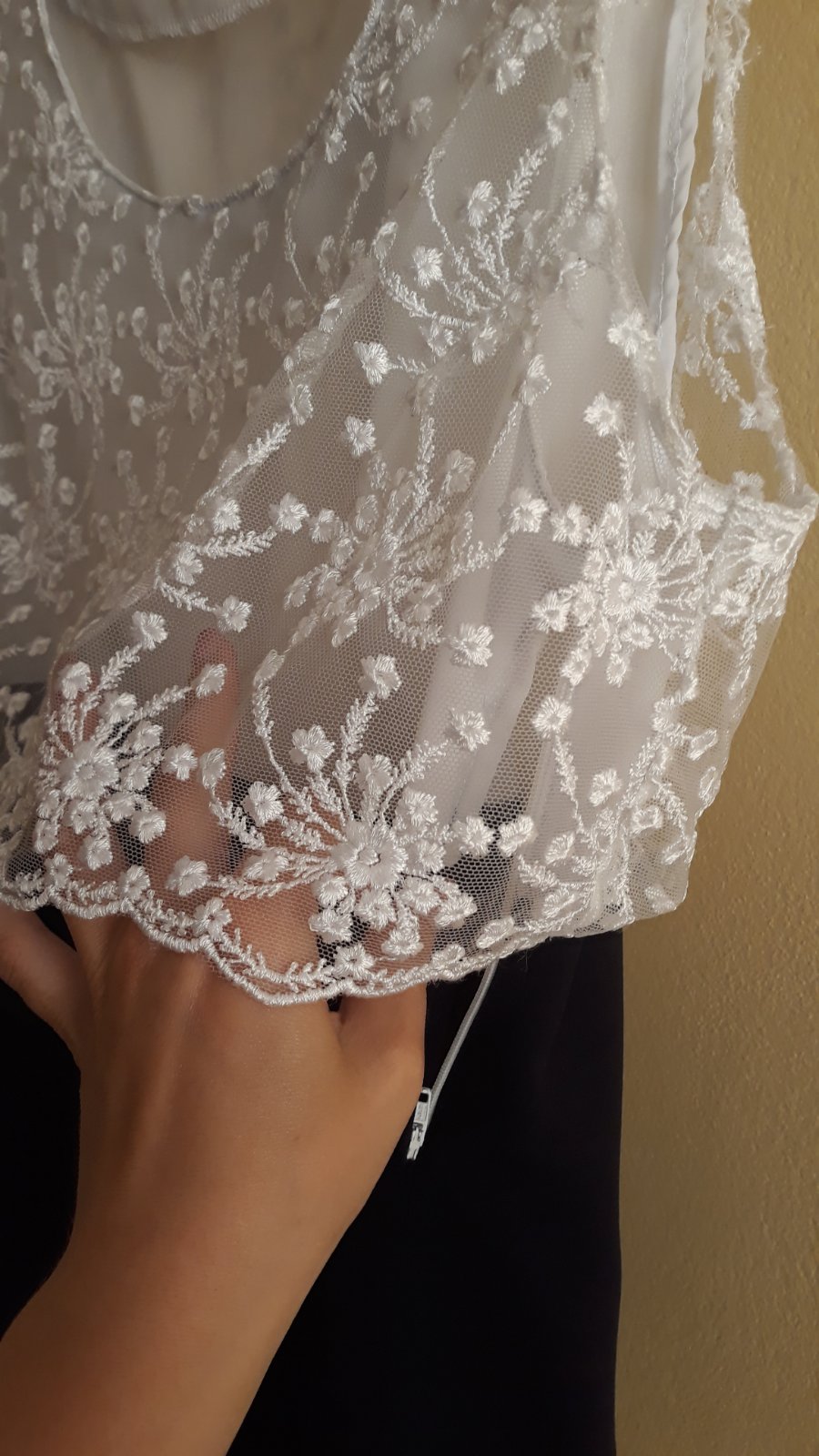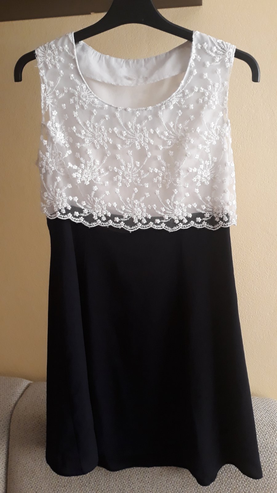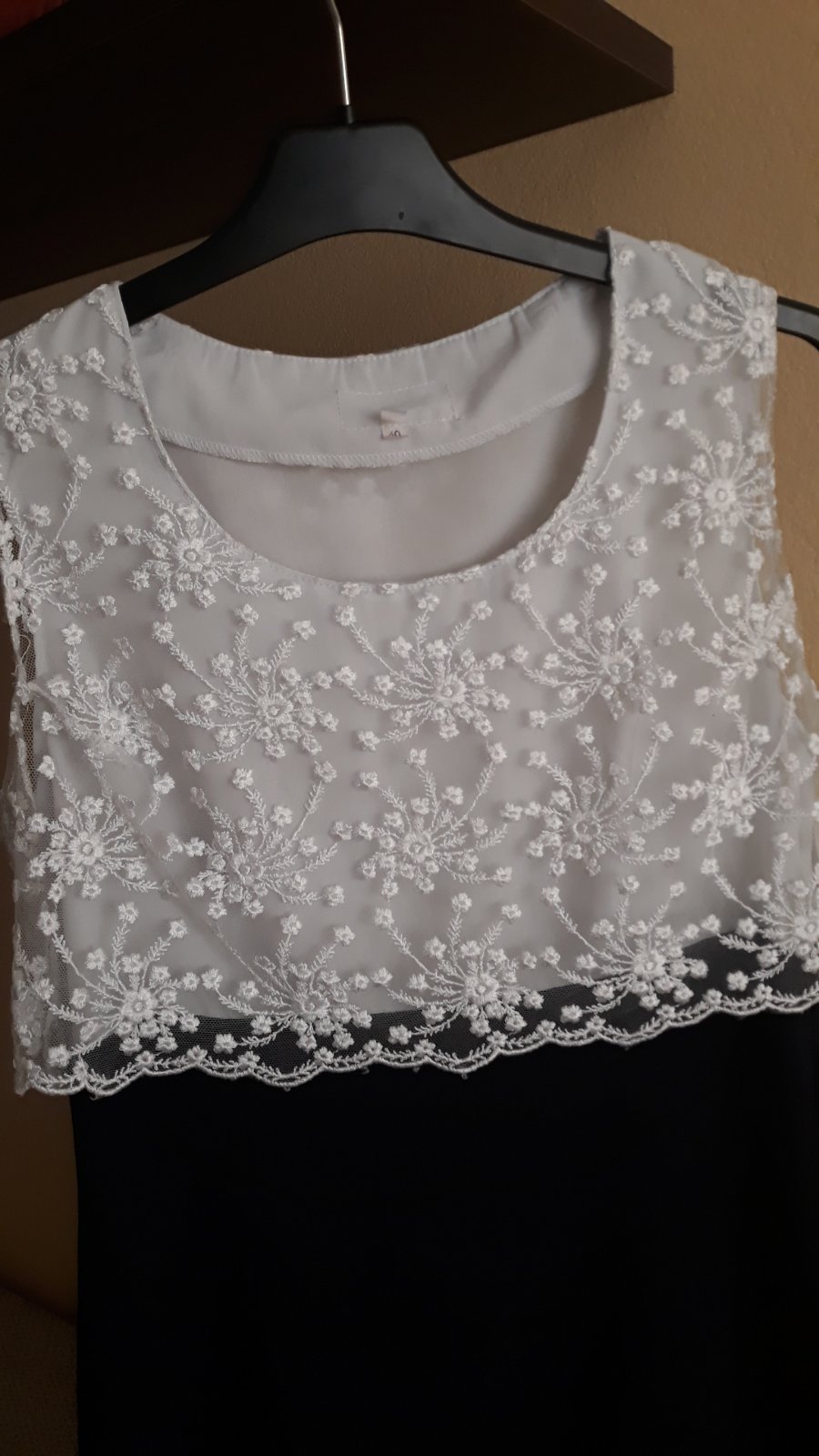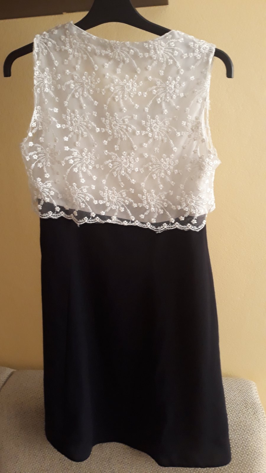 Rozkošné elegantné šatičky s čipkou. Material 100% polyester. Strih do Áčka, pod prsiami prestrihnuté. Okolo ramien sú upravované, zapínanie na zips na boku (17cm). Veľkosť zodpovedá približne XS-S. Rozmery: obvod hrude:45cmx2, dĺžka čipkovej časti (od pleca nadol): 33cm, pás: 42cmx2, šírka sukne (dolný okraj): 70cmx2, šírka okolo ramien: 46 cm, dĺžka šiat: 84 cm (meraný zadný diel od krku).