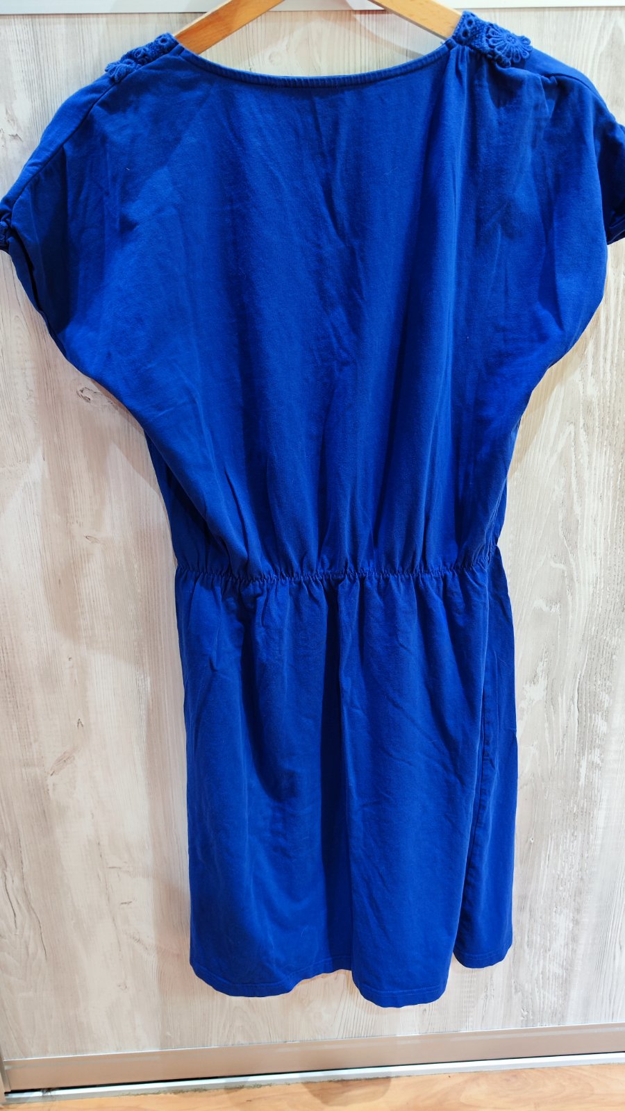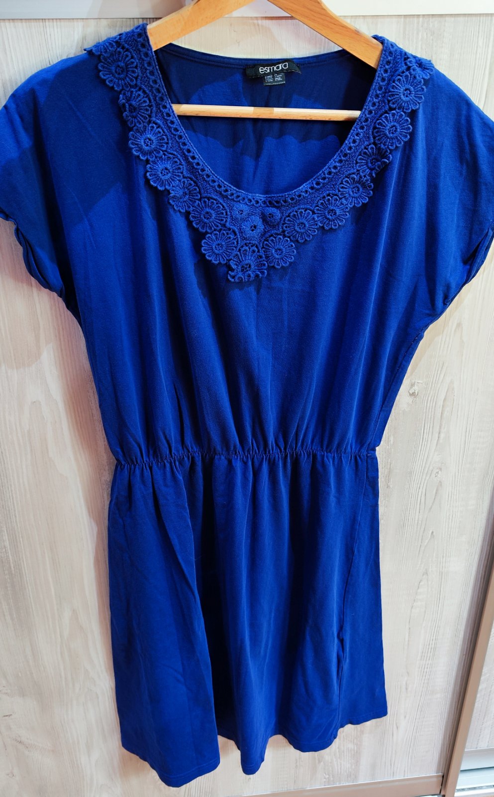 Krásne modré šaty s čipkou na výstrihu, veľkosť písaná S. Dĺžka šiat je 94 cm. Naživo sú trošku tmavšie. Cena + poštovné prevodom alebo osobne v Ba.