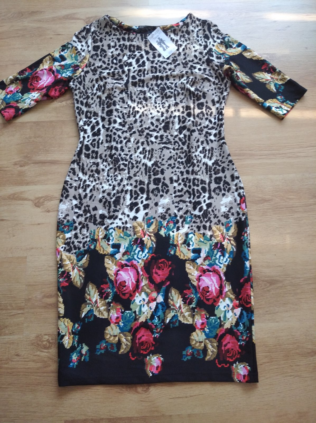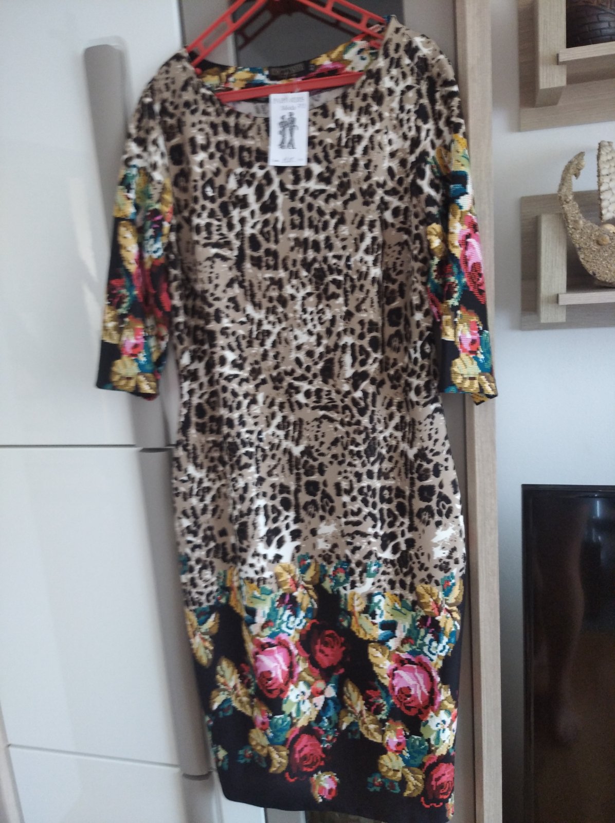 Perfektné šaty z polyesteru a elastanu! Dĺžka - 103 cm, šírka pod pazuchami vrchnej časti - 2x 62 cm, pás - 2x 44/54 cm, boky - 2x 50/60 cm, rukáv od krku - 60 cm. Veľk. 44, ale kľudne od 42.
