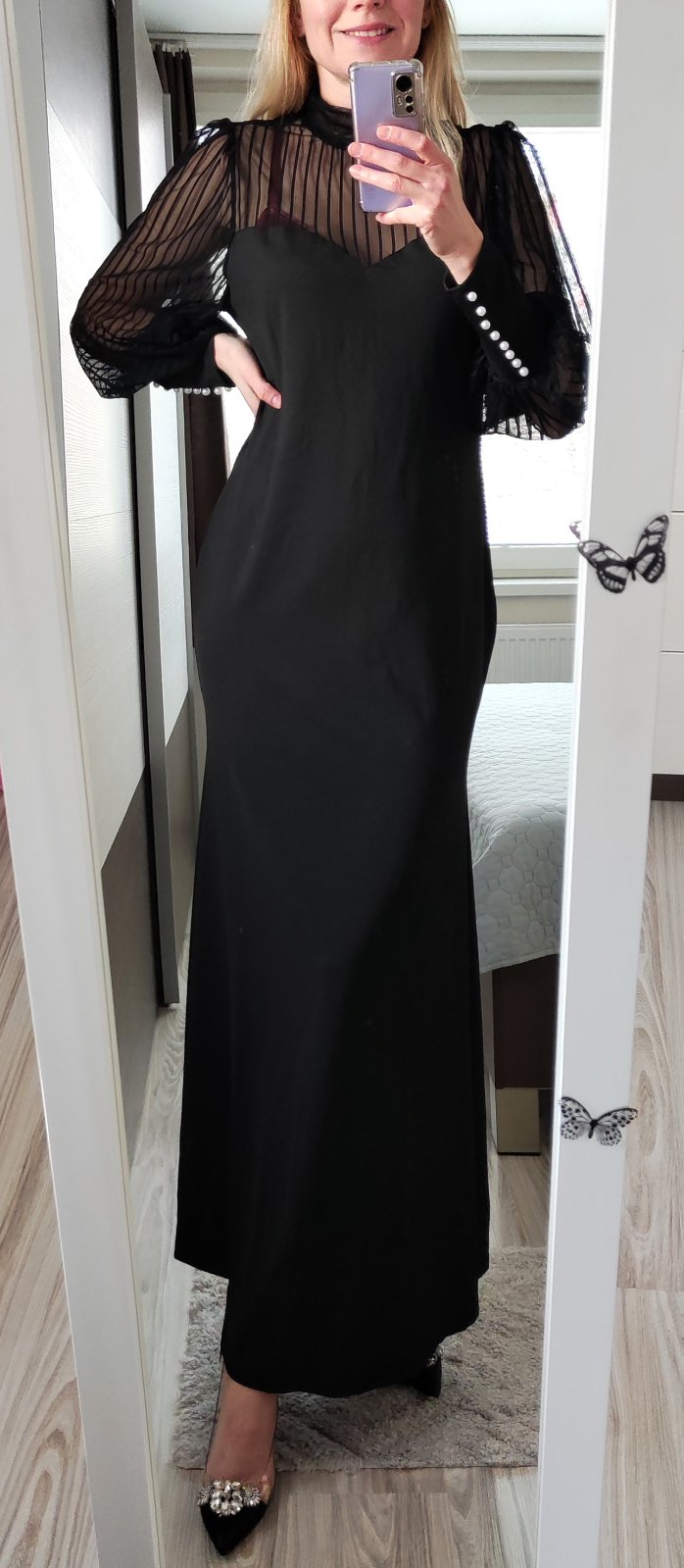 Nadherne luxusne saty ani raz oblecene, velmi prijemny materail, ziadne pichanie, rezanie. Koniec rukavov nafuknute balonove, uvazovanie na opasok, takze na akukolvek postavu, vpredu kratsie, vzadu...