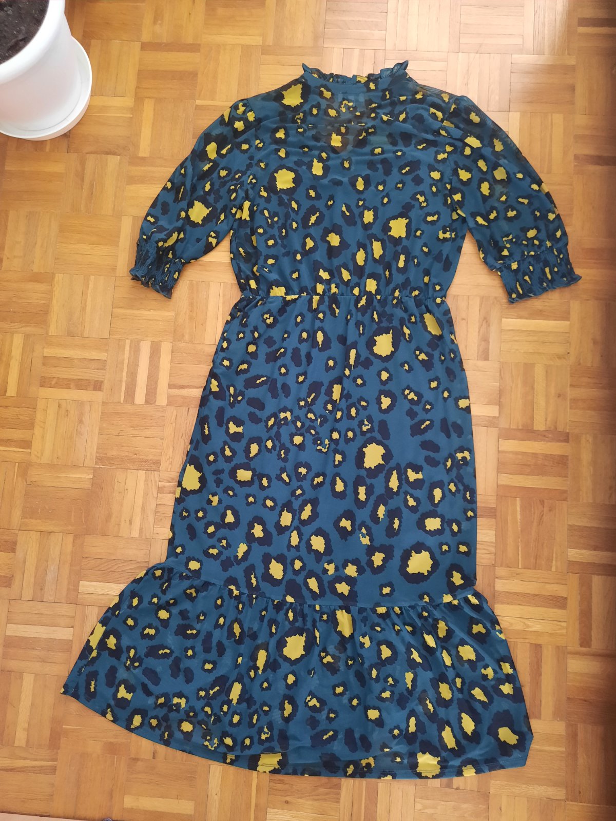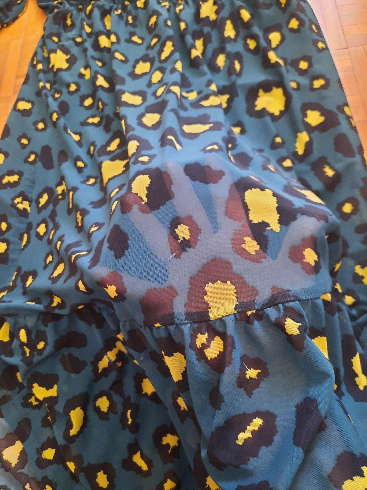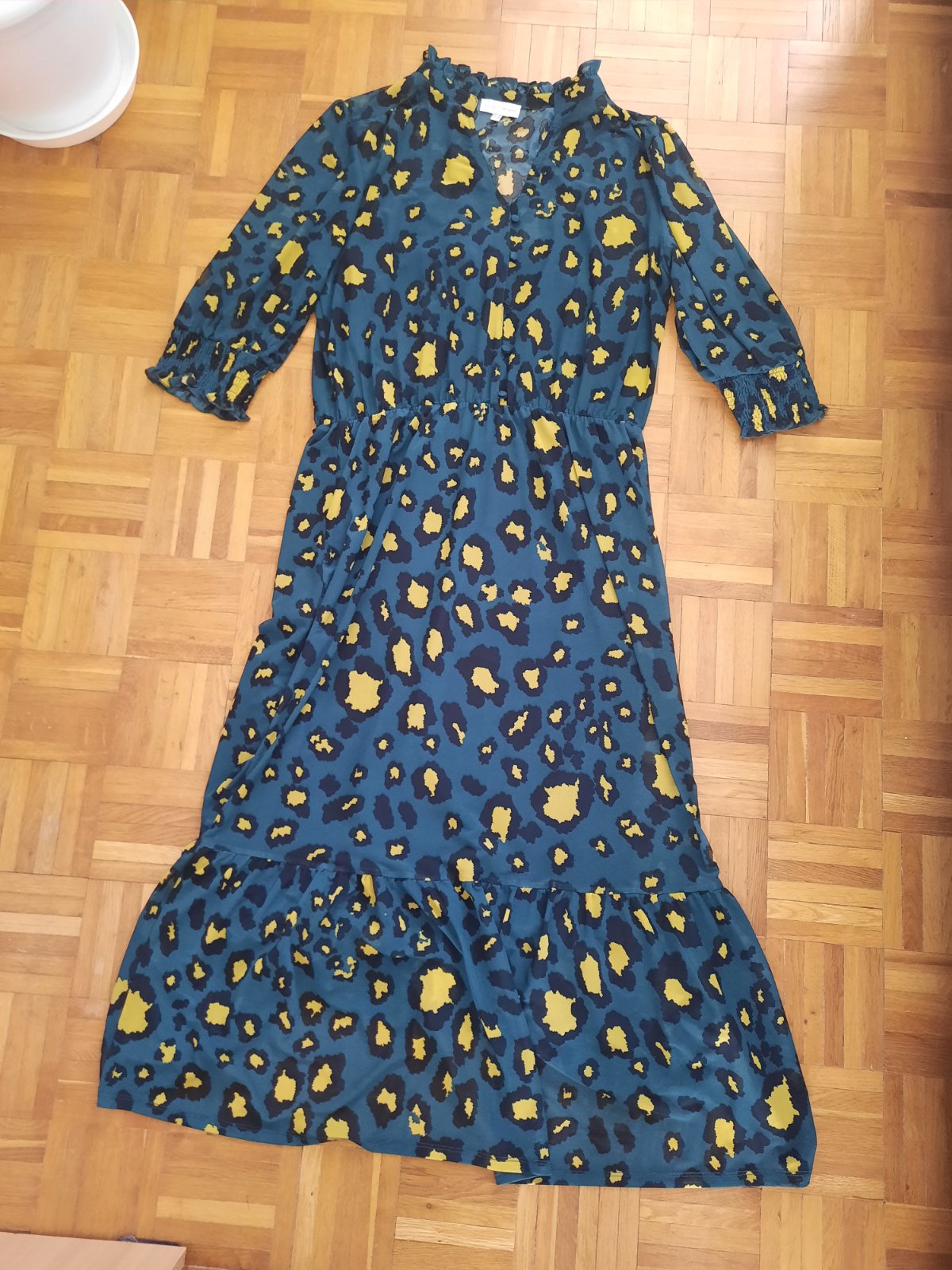 Krásne dlhé dámske šaty, nekrčivý materiál. Na spodku je volán. Sú celé podšité. Rukávy sú 3/4 a nariasené gumkou vo viacerých radoch.