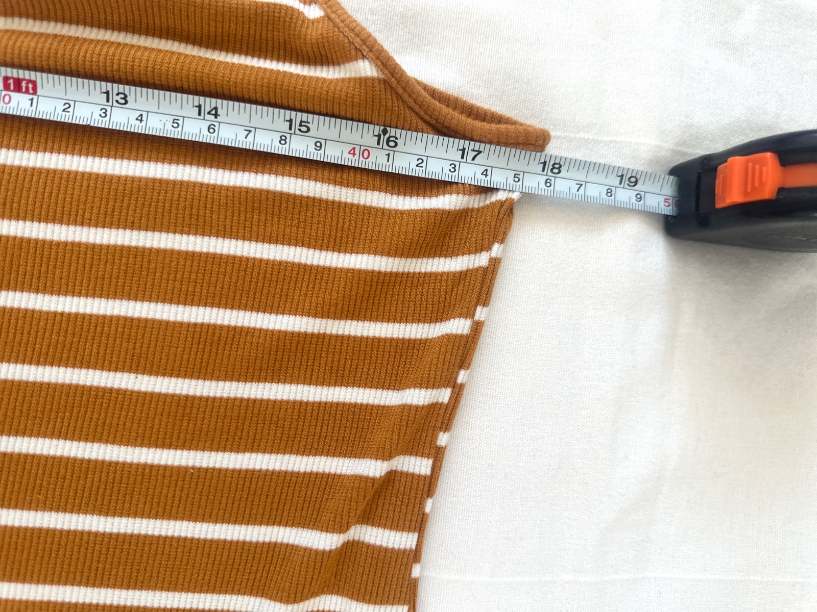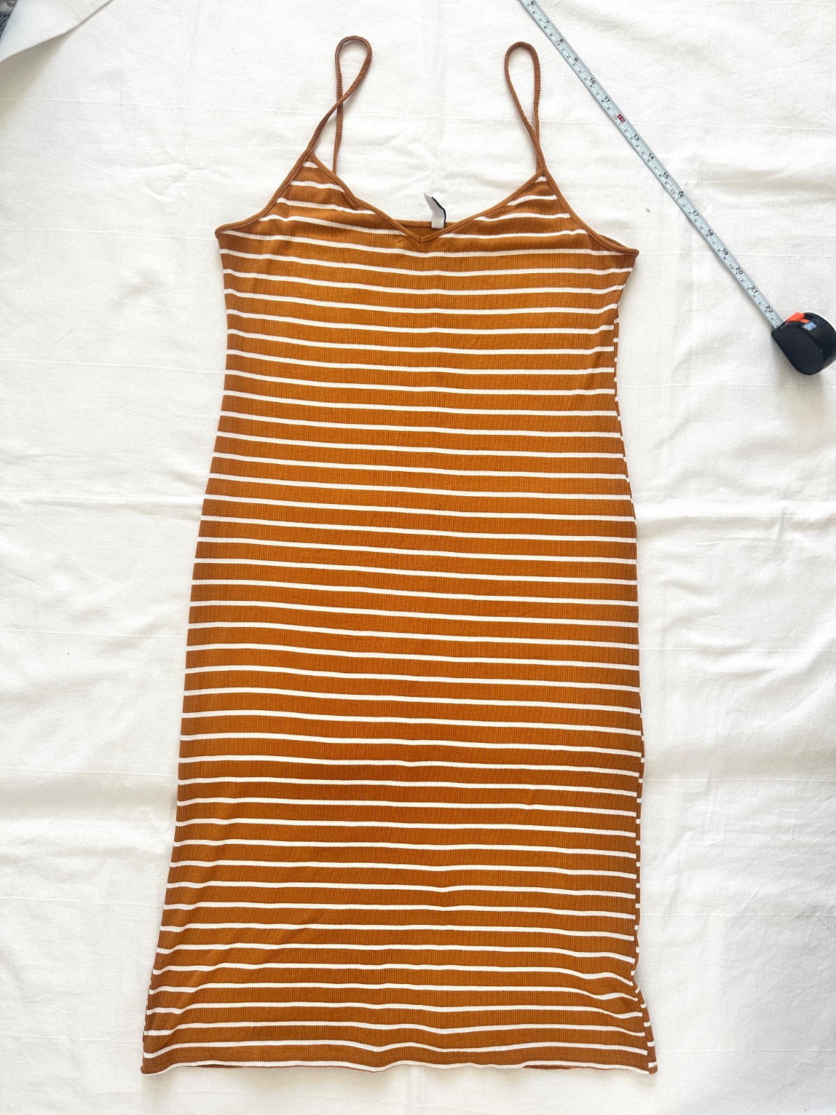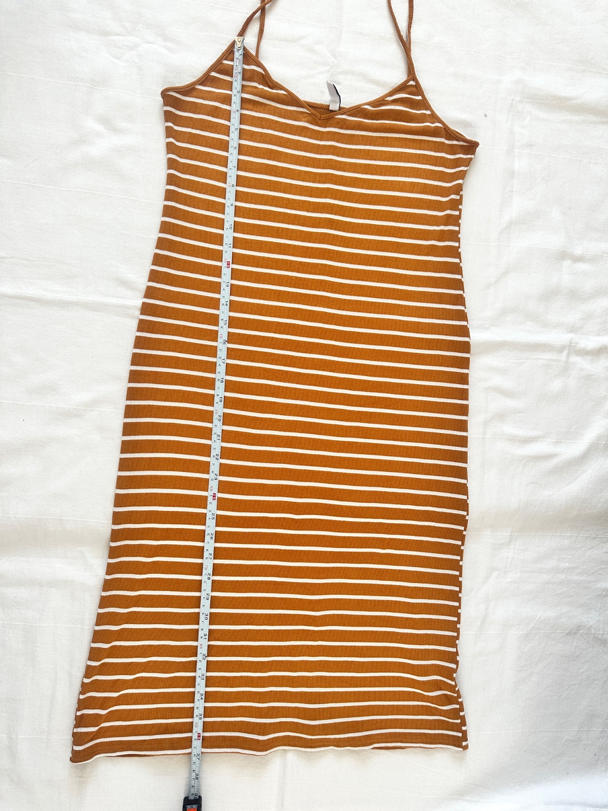 Jednoduché viskózové šaty horčicovej farby s jemnými bielymi vodorovnými pruhmi. Šaty majú úzke ramienka a výstrih do V, ktorý krásne zvýrazňuje dekolt. Majú midi dĺžku a rozparok vzadu. Materiál je 94 % viskózy. Veľkosť na etikete je L. Všetky miery sú na fotografiách.