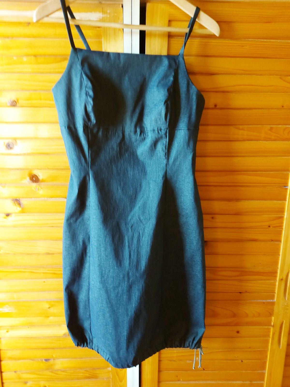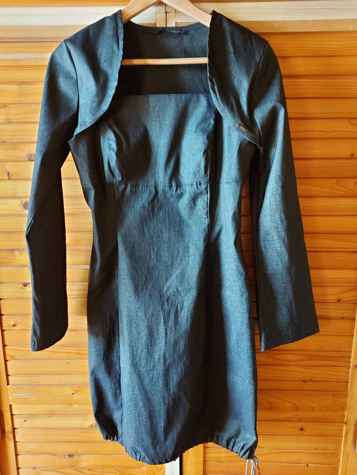 Šaty s bolerkom AXARA PARIS,S,M, na ramienka, na spodu na zaviazanie šnúrkou-viď foto, š. pod prsiami 37, boky 41, celková dĺžka bez ramienok 77, vzadu zips, elastický materiál, bolerko-celková dĺžka zadného dielu 26,5, bez zapínania, rukávy na konci mierne rozšírené