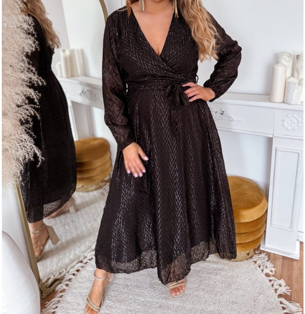 Elegantné dlhé šaty s dlhým rukávom majú elastickú gumičku v páse a voľnú sukňu. Šaty sú nové s výsačkou. Veľkosť L/XL- prsia 105-118 cm, pás 75-100 cm, boky voľné, celková dĺžka 135 cm.