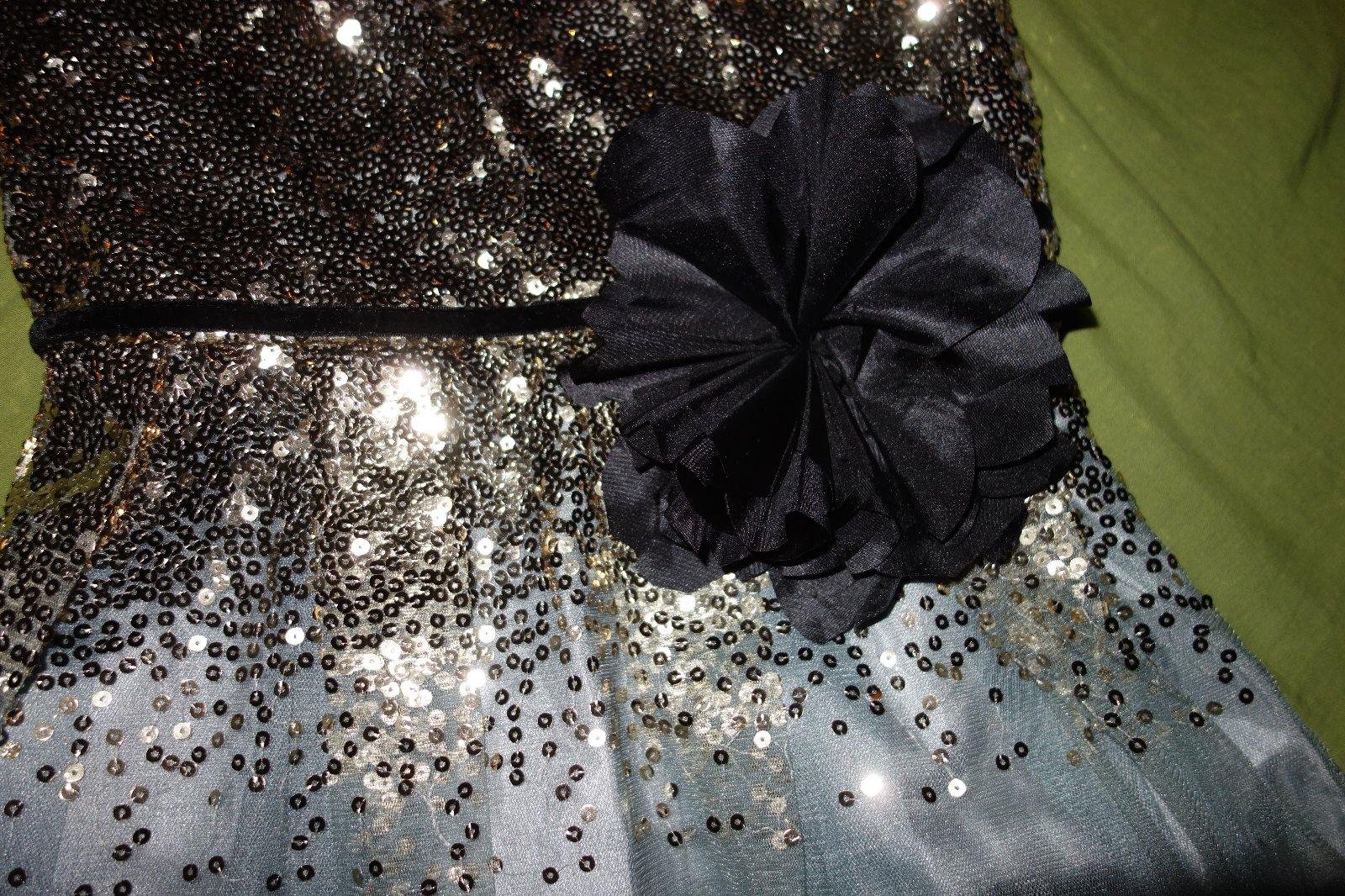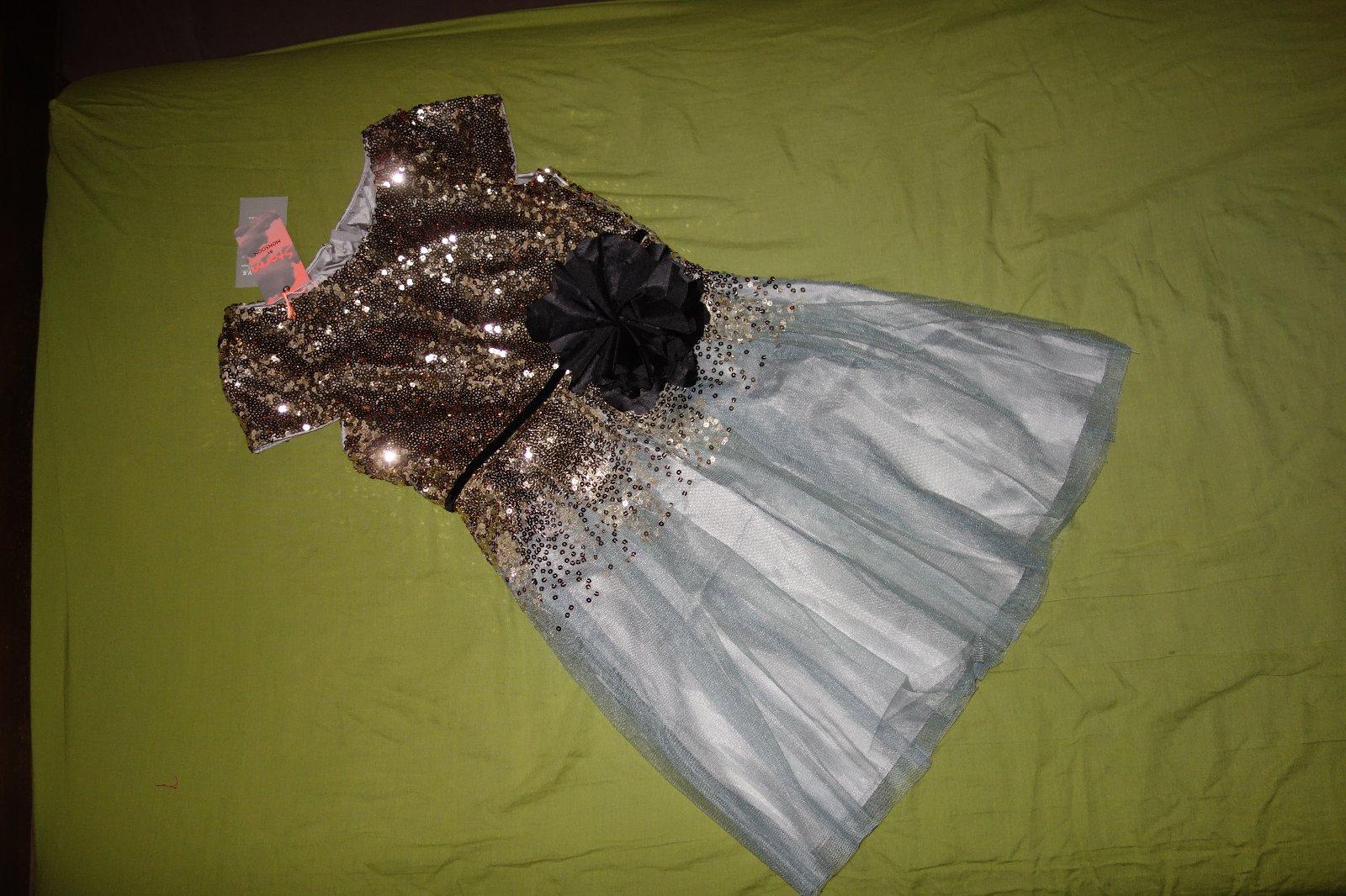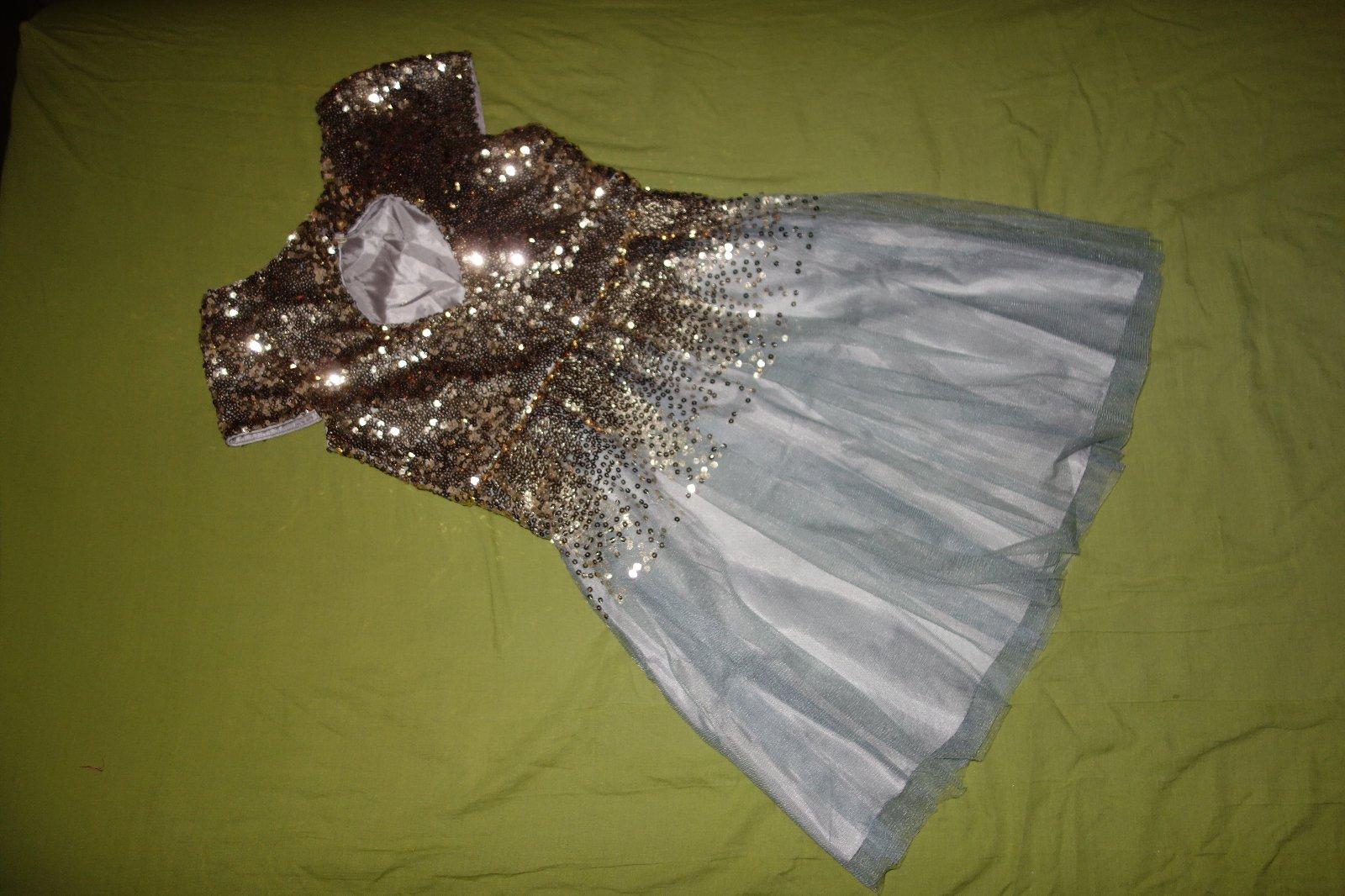 Nadherne sviatocne satocky- nove, s visackami. Vrch je cely zo zlatych flitrikov. Suknicka je svetloseda s nadychom do modra. Zboku maju zips.