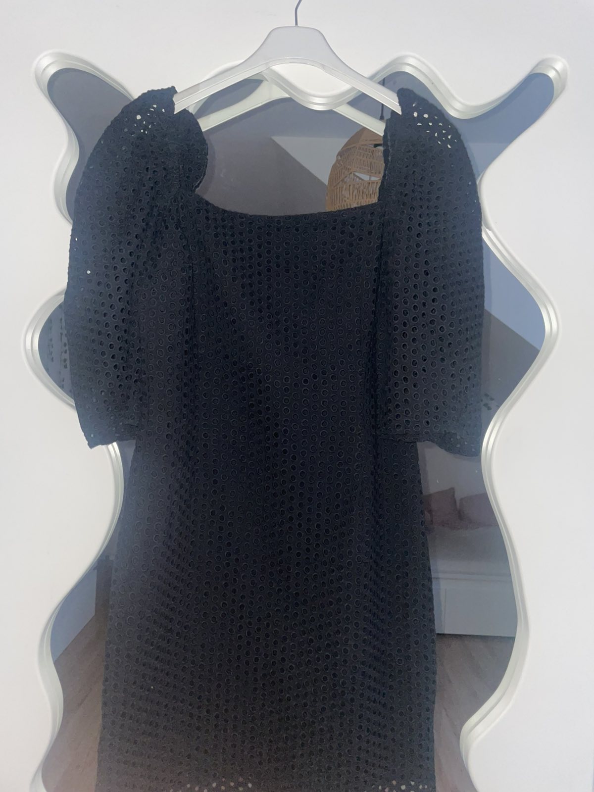 Nové bez visačky, čierne s výšivkou, podšité, veľkosť 38,ale určite sú menšie, šírka pod pazuchami 42 cm, dĺžka 83 cm