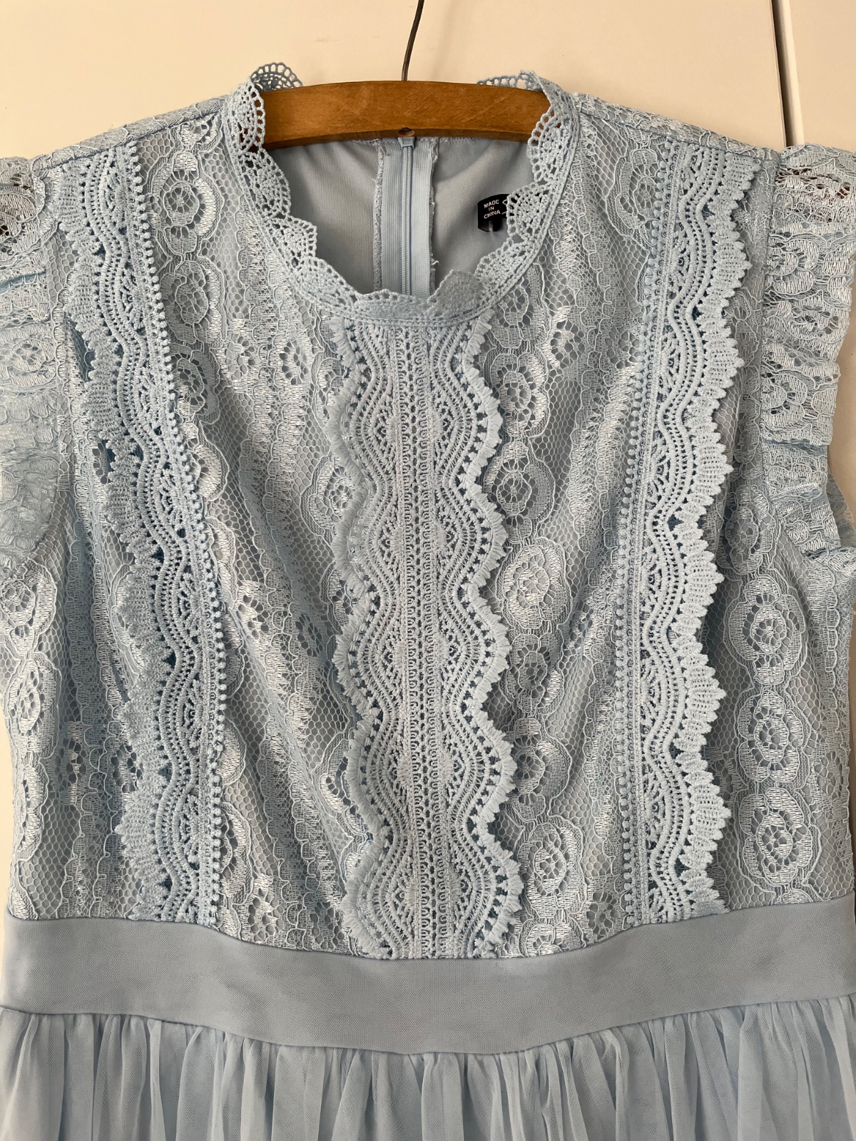 Ponúkam na predaj pekne svetlomodré šaty, oblečené 1x na svadbe. Pohodlné, štýlové. Celková dĺžka: 87 cm, pás 30 cm v kľude, je na gumičku, prispôsobí sa pekne.