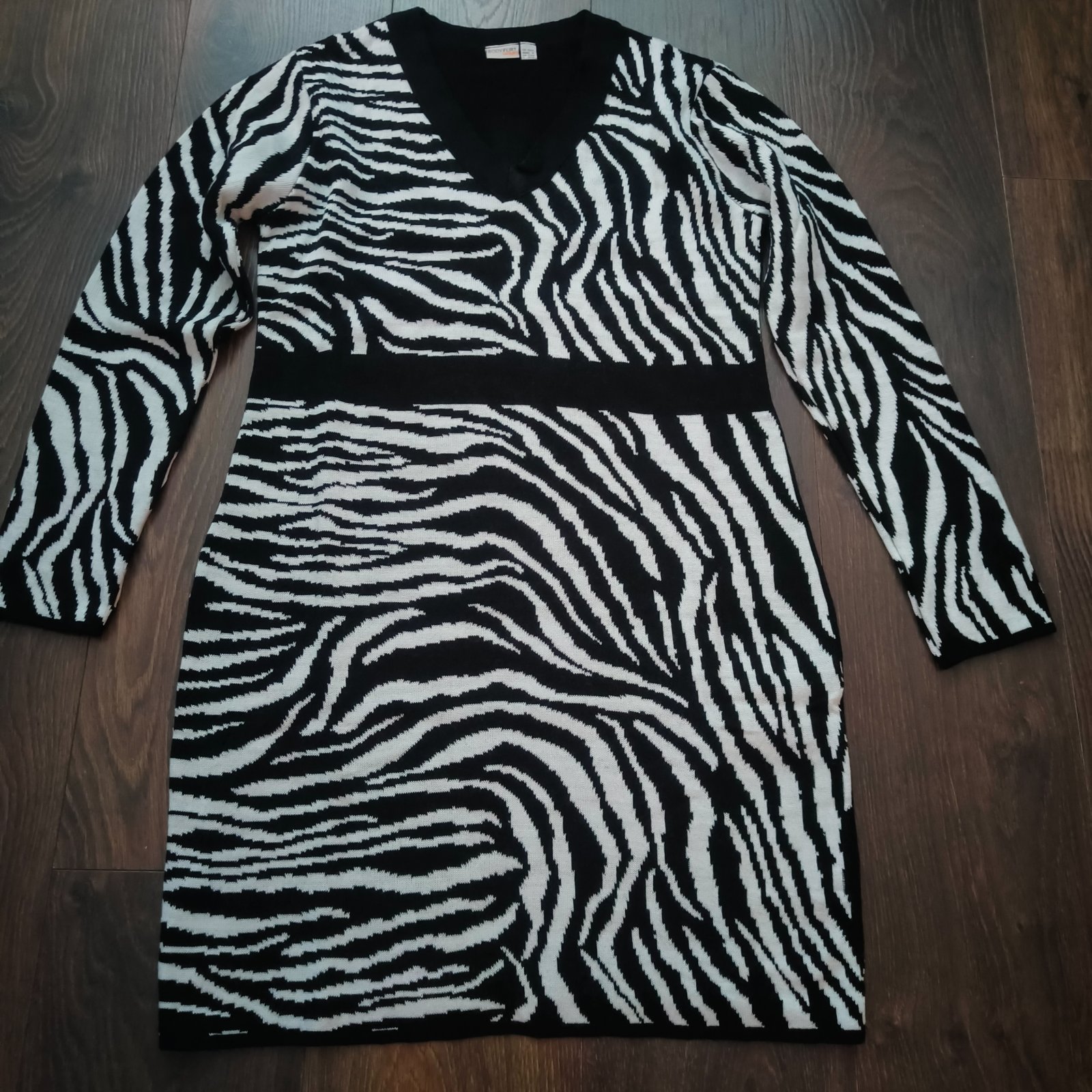 Pletene saty na bezne nosenie, na vrhnej casti vzor, ale nie je hrubsia ako dolna cast. Rukavy - cierna cast priliehava, saty su pri postave vysky 170cm dlne nad kolena. Od pasa je mierne rozsire s...