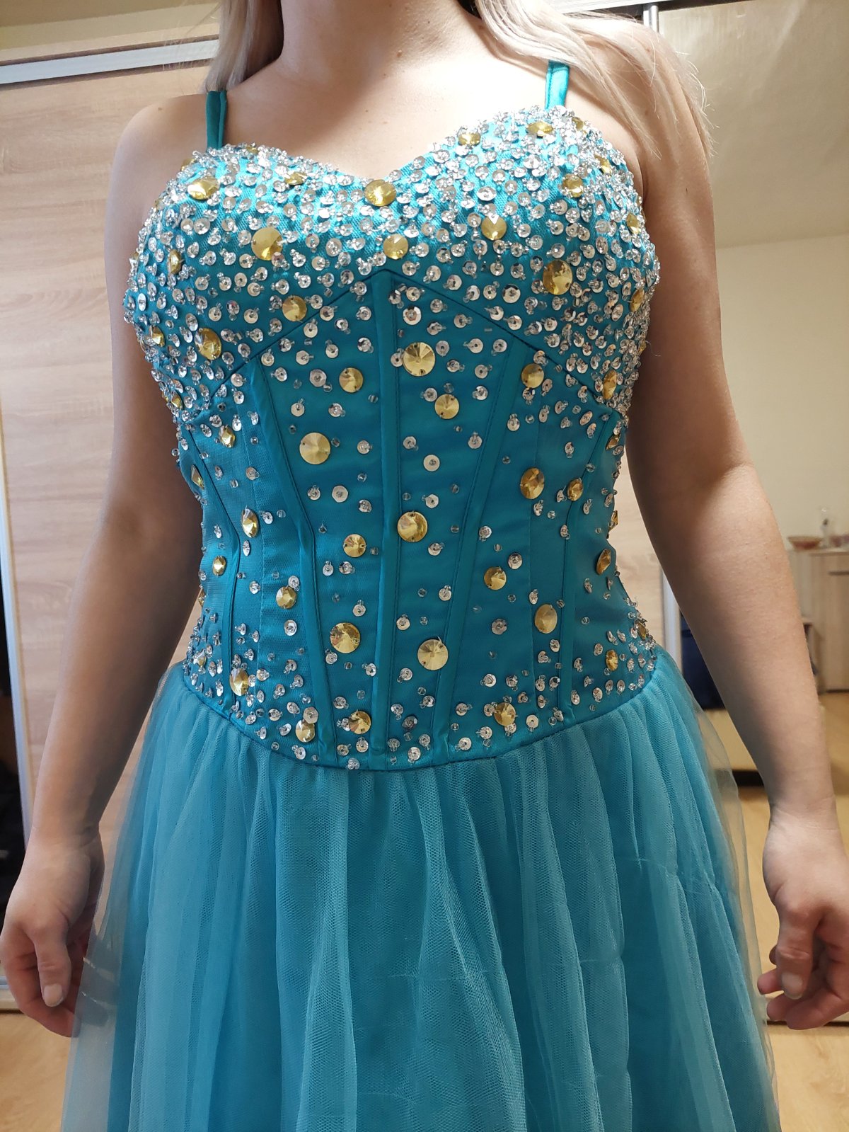 Šaty bez poškodení, vhodné na ples, svadbu, stužkovú, bál. Veľkosť sa prispôsobí, vzadu je šnurovačka, farba ako na hlavných fotkách