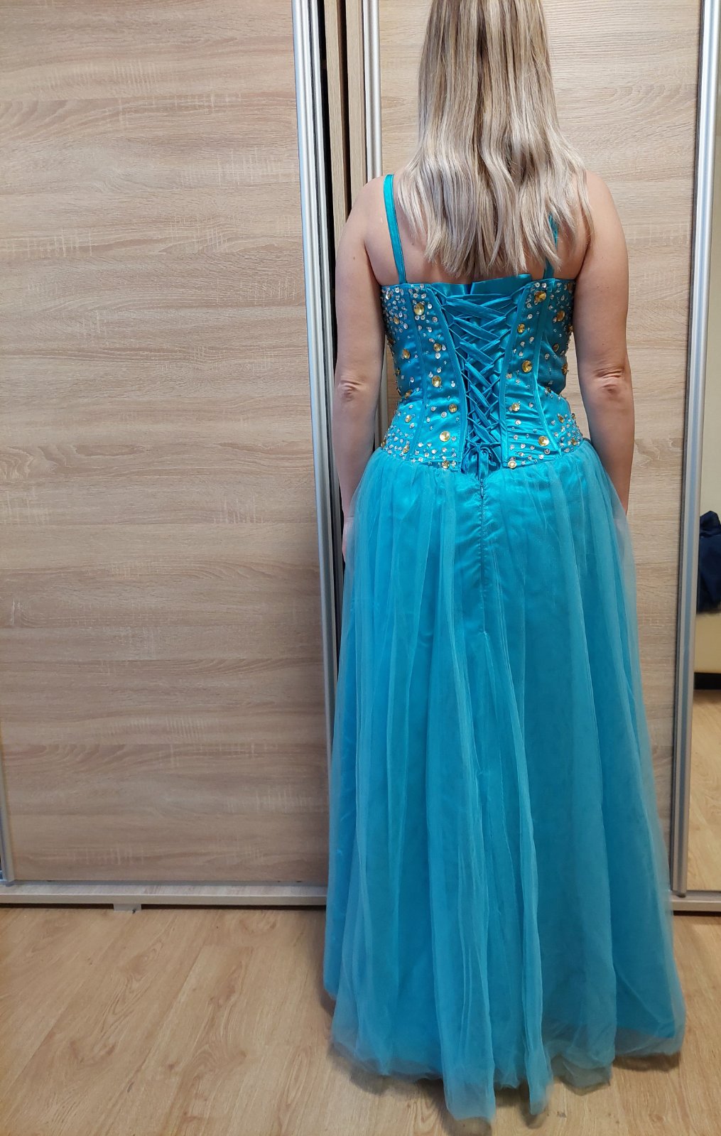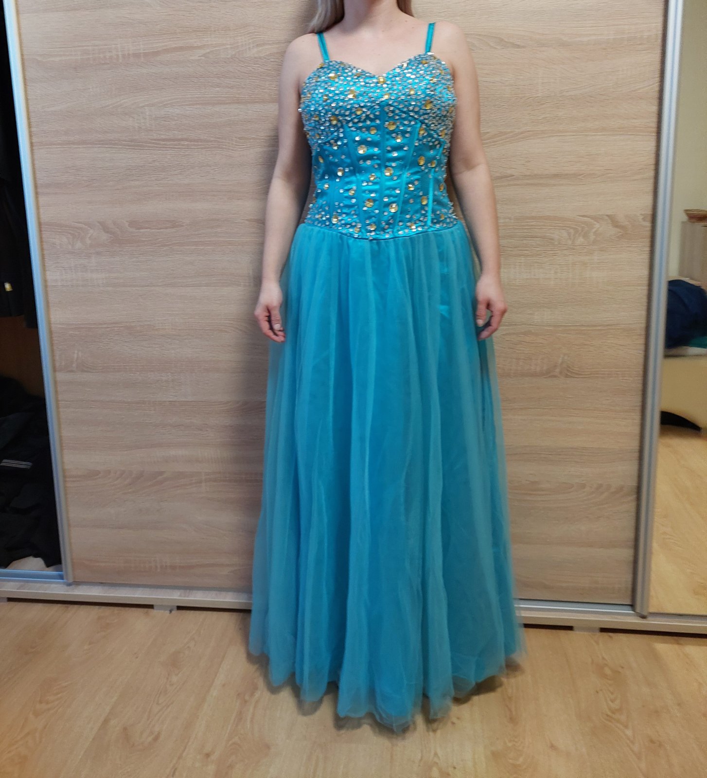 Bledomodré spoločenské šaty,zdobené s kamienkami. Oblečené 3x. Kupované dávnejšie,ale sú stále pekné. Cena symbolická.