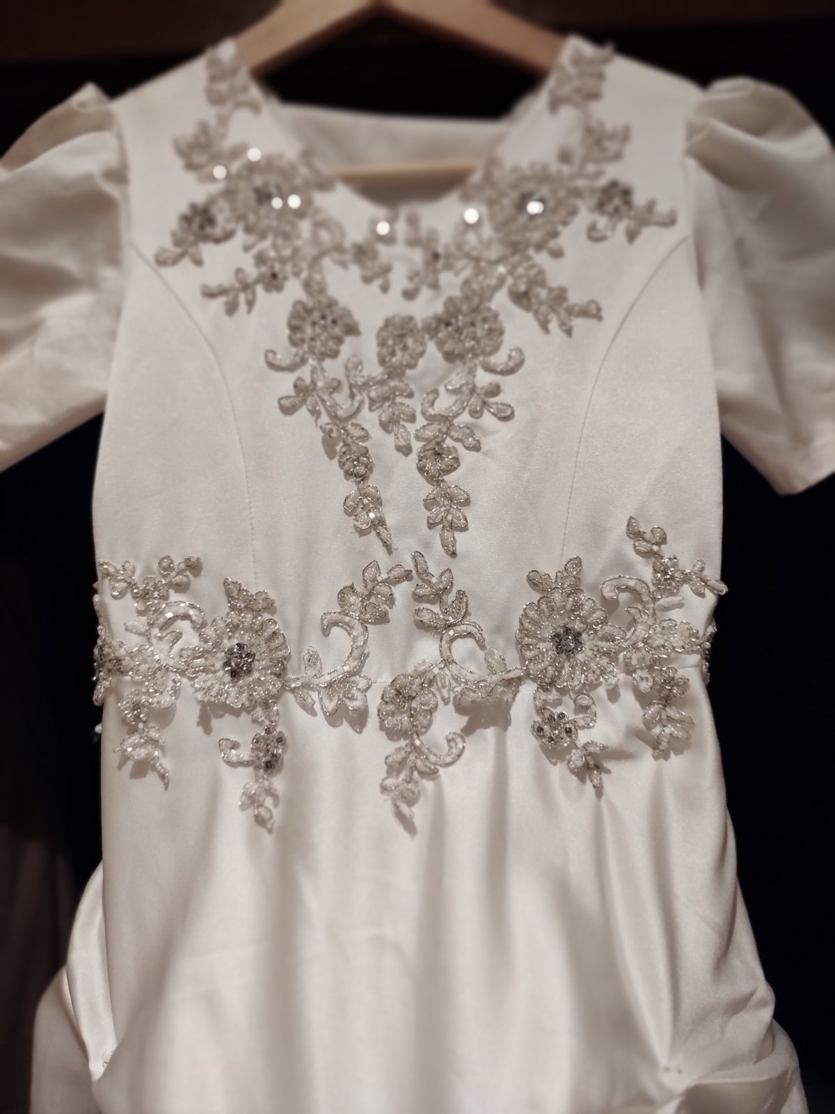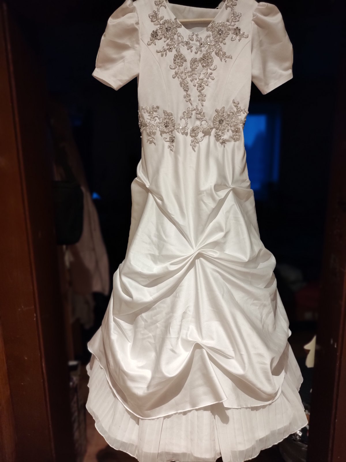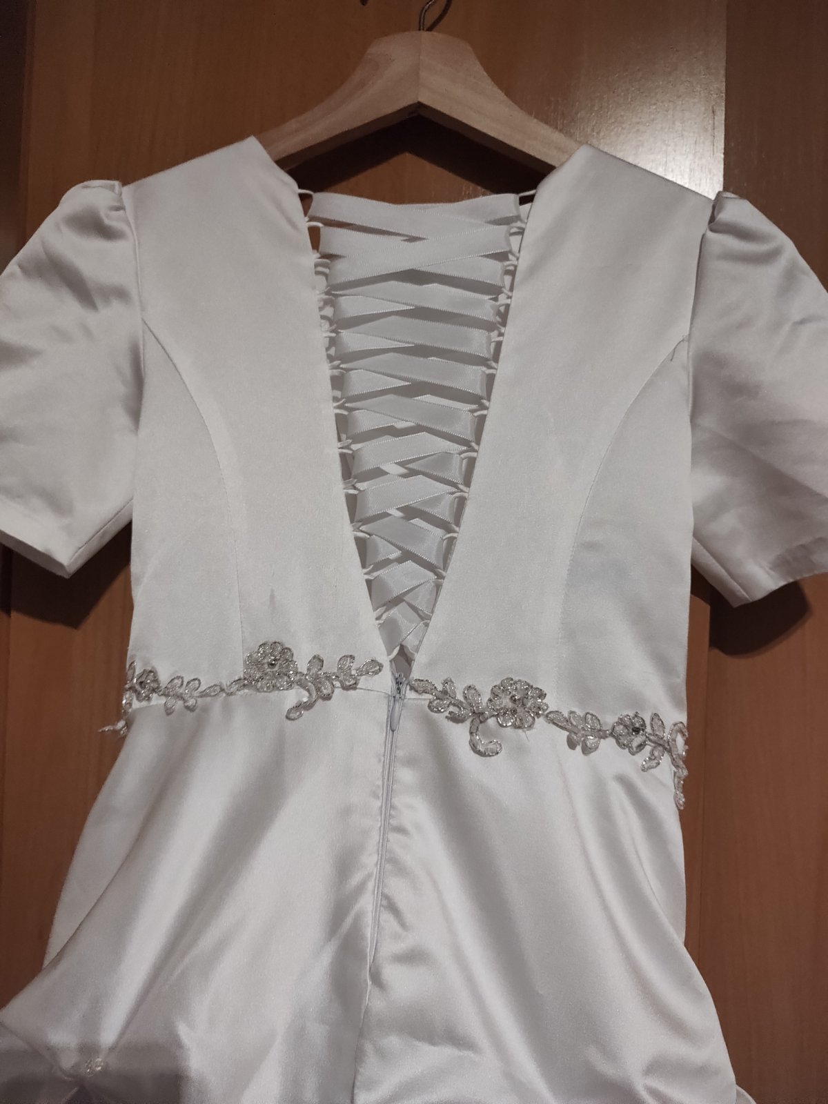 Krásne šaty, super stav. Integrovaný kruh, ktorý sa dá vybrať a šaty môžu byť aj bez kruhu. Päť vrstiev sukne, šaty sú na zips a šnurovanie, veľkosť 140/146. Kupované v svadobnom salone, vyčistené.