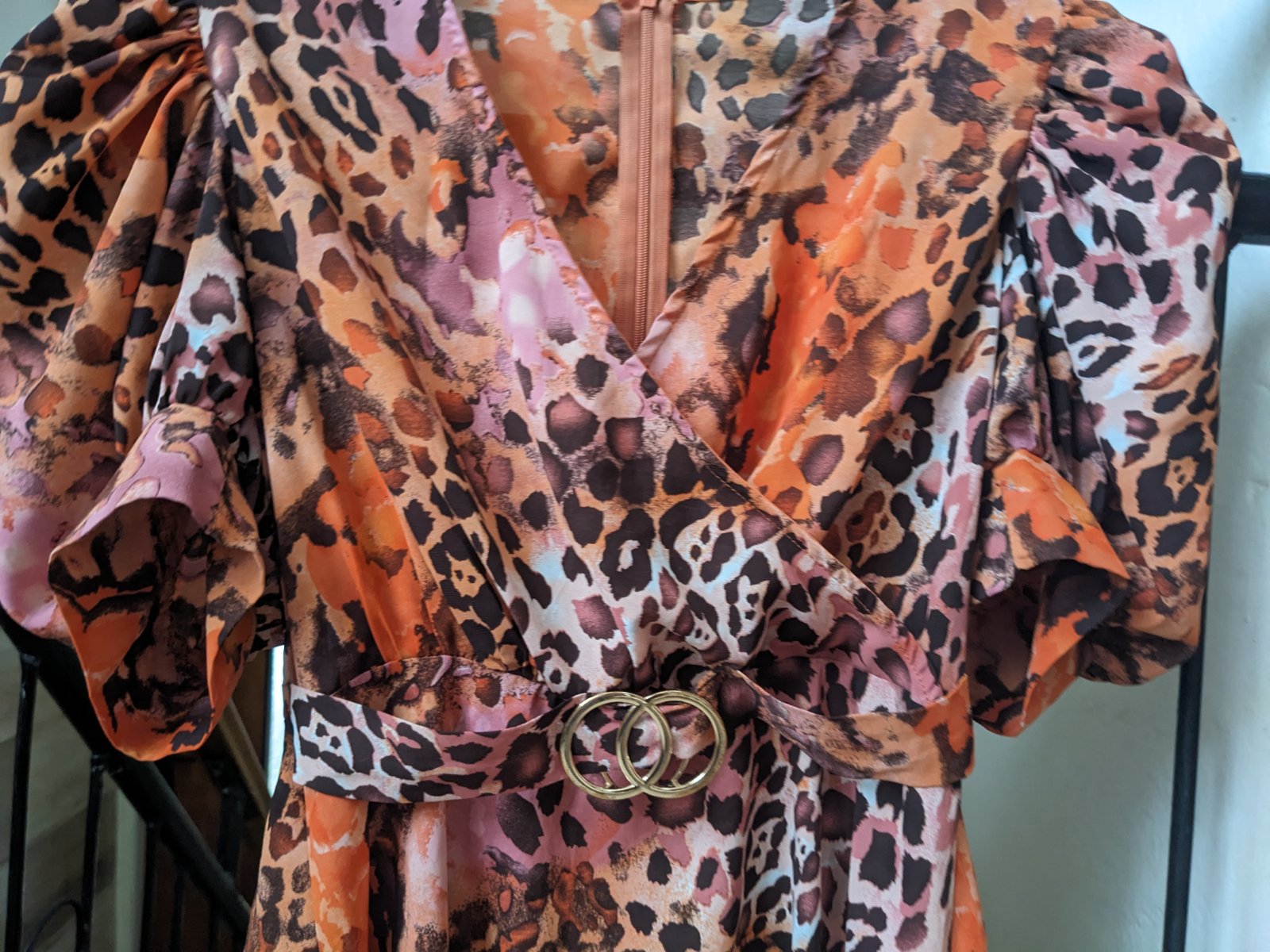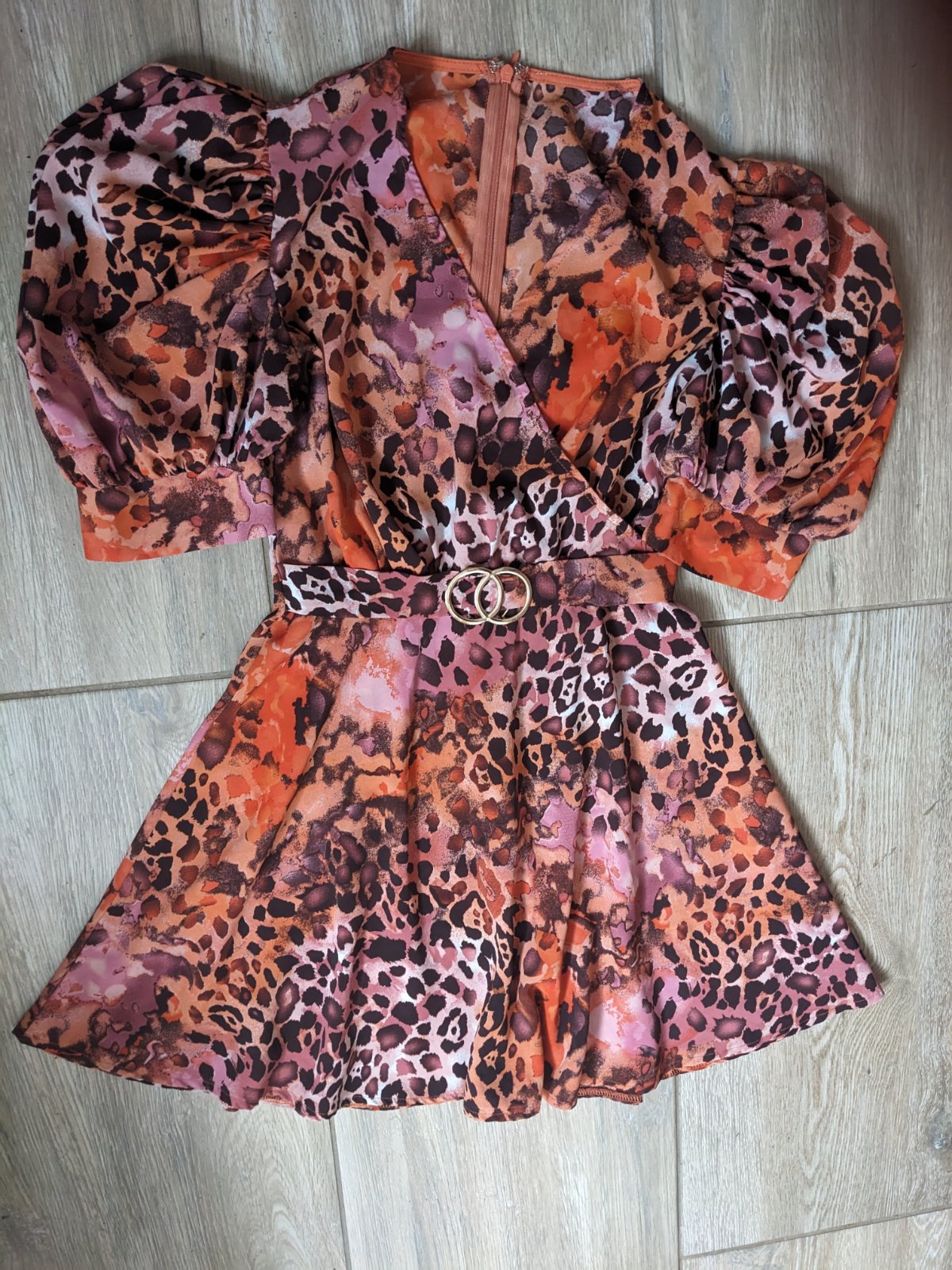 Oranžové šaty s viazaním okolo pásu. Môžu sa stiahnuť na šnúrku čím si zvýraznite pás. Vhodne na veľkosť S/M. Dĺžka je nad kolená.