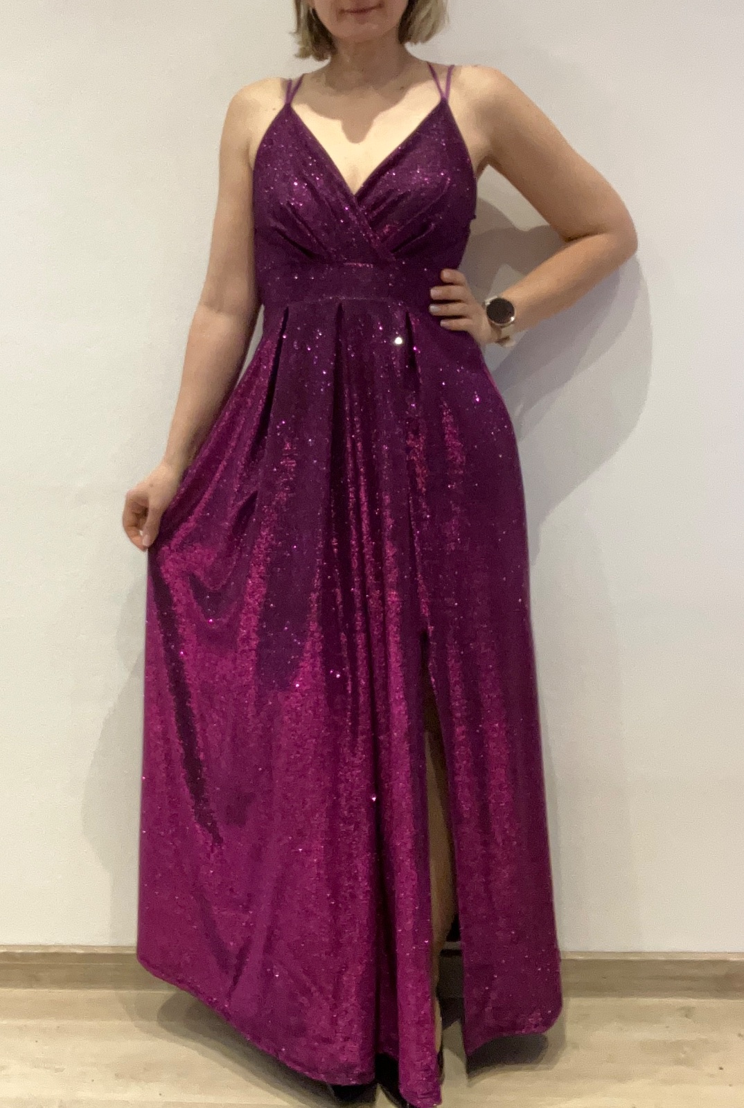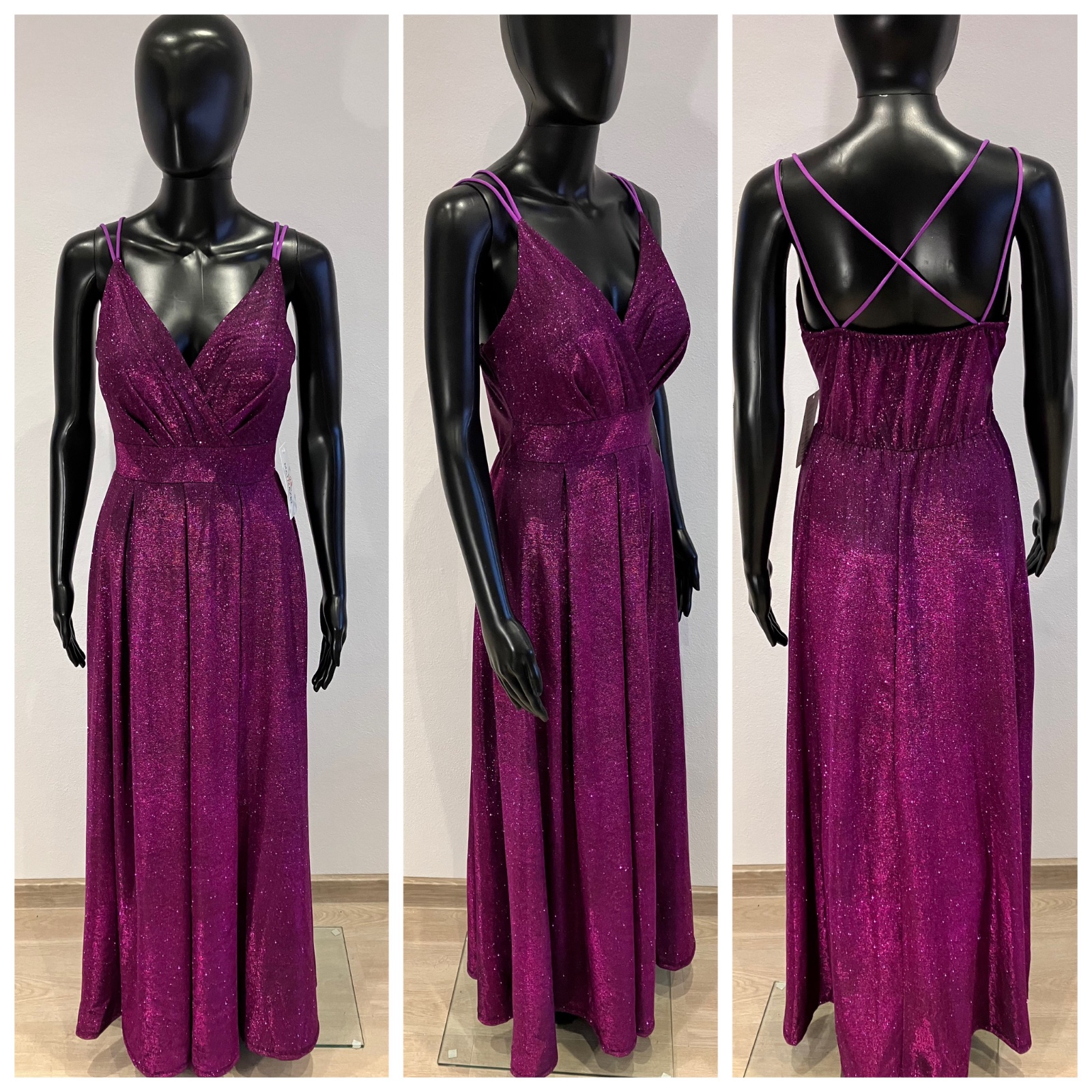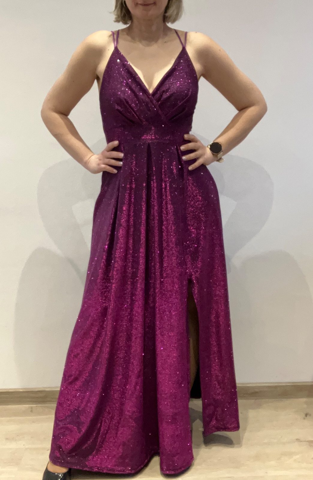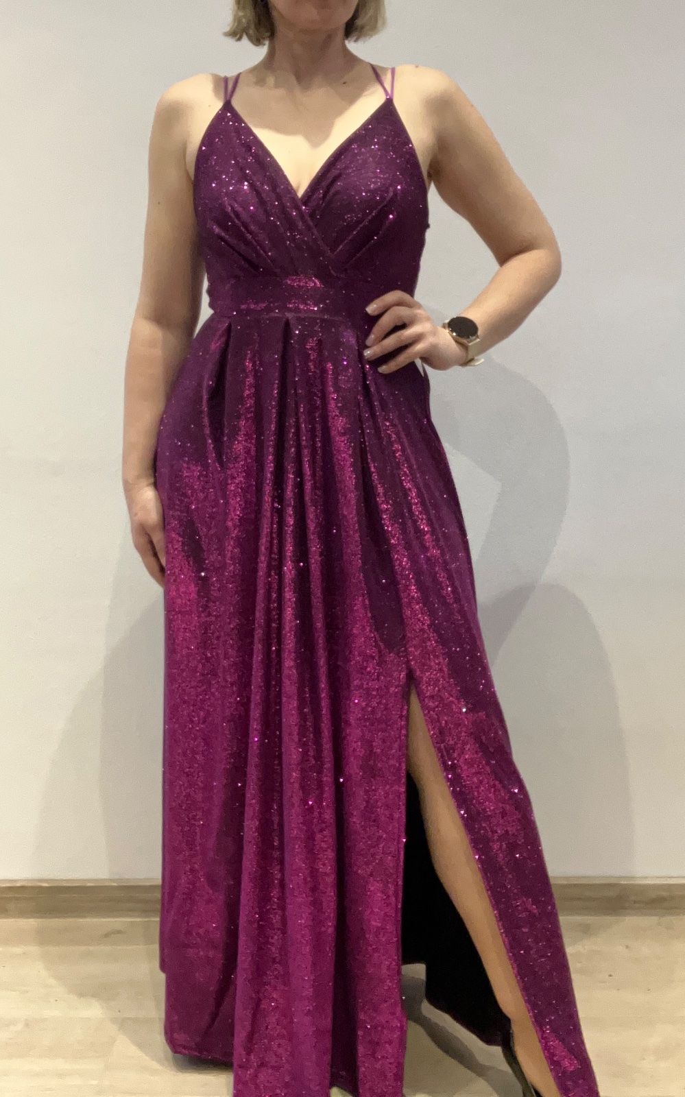 Dámske trblietavé maxi šaty na tenké ramienka s rozparkom. Elegantné, spoločenské. Vystužené. Vzadu na chrbáte elastická guma.