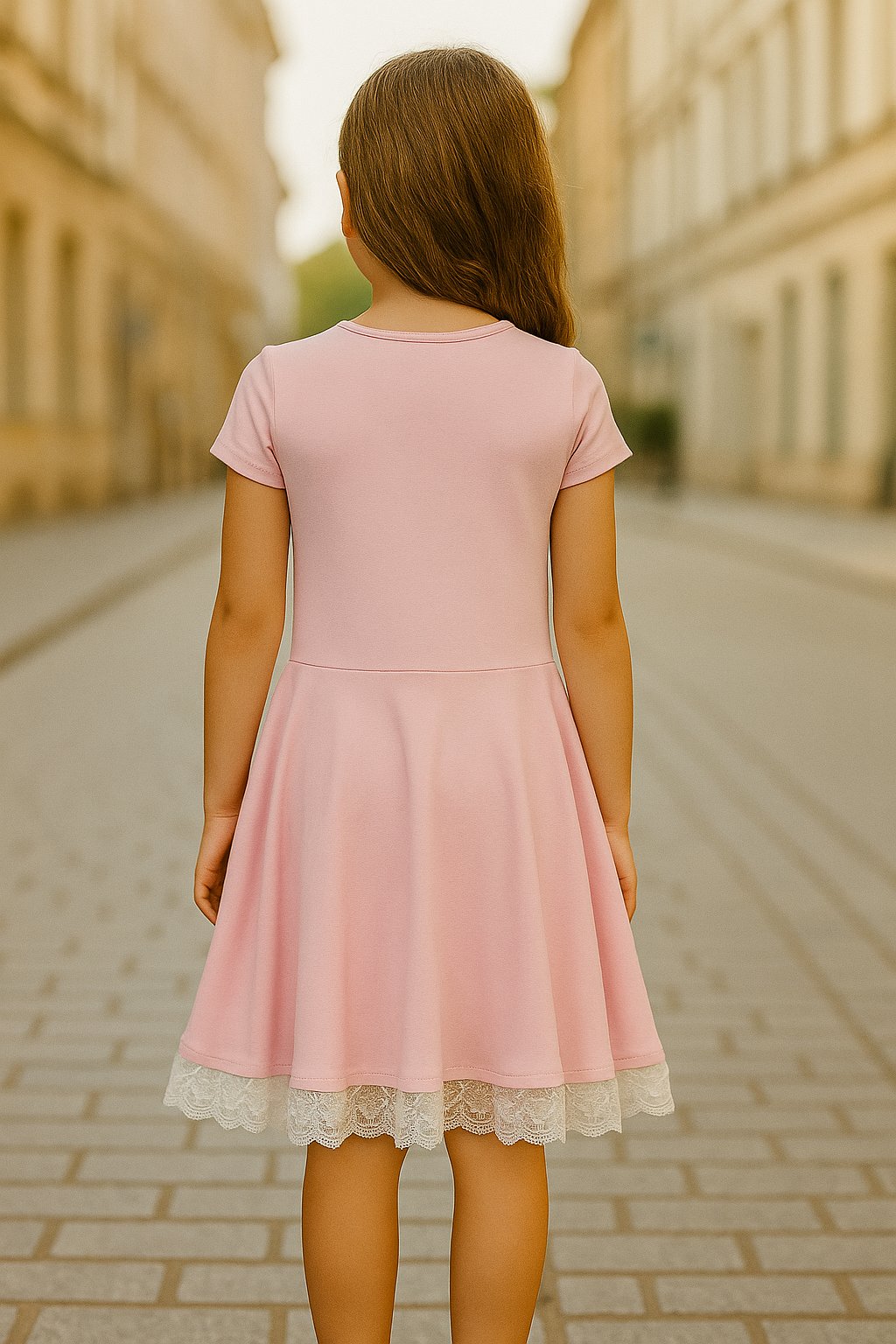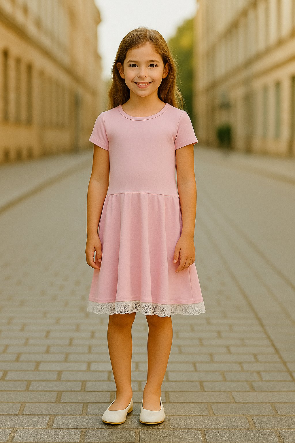 Horná časť má jednoduchý, pohodlný strih s krátkymi rukávmi a okrúhlym výstrihom. Sukňa je mierne rozšírená, čo umožňuje voľný pohyb a vytvára pekný dievčenský vzhľad. Spodný lem je ozdobený bielou čipkou, ktorá šatám dodáva jemný romantický detail.