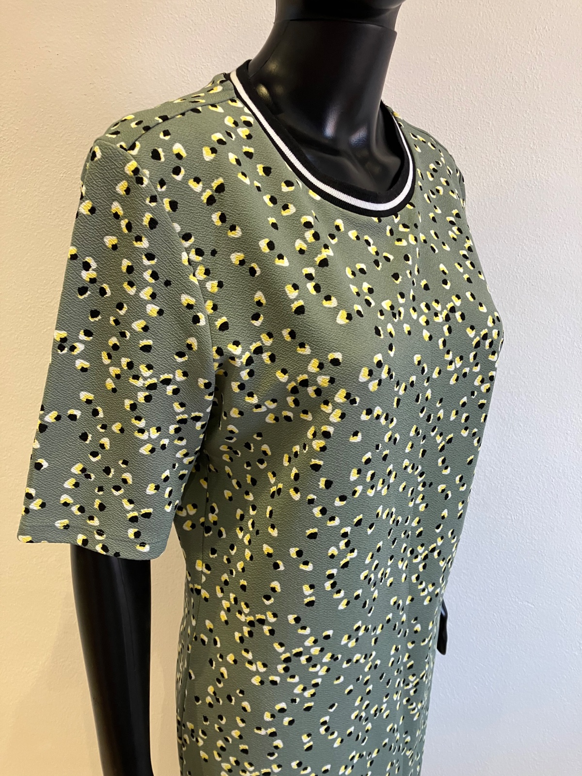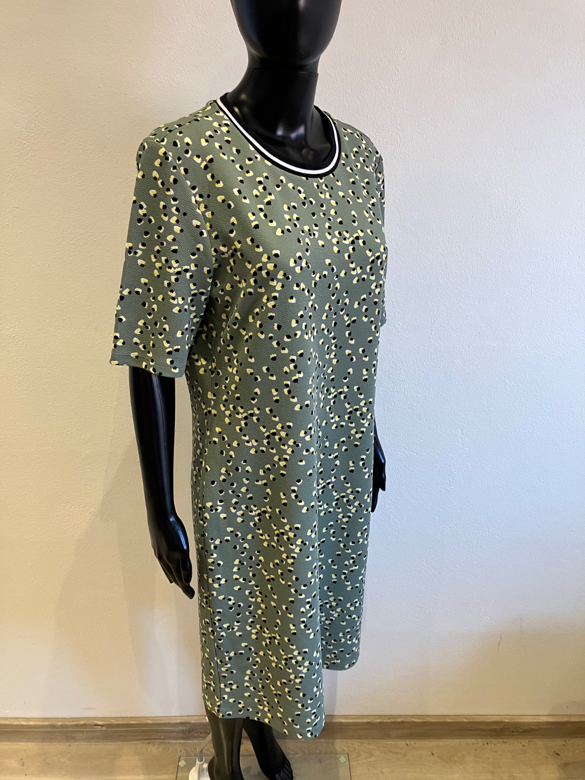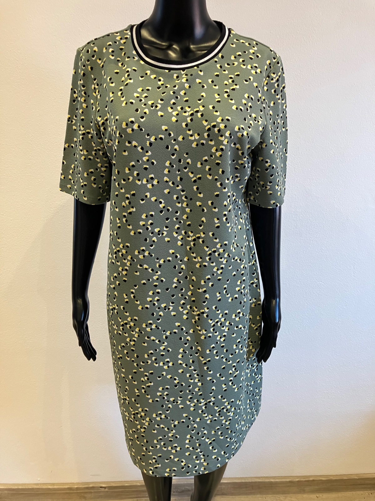 Dámske šaty s krátkym rukávom, khaki s čierno-žlto-bielym vzorom, elastické, materiál 95%polyester 5%elastan.