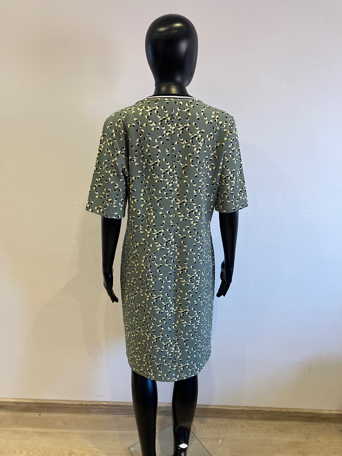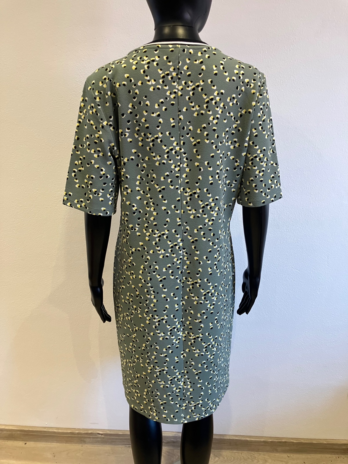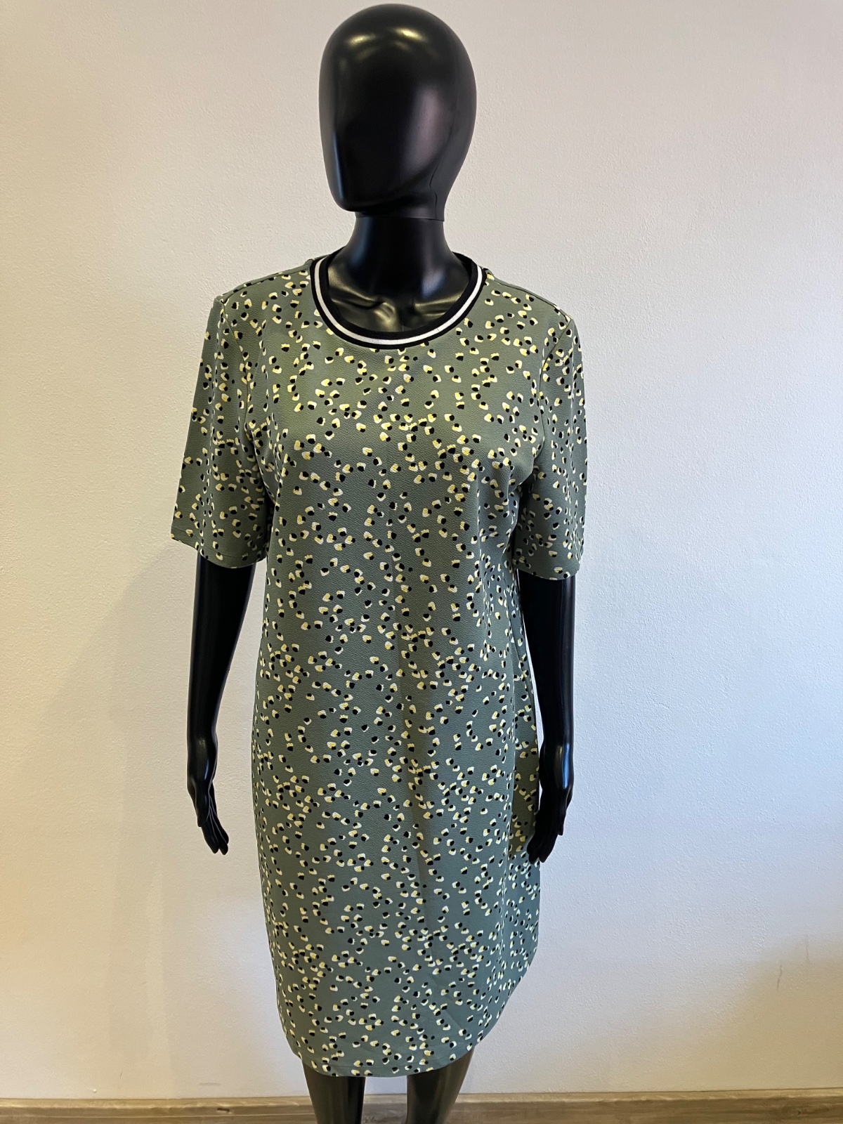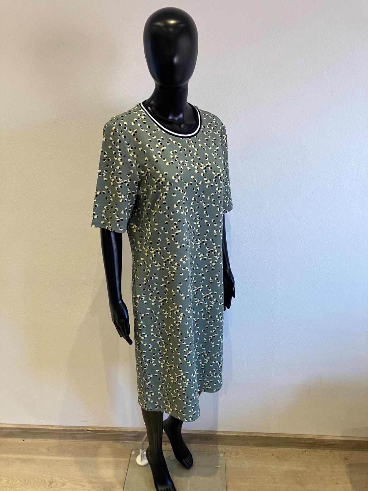 Dámske šaty s krátkym rukávom, khaki s čierno-žlto-bielym vzorom, elastické, materiál 95%polyester 5%elastan.