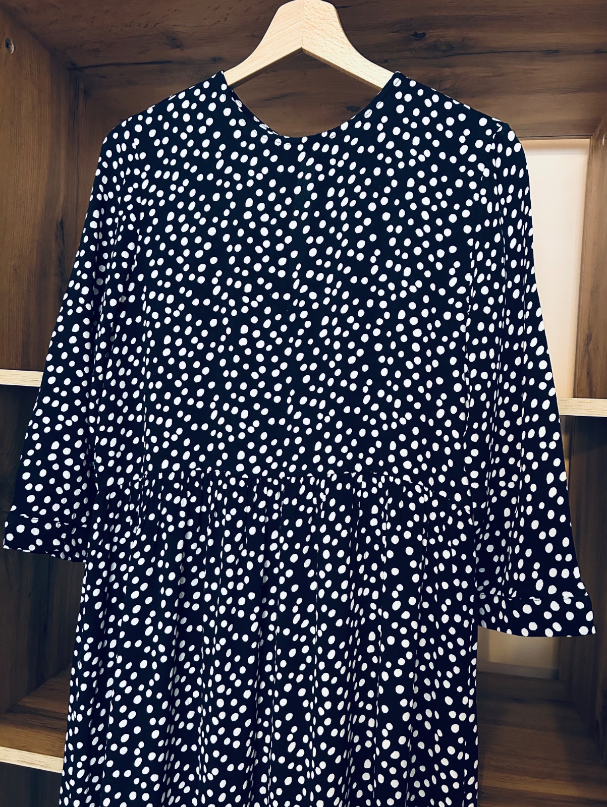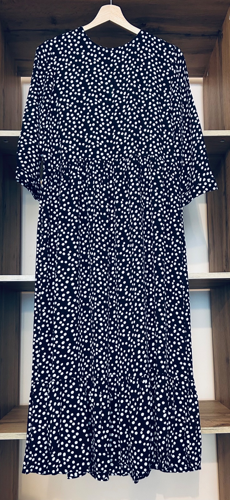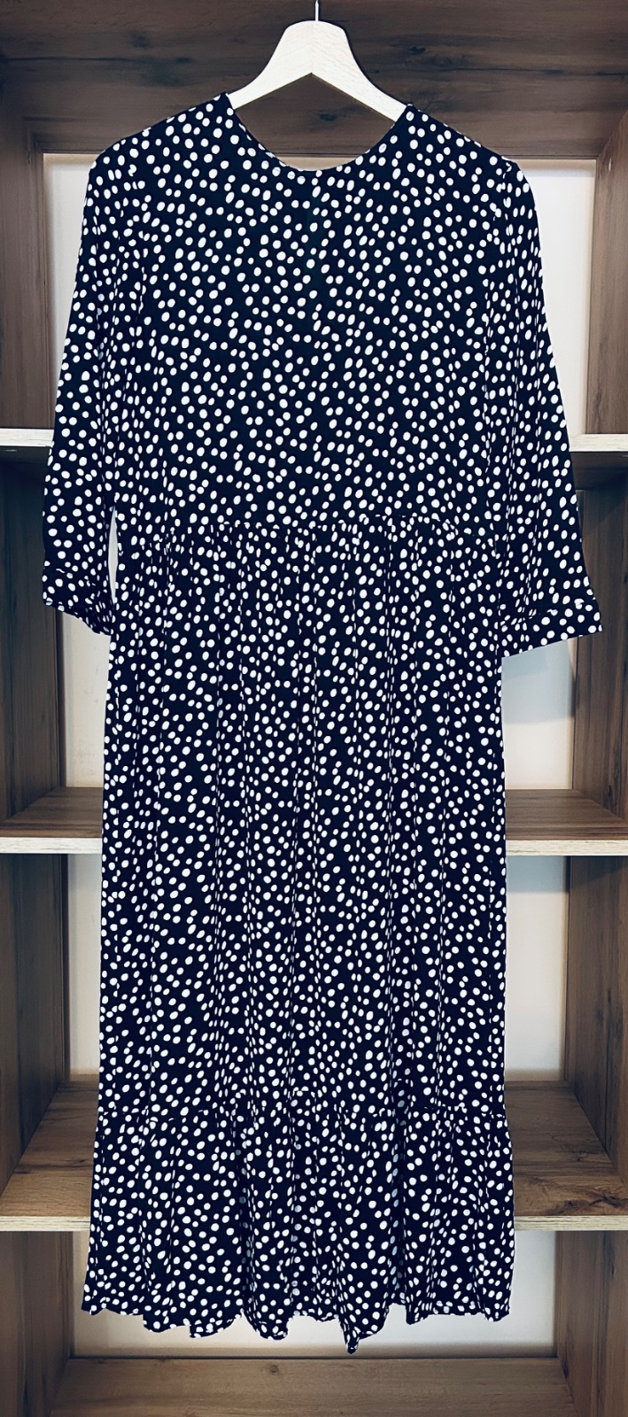 Šaty majú okrúhly výstrih a 3/4 rukáv. Zapínanie na gombík a volánový spodný diel.