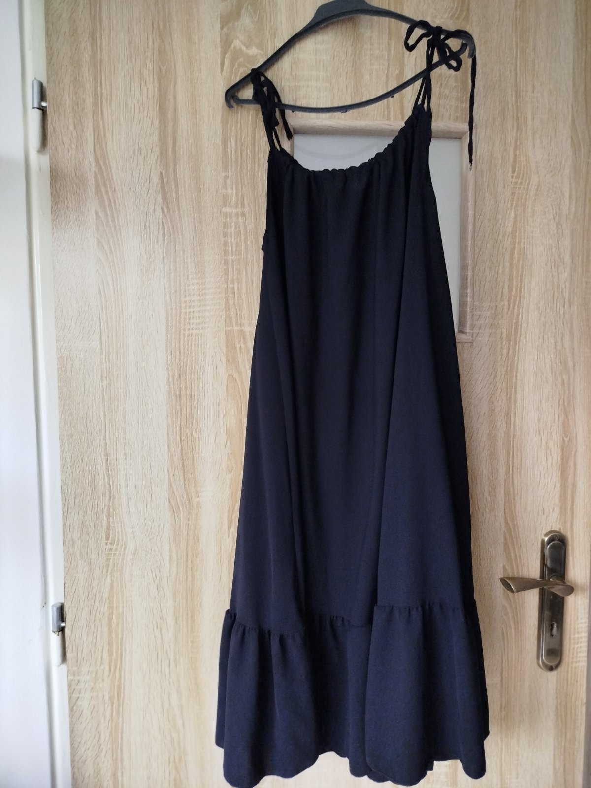 Dámske ľahké, čierne šaty volánikové, Uni veľkosť, na ramienká. Dĺžku sa dá prispôsobiť s ramienkami. Dĺžka po kolená. Výborný stav.