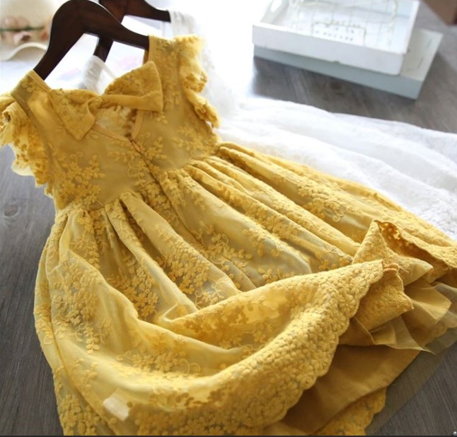 Materiál jemnucka latka povysivana kvietkami, podsite, neskriabu a nepresvitaju, vzadu zapinanie na zips, ozdobene maslickou. Suknicka ma 3 vrstvy vrchnu vysivanu, jemny tyl a spodnicku. Stale moderka kaki horčicovo žltá farba. Krátky rukáv.