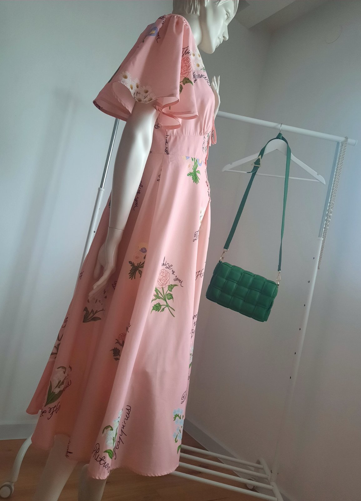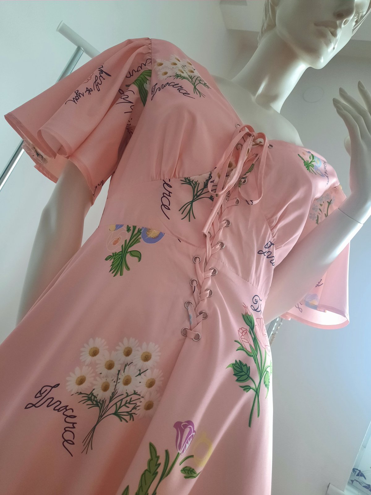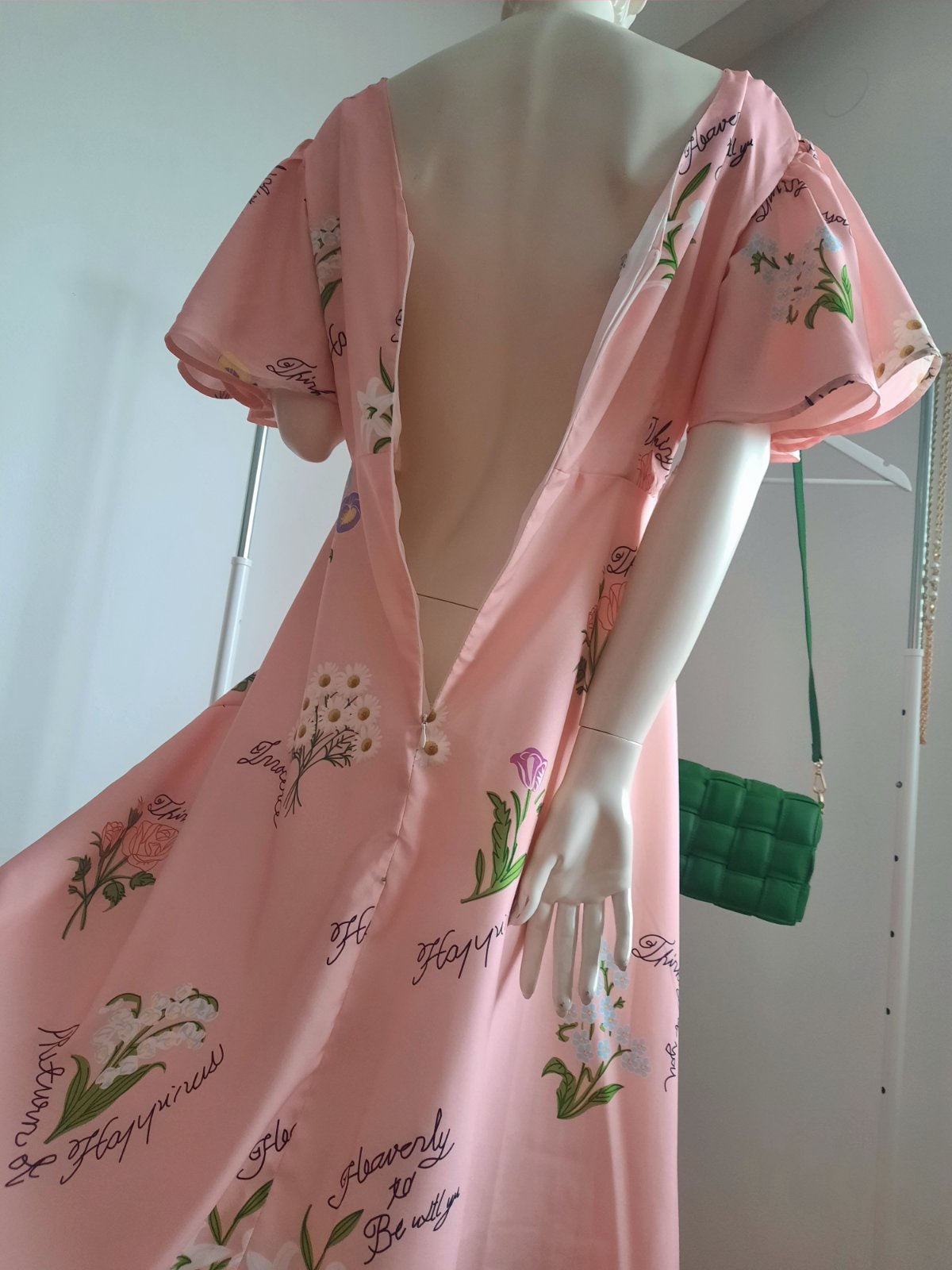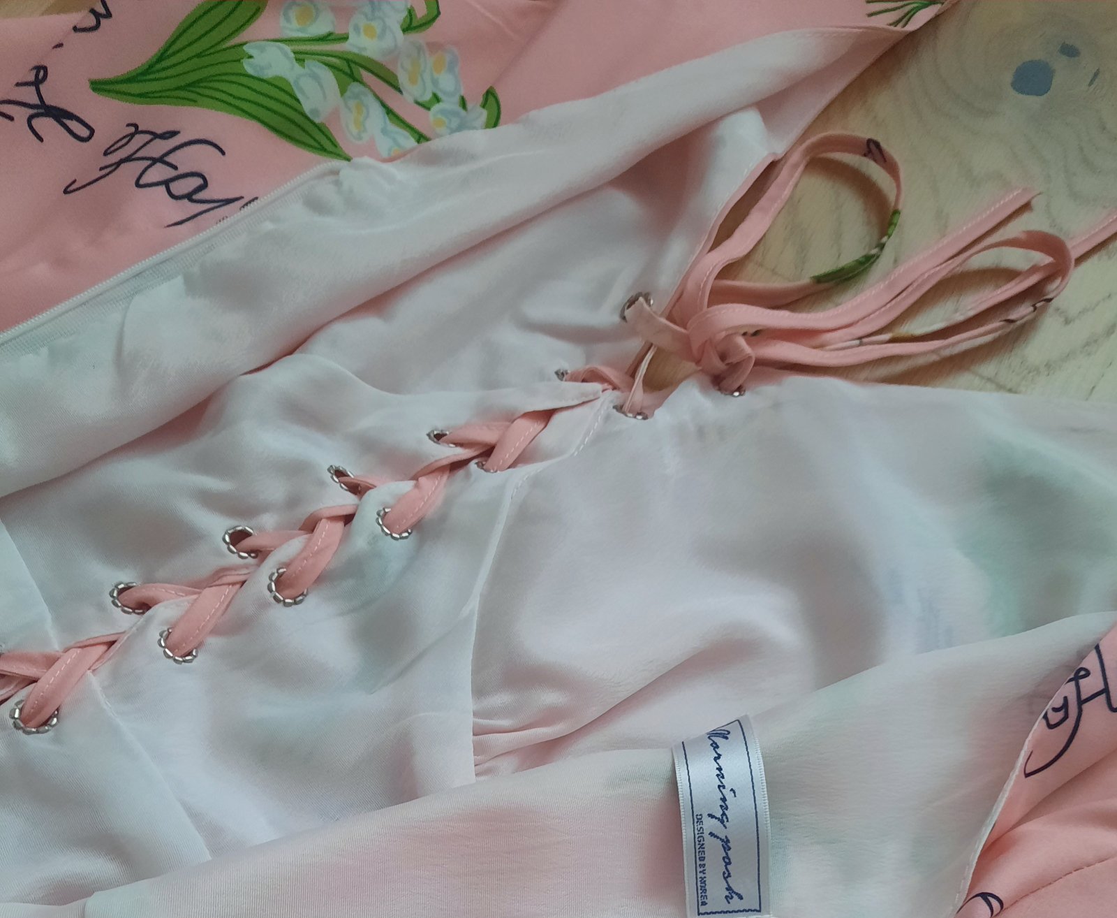 - Raz oblečené spoločenské šaty bledoružovej farby s lístkovým vzorom