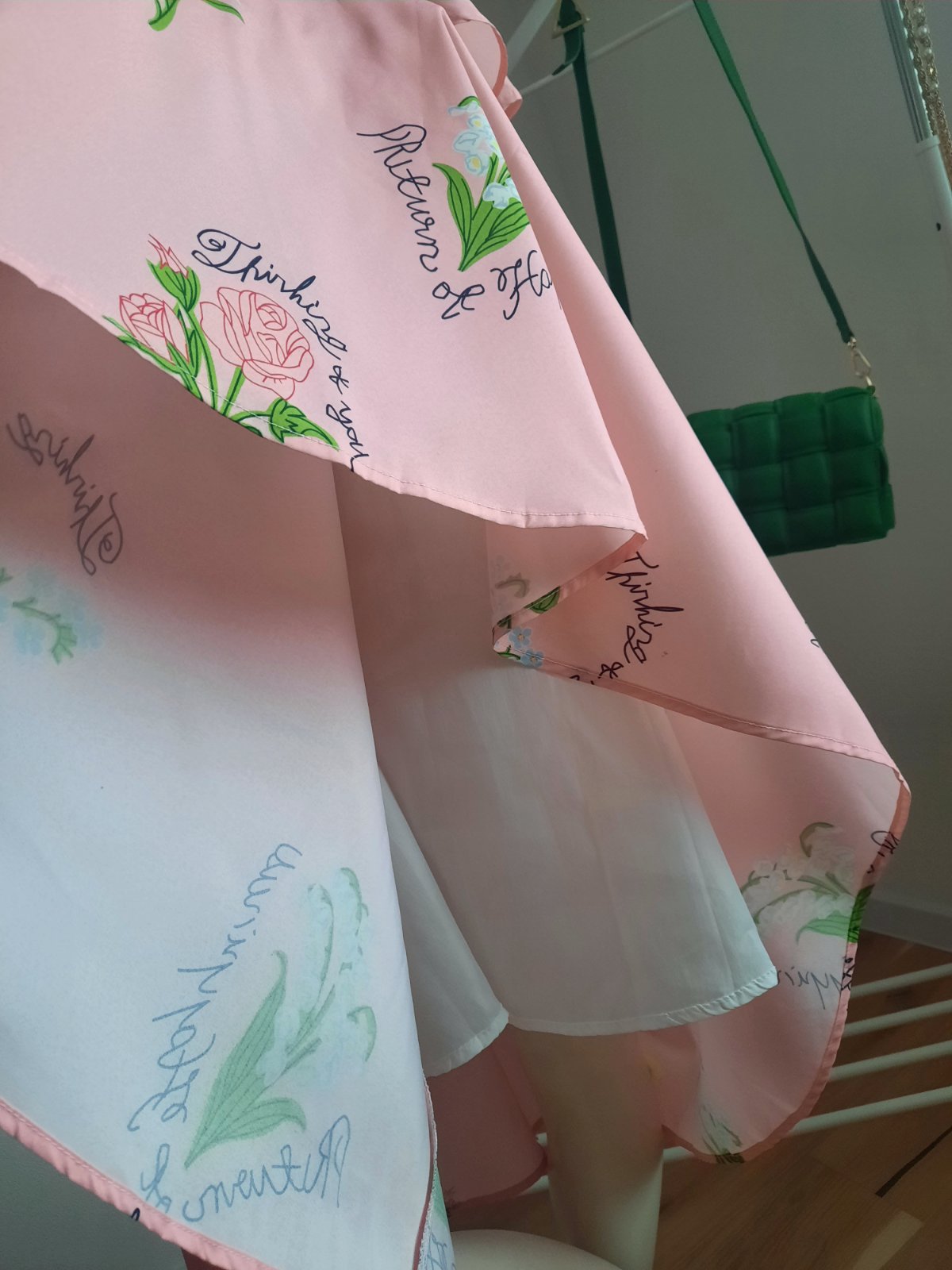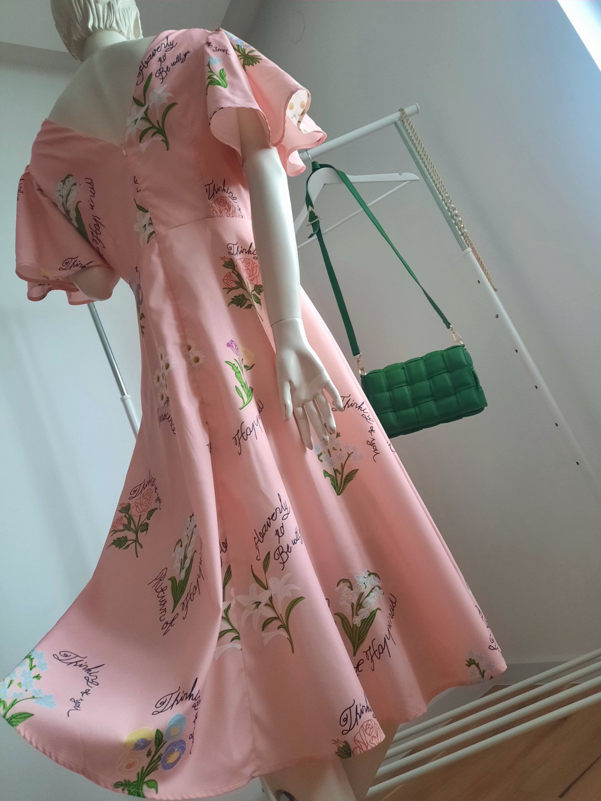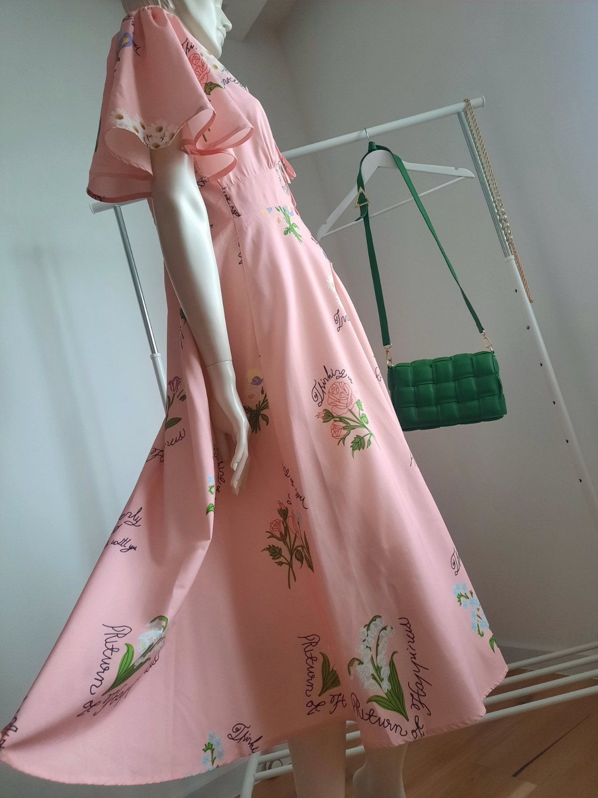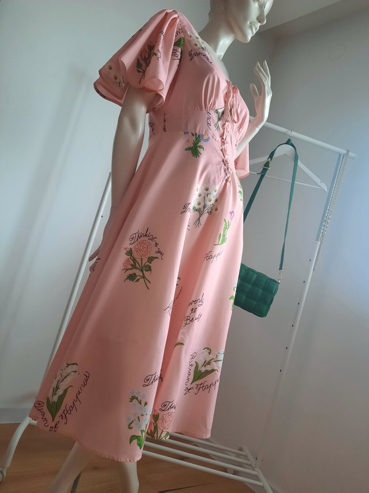 - Raz oblečené spoločenské šaty bledoružovej farby s lístkovým vzorom