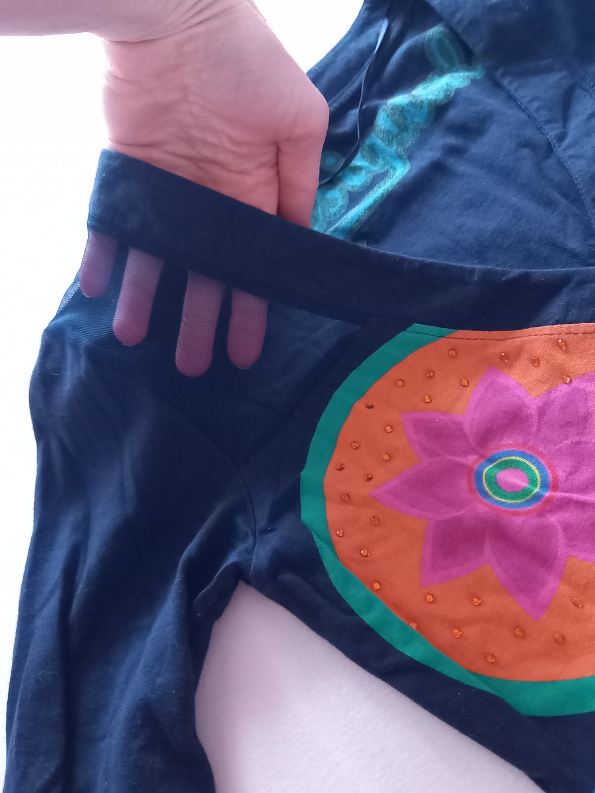 Šaty so šnúrkou, veľkosť 36/38. Dĺžka 88 cm, šírka cez prsia 48 cm, pas sa da stiahnuť šnúrkou, boky 48 cm. Maju aj vrecká.