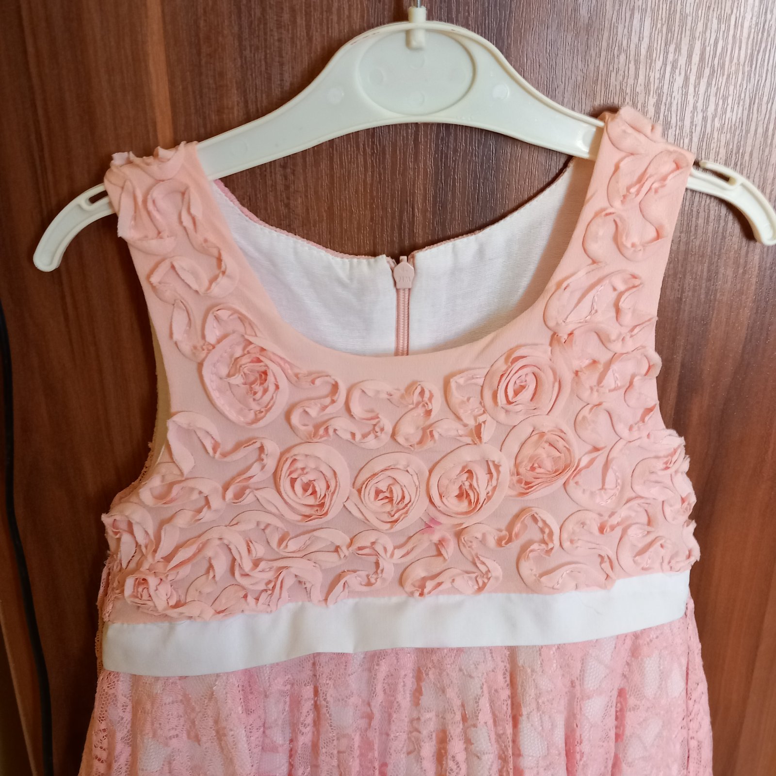 Predám krásne spoločenské šaty broskyňovej farby, dcéra ich mala 1x oblečené na svadbe. Velkosť 110, rada odmeriam, bez poškodenia.