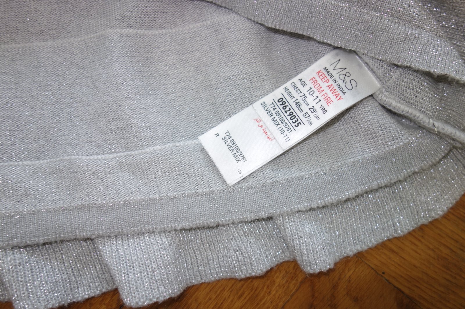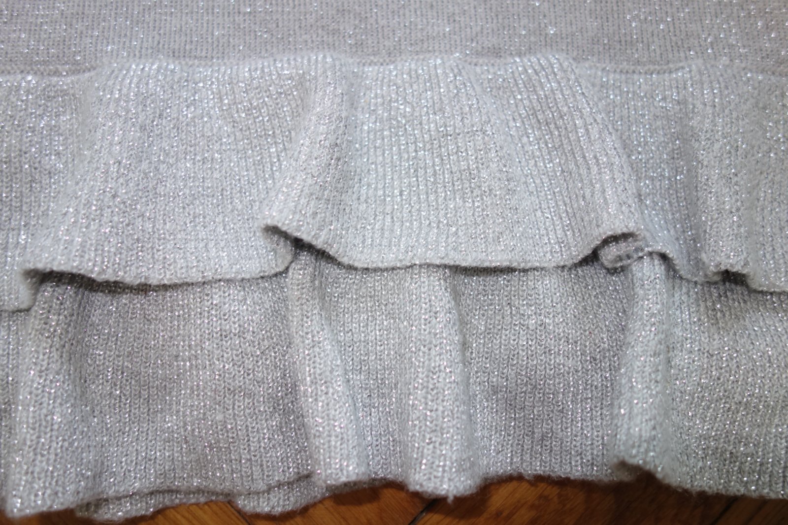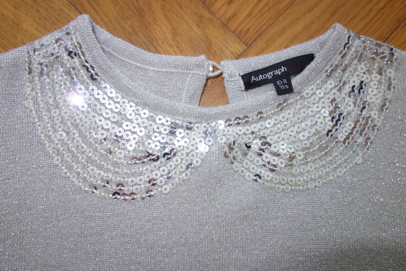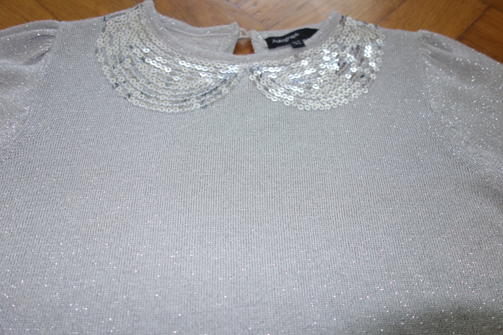 Top stav. Značka Autograph. Tenký úplet, sivé šaty so strieborným metalickým vláknom. Vhodné na menšiu slávnosť, do divadla, na oslavu, atď. 39% viskóza, 38% akryl, 14% metalické vlákno, 9% polyester.