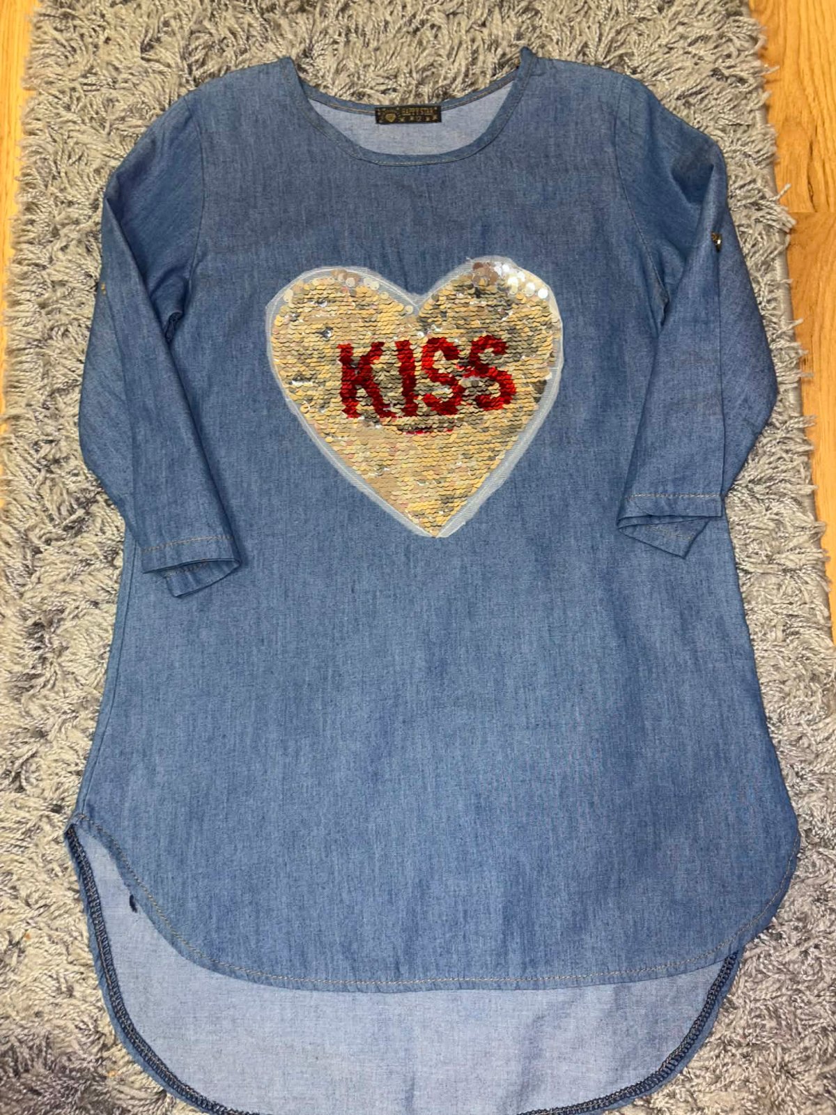 Dievcenske saty Next vel. 152, tmavomodre - mne zle odfotilo, su tmavsie v reale - ako na poslednej foto, imitacia rifloviny, hrubsie, volnyi strih do A, celkova dlzka vpredu 83 cm, vzadu 88 cm, ru...