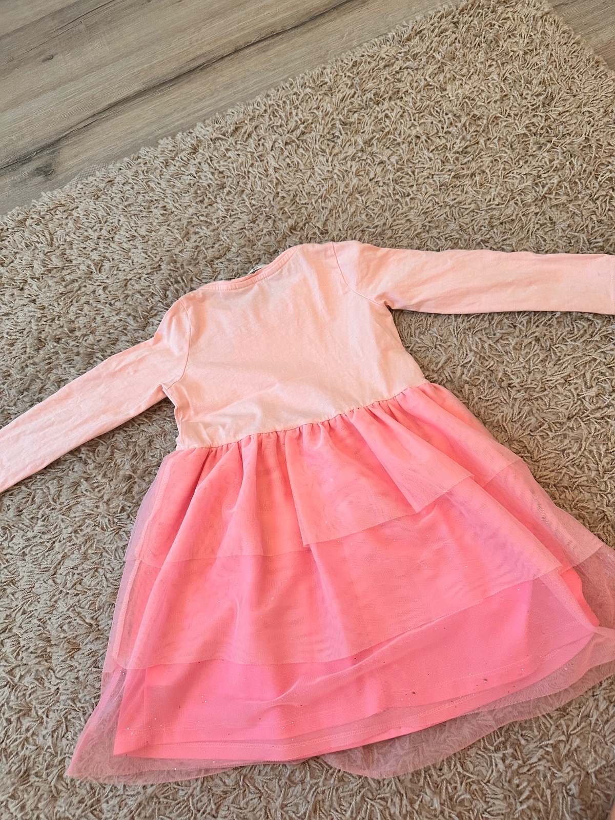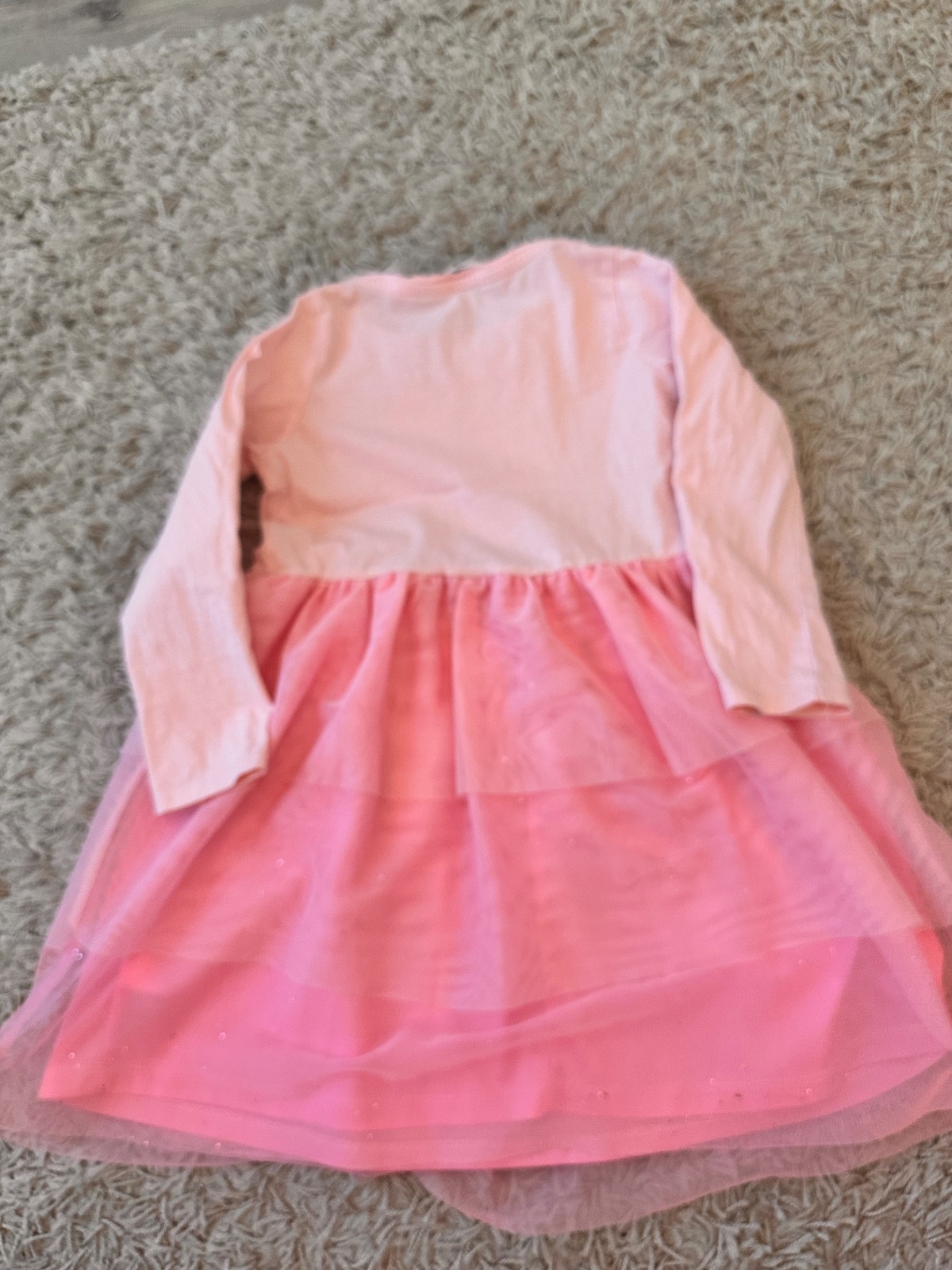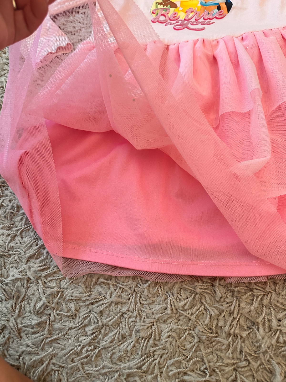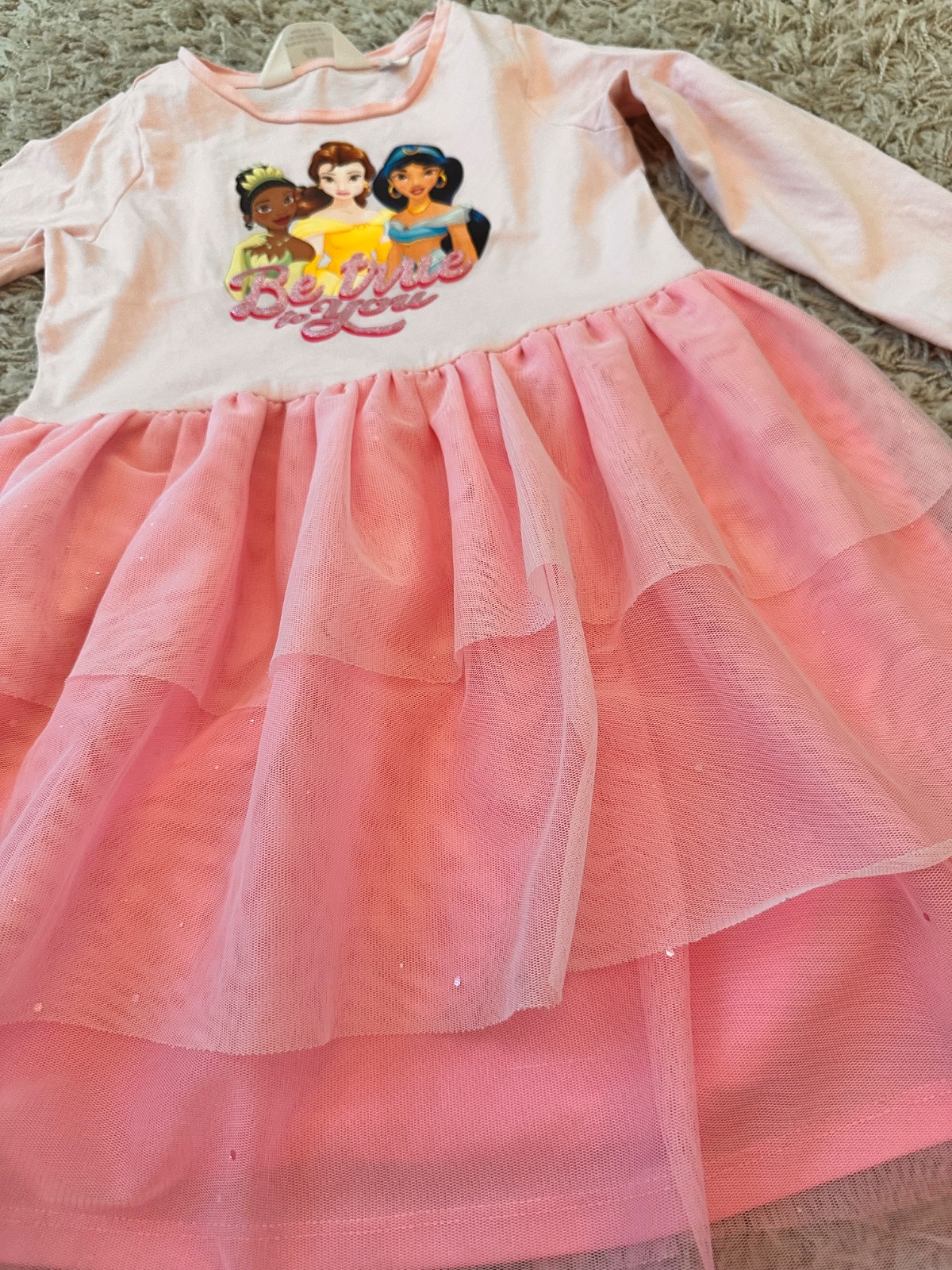 Predam šatky po dcere,velkost 110/116 s tylovou sukňou a hore s motívom princezien. Šaty su v super stave,no na konci rukava je mini-fliačik,pri bežnom noseni nevidno-odfotila som,je uplne bledy,dcera rada maluje 😀.mozno este uplne zíde. Inak bez poškodeni.