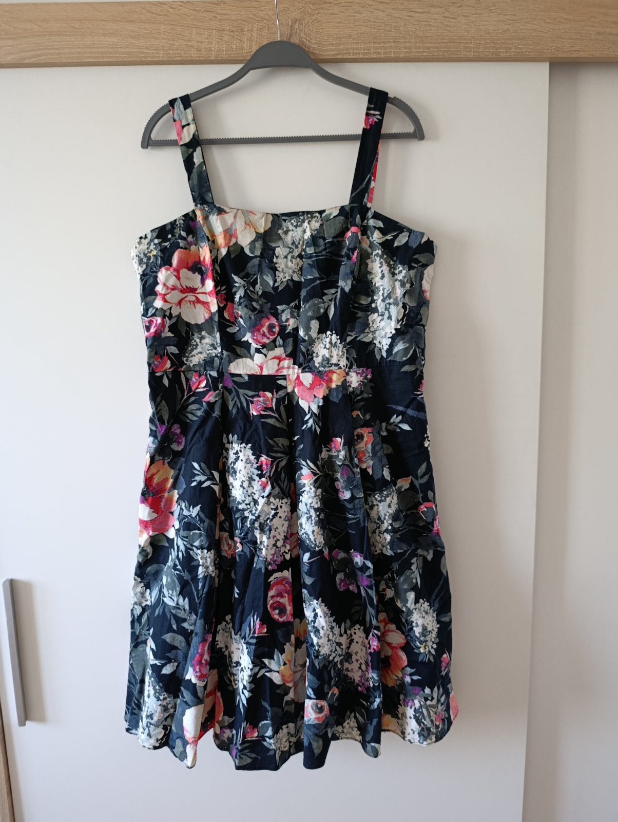 Kvalitné letné šaty tmavomodrej farby, s potlačou, materiál šírka v podpazuší 52x2 cm, pás 65x2 cm, boky 77x2 cm, dl. 93 cm, v 12/20/210 ZNAčKA: YESSICA C&A VEĽKOSŤ: 42