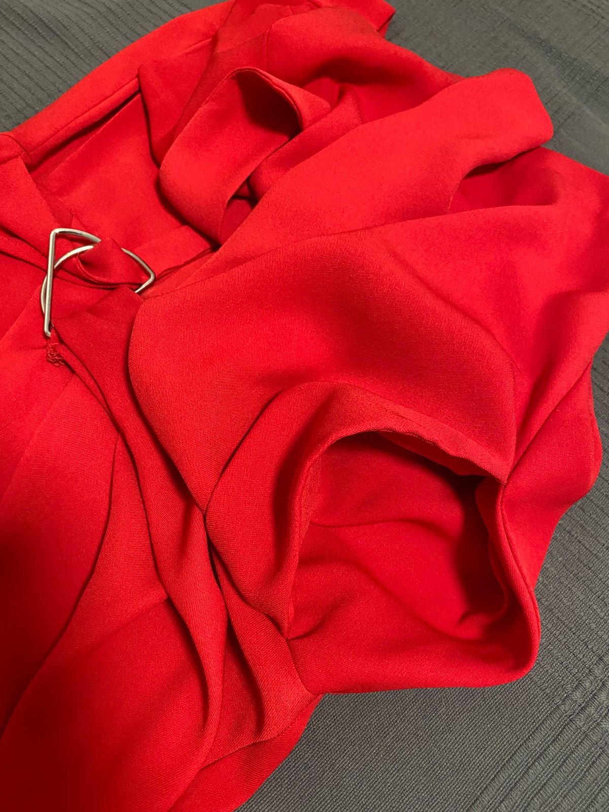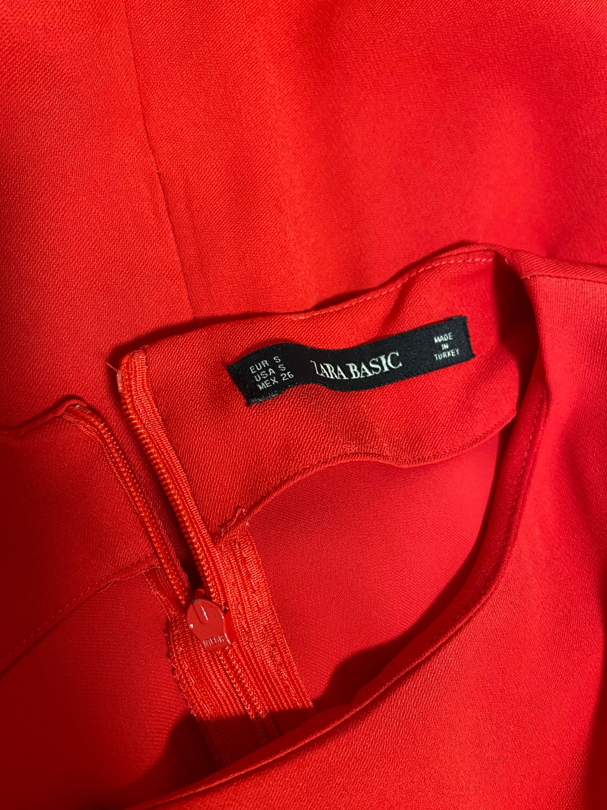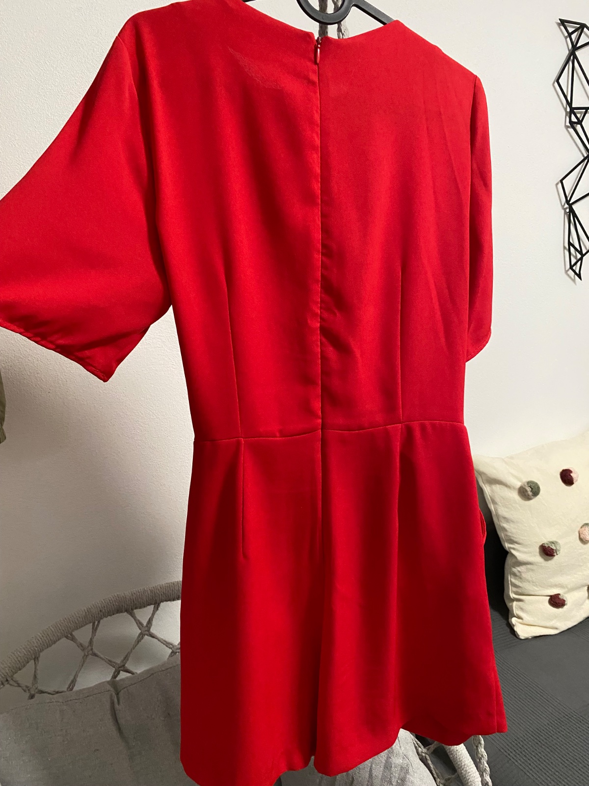 Krásne červené šaty v 100% stave. Odporúčam skôr na útlejšie postavy -veľkosť 34/ 36. Šírka cez prsia 42cm, v páse 35cm, dĺžka 86cm. Ide o pevnejší materiál, nie elastický, s podšívkou
