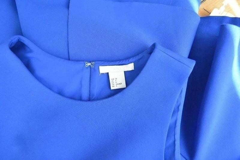 Ponukám kráľovské modré mini šaty sú priliehavého strihu s asymetrickým volánovým (ruffle) lemom v spodnej časti a okrúhlym výstrihom bez rukávov. Vhodné na denné nosenie, koktailové párty, večierky alebo špeciálne príležitosti.