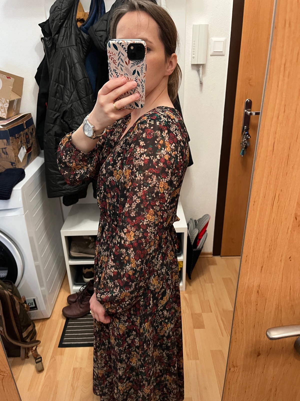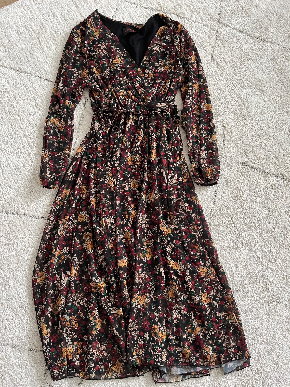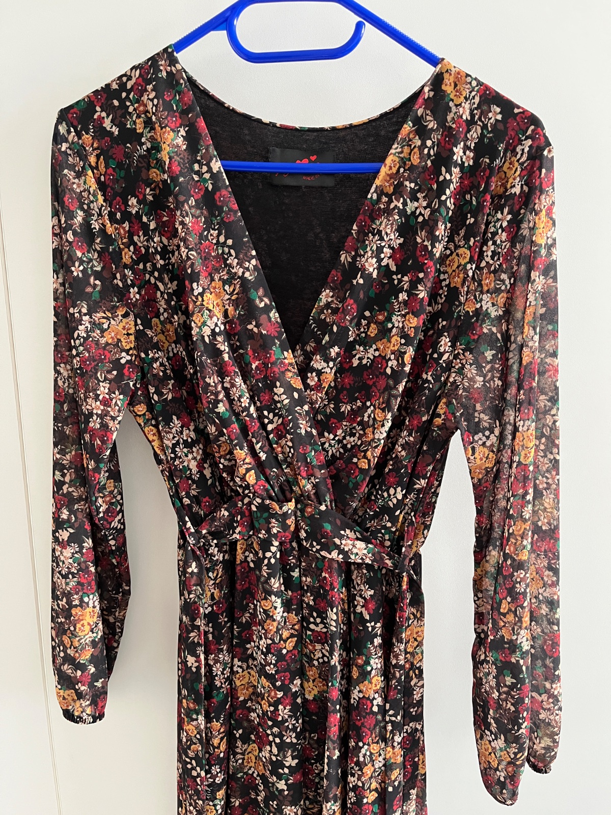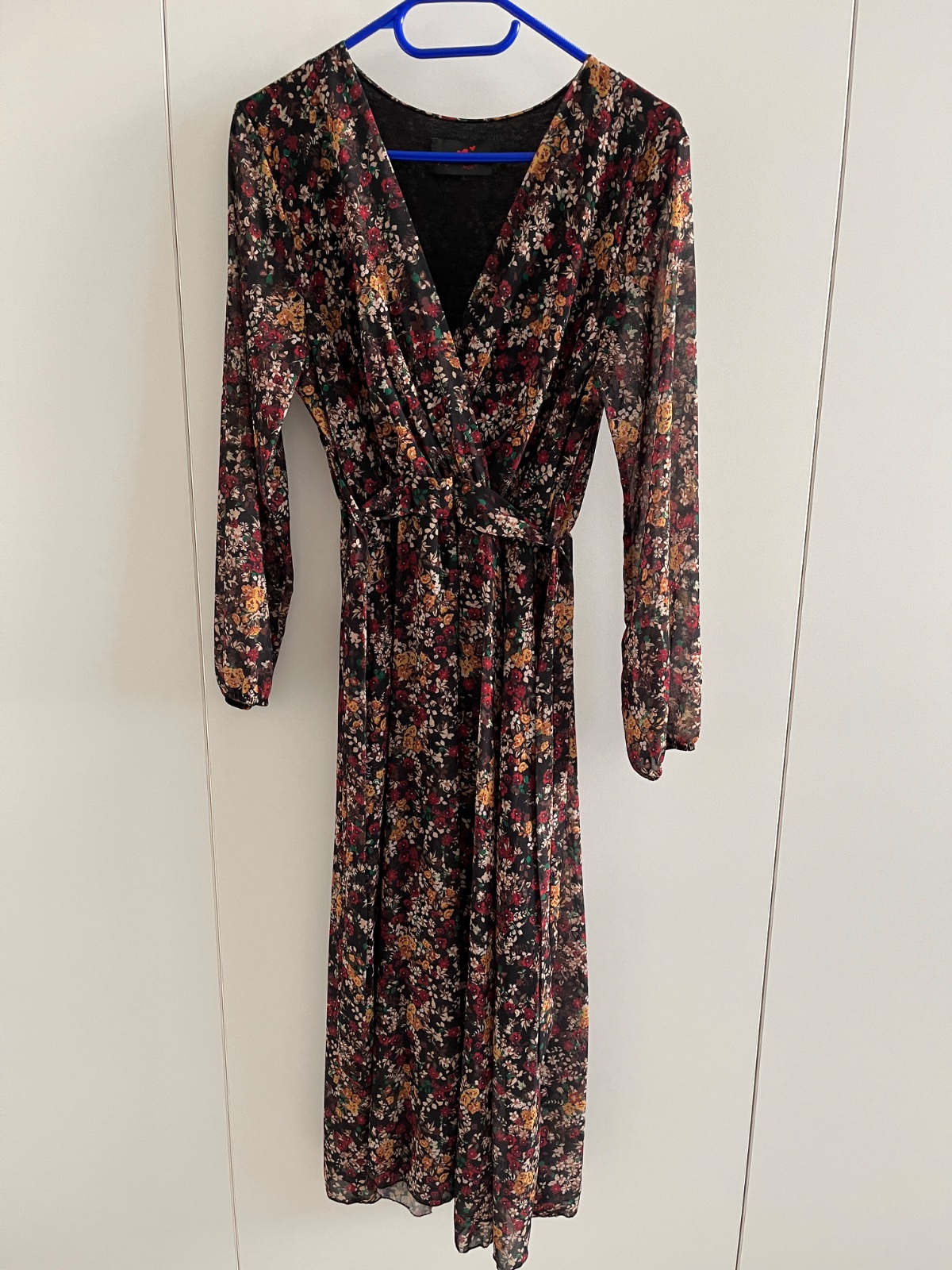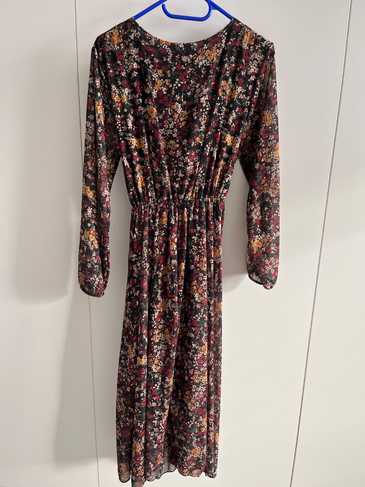 Kvietkované šaty v super stave. Dĺžka 118 cm, šírka cez prsia 38 cm. Šírka v páse 27 cm, je gumička natiahne sa na cca 40 cm.