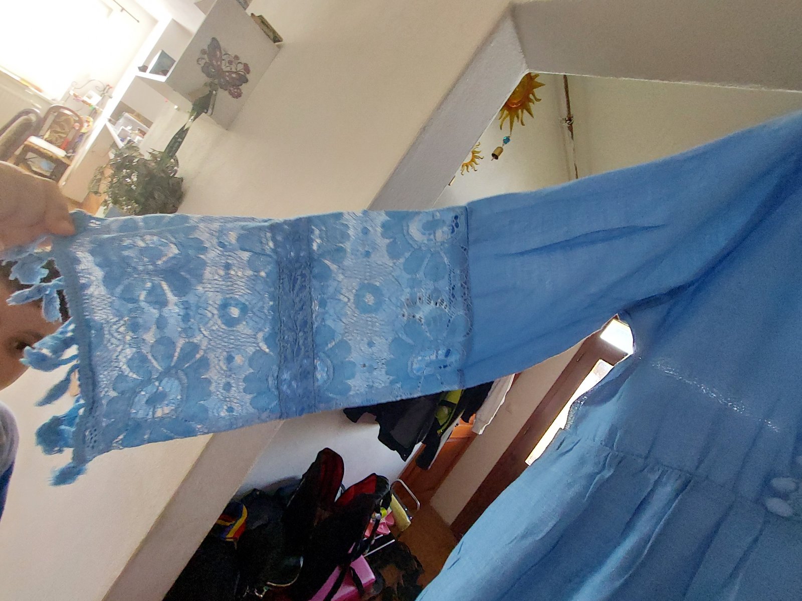 Predám letné šaty. Cena bez poštovného, čiže ku konečnej cene treba prirátať poštovné. Rozmery: pod pazuchami 2x56 cm, pod prsiami 2x51 cm, ďalej sa pomaličky rozširujú, dĺžka rukáva od ramena 62 cm, dĺžka 150 cm, materiál 35 % bavlna, 65 % polyester,