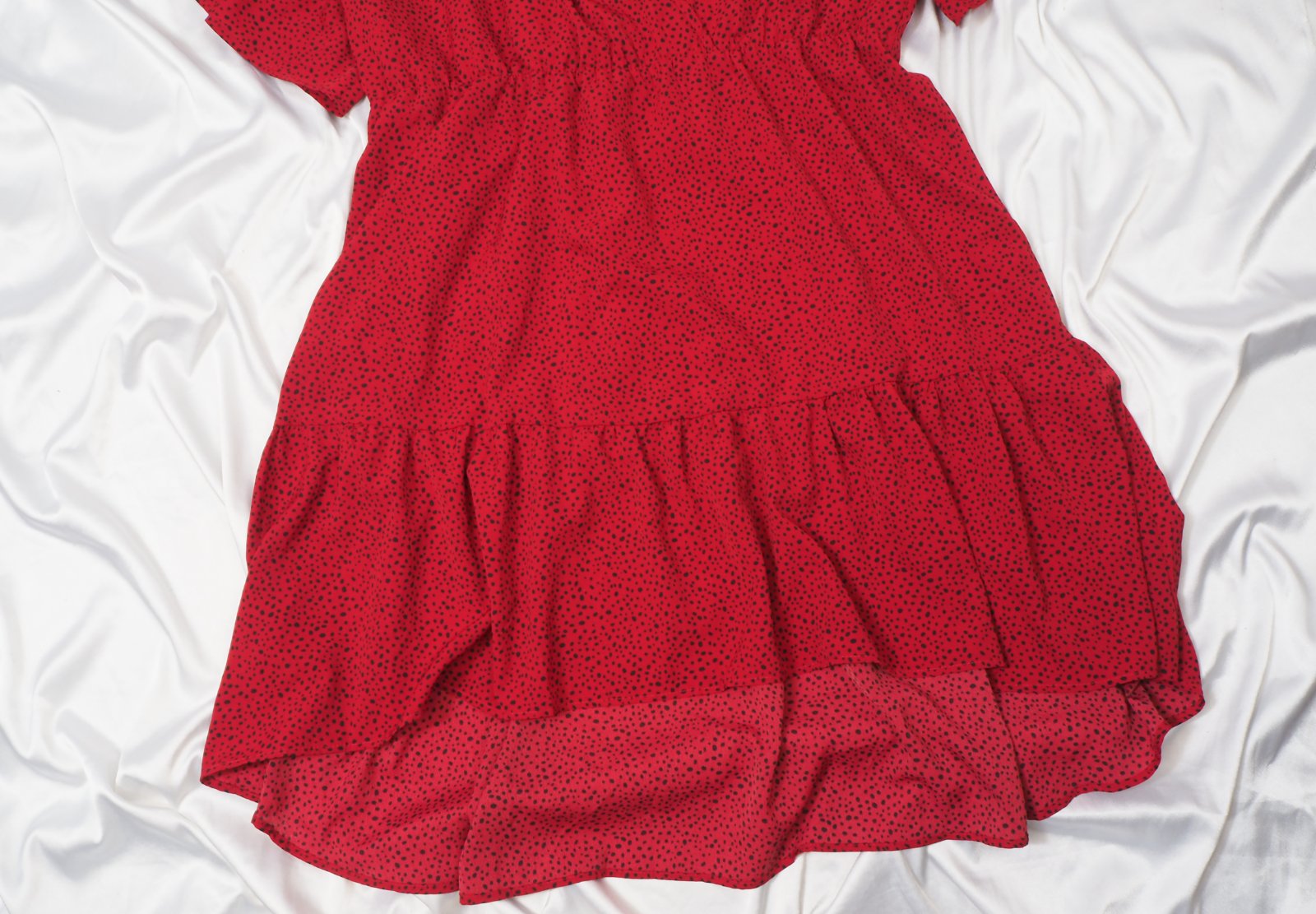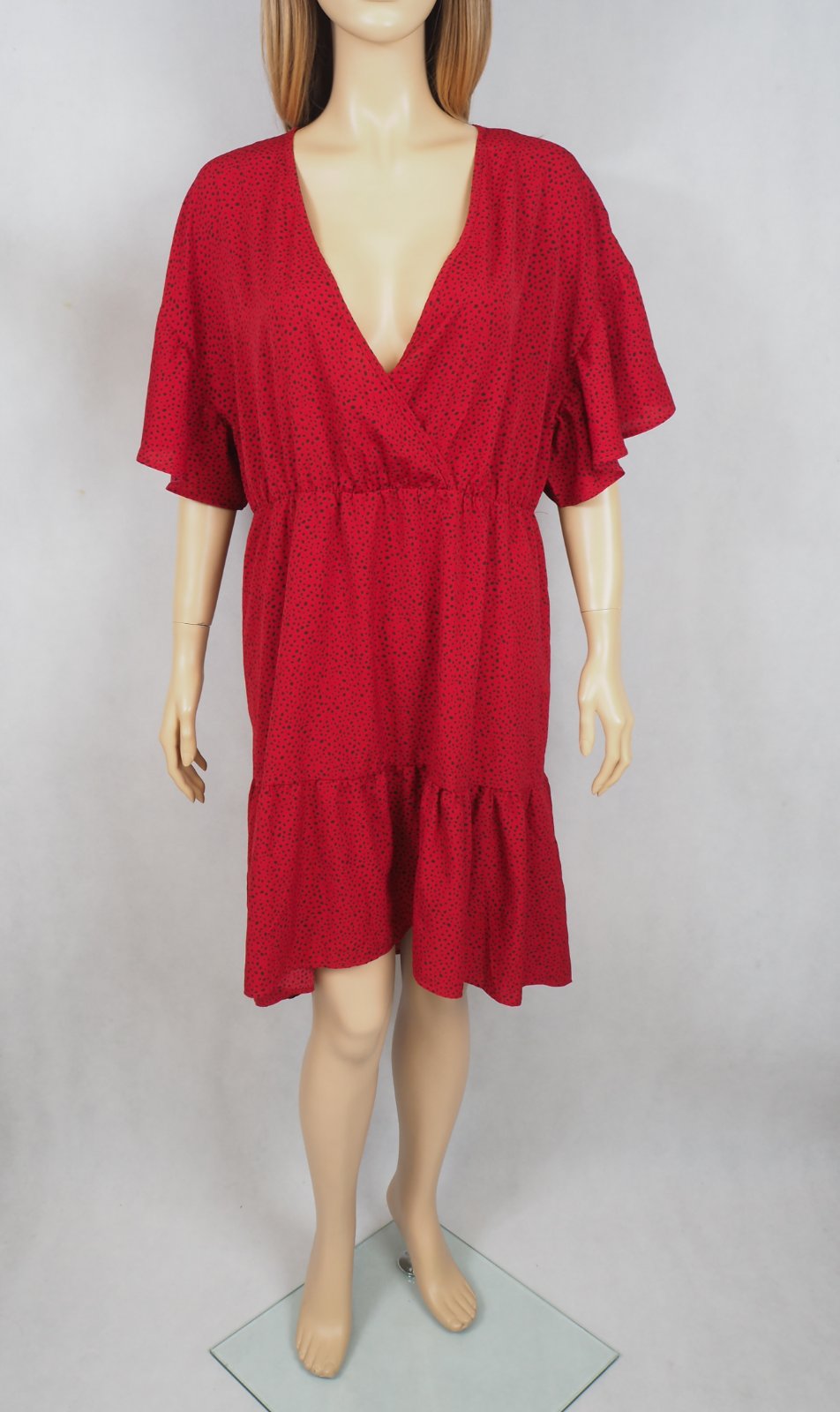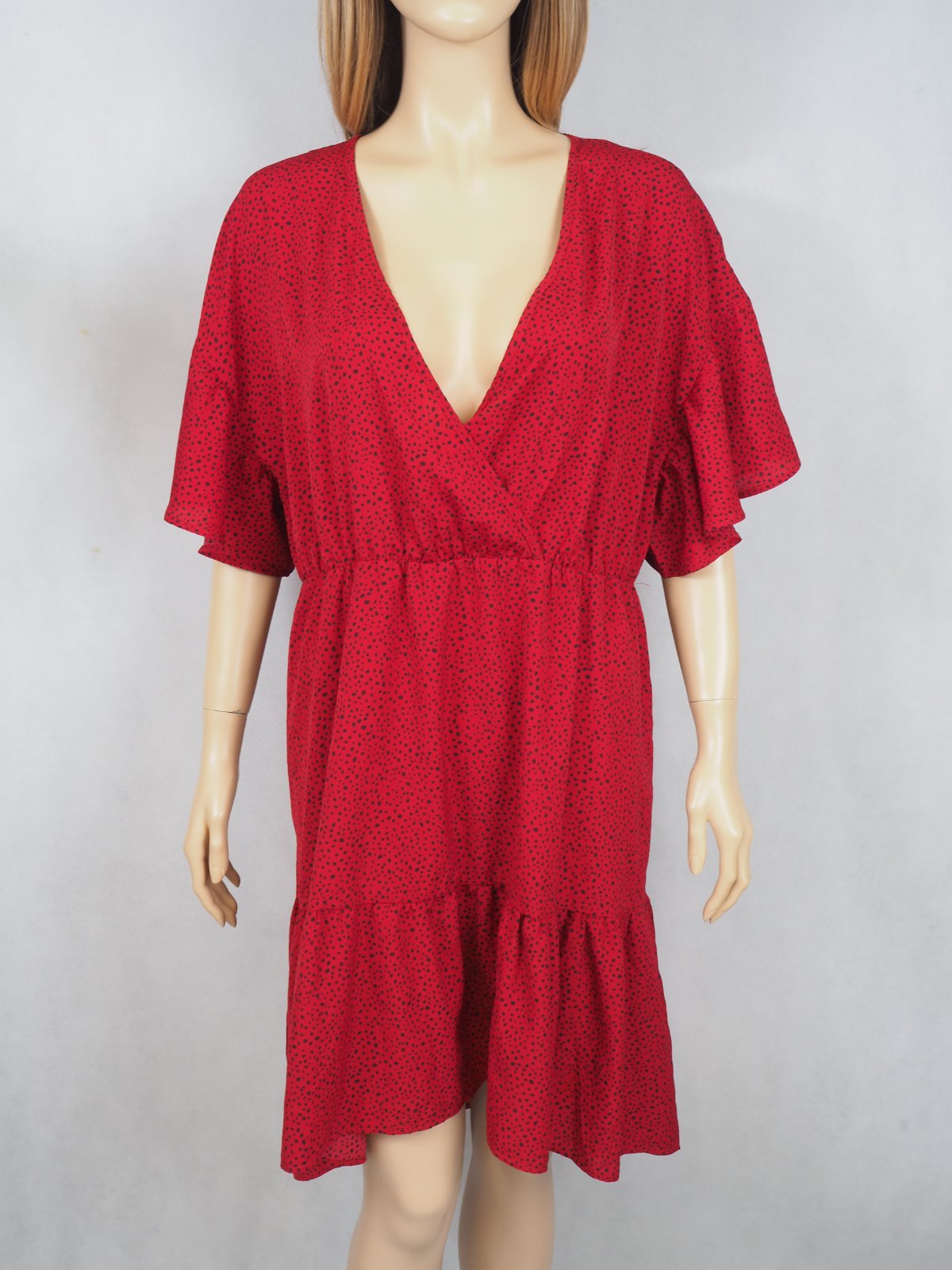 Kvalitné červené šaty s drobným čiernym vzorom, v páse gumka, výstrih prekrížený, volánový spodok, zadný diel dlhší, materiál 100% polyester, super stav.