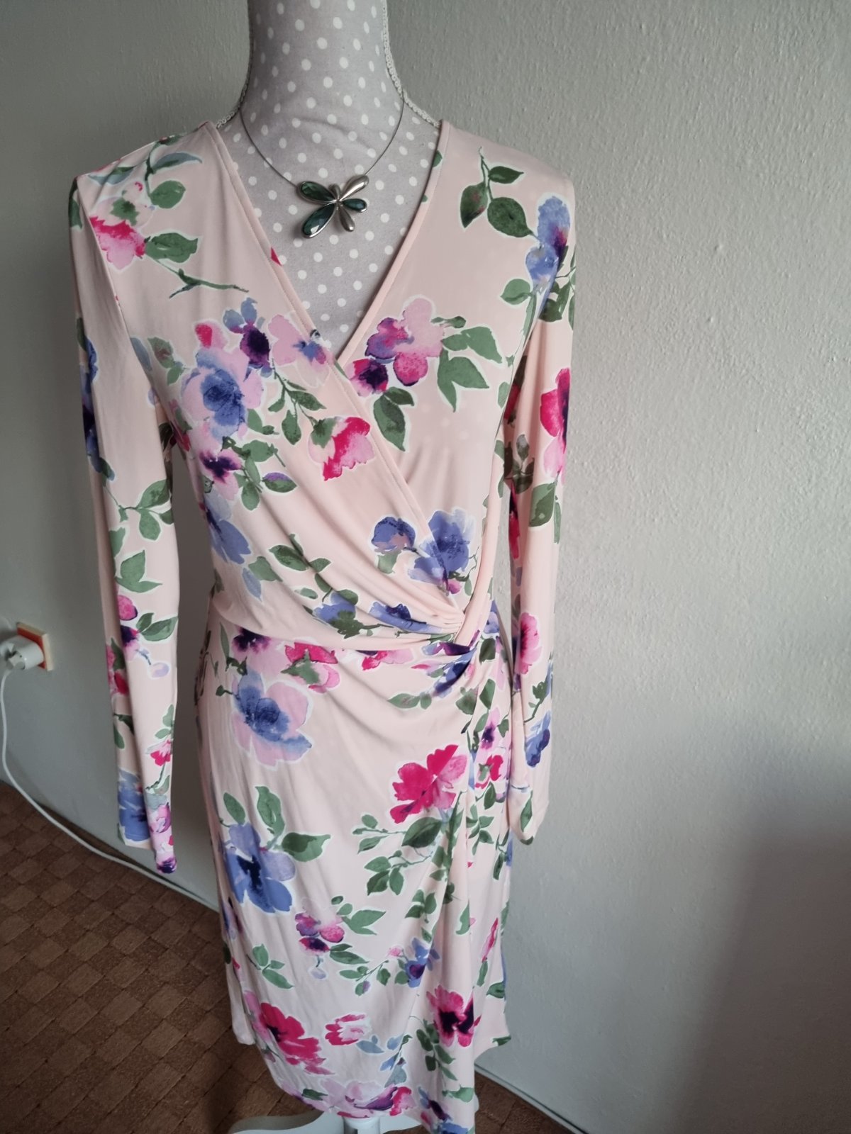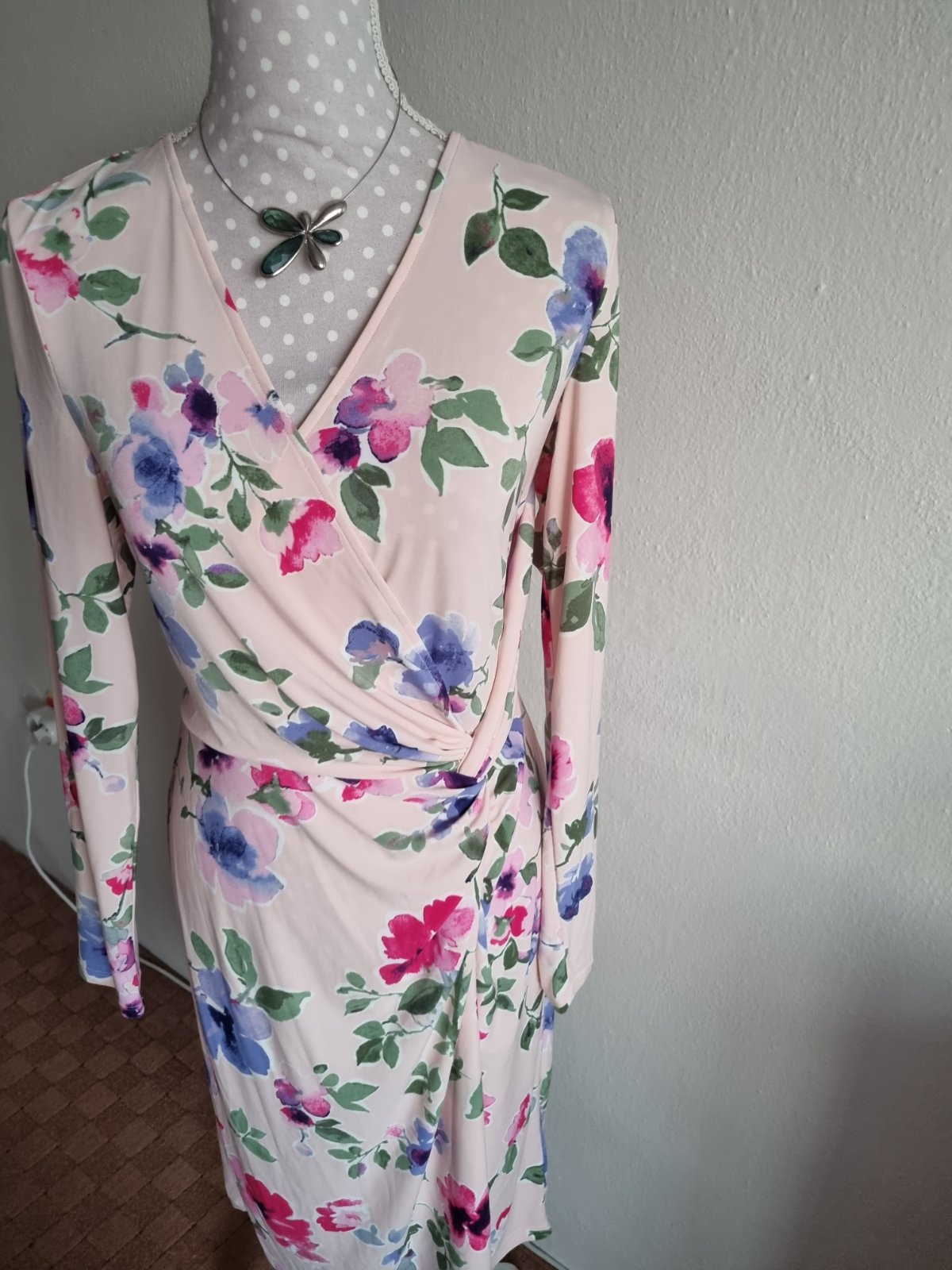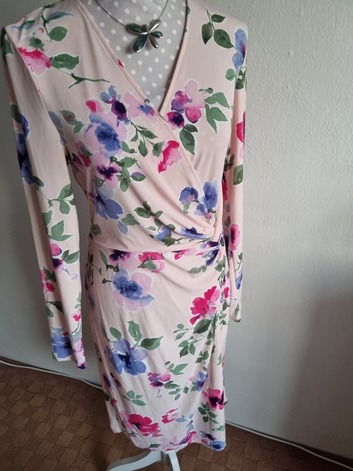 elastické šaty drahej značky, bledoružový podklad, kvetovaný vzor, s visačkou, píše veľ. 10 čo je 40...dlžka šiat od ramena 103, prsia 2x48 v kľude, pás 2x40 v kľude, boky 2x51 v kľude...rukáv od krku 72...šaty sa pekne prispôsobia...sú podšité, materiál je tenší syntetický elastický úplet, ktorý sa nežmolí, nevyťahá a nestráca farbu