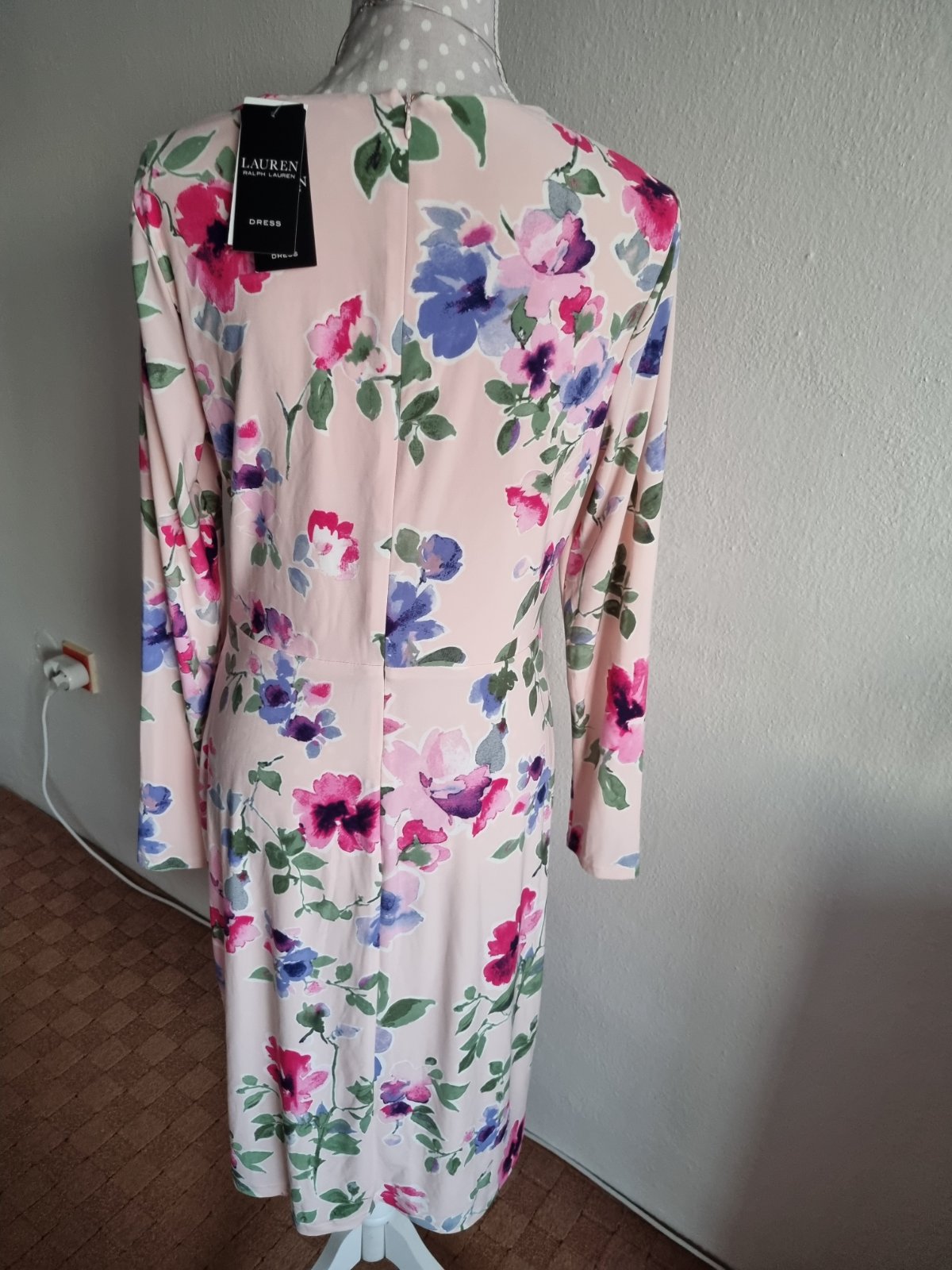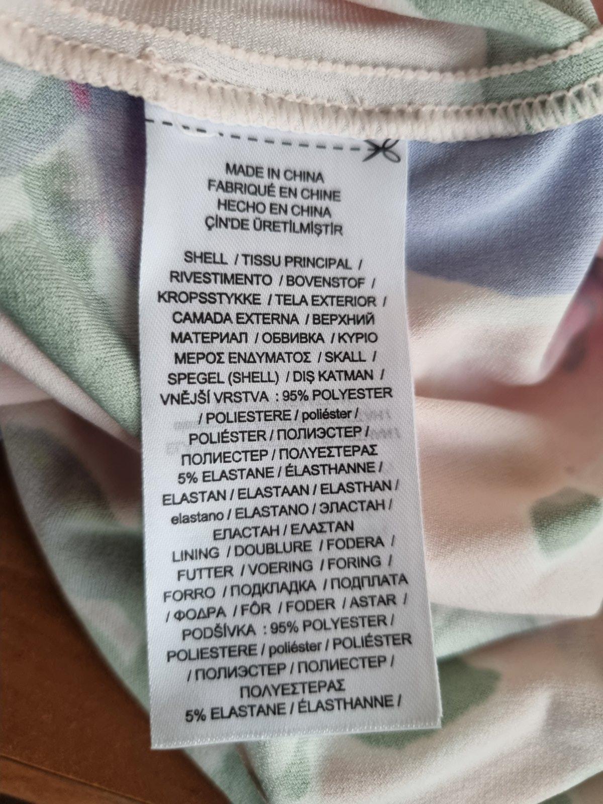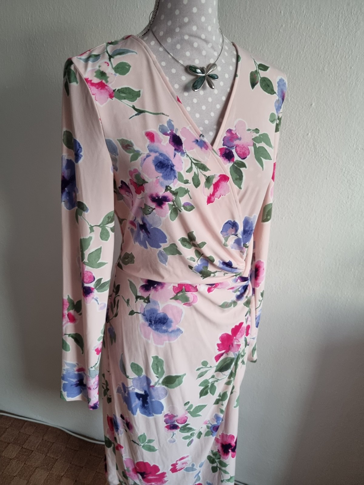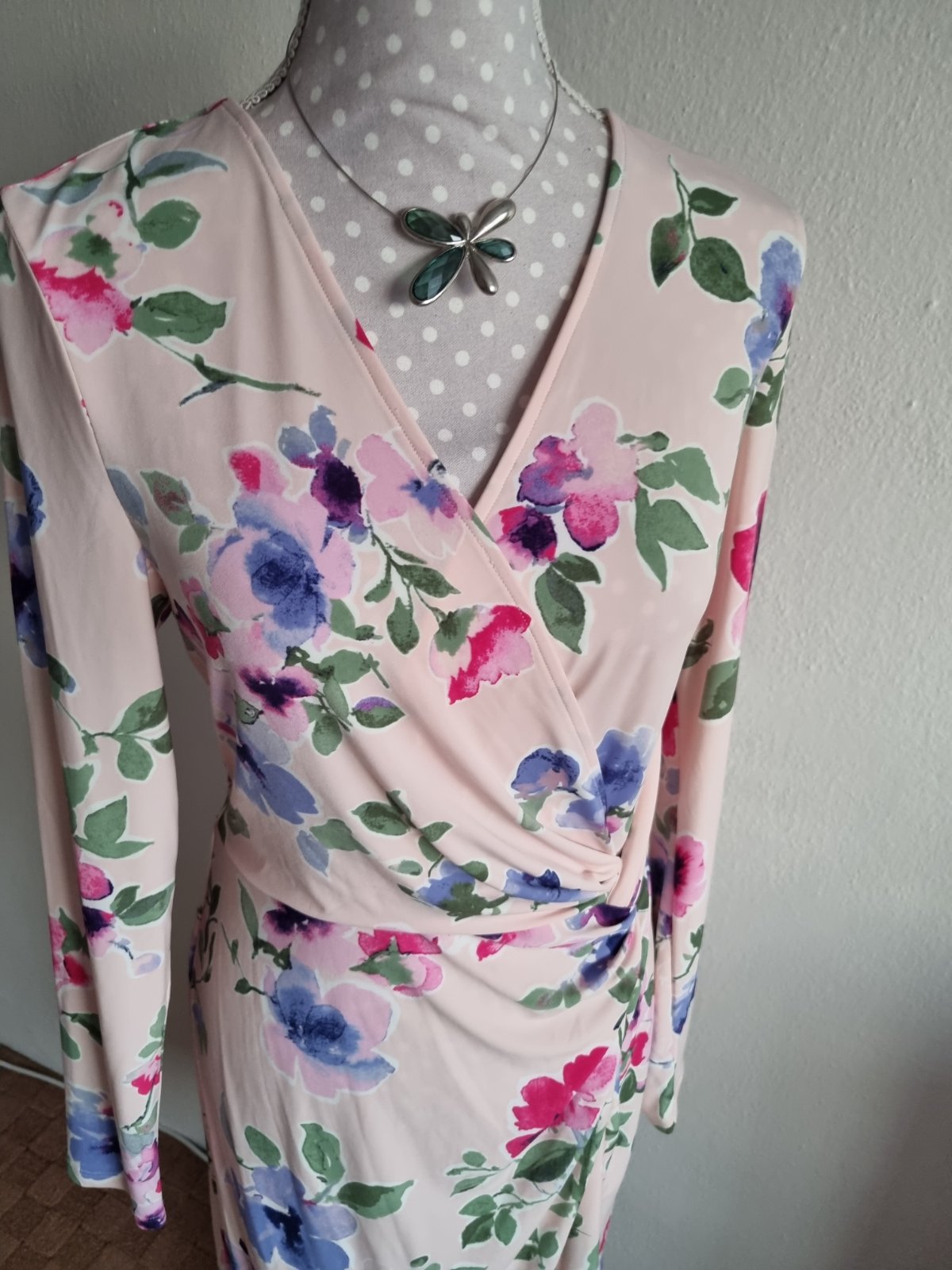 elastické šaty drahej značky, bledoružový podklad, kvetovaný vzor, s visačkou, píše veľ. 10 čo je 40...dlžka šiat od ramena 103, prsia 2x48 v kľude, pás 2x40 v kľude, boky 2x51 v kľude...rukáv od krku 72...šaty sa pekne prispôsobia...sú podšité, materiál je tenší syntetický elastický úplet, ktorý sa nežmolí, nevyťahá a nestráca farbu