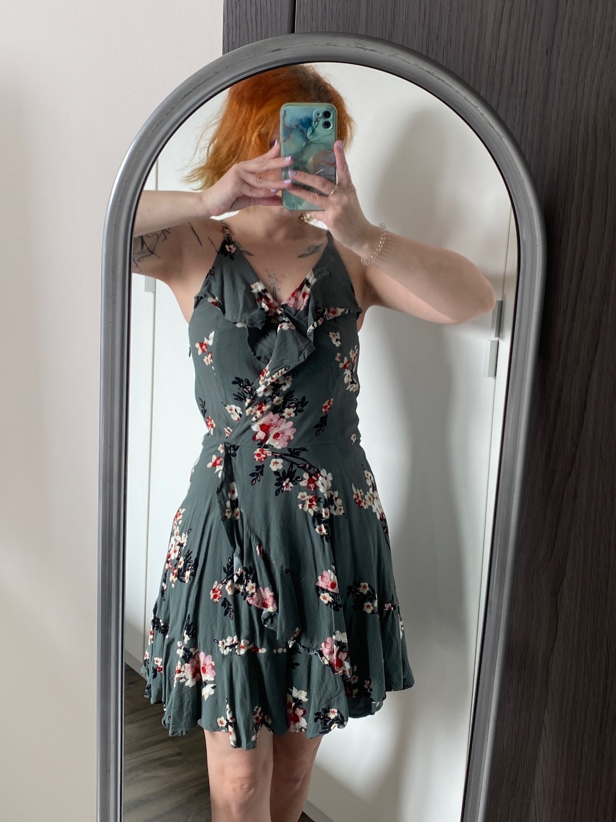 Šaty s volánmi eukalyptovo zelená kvetovaná