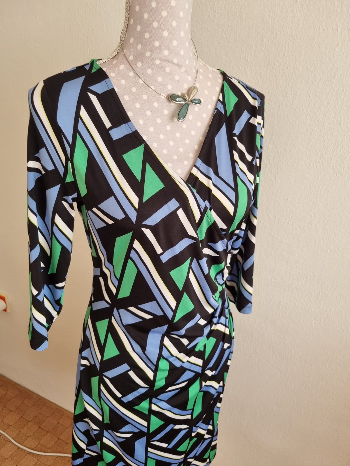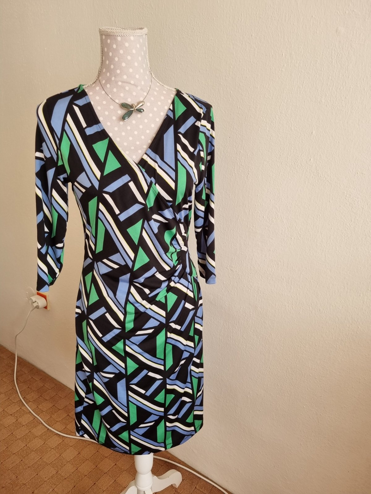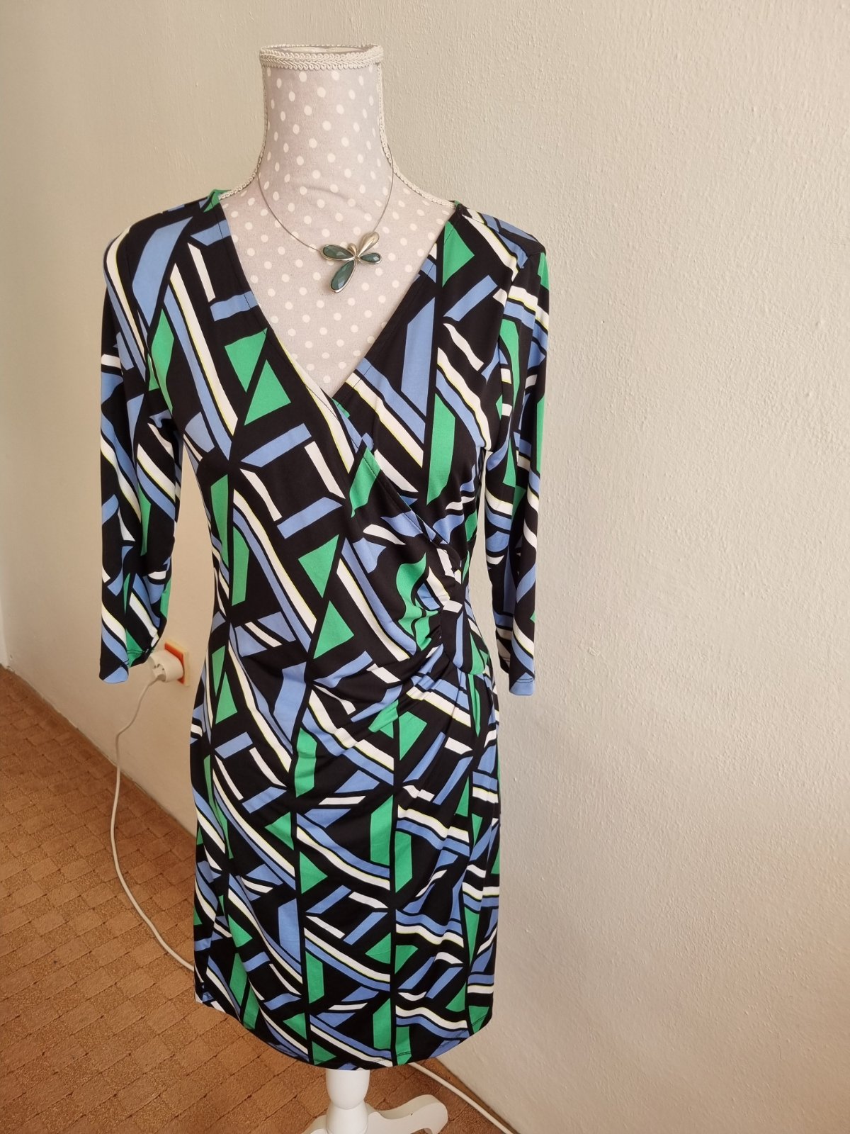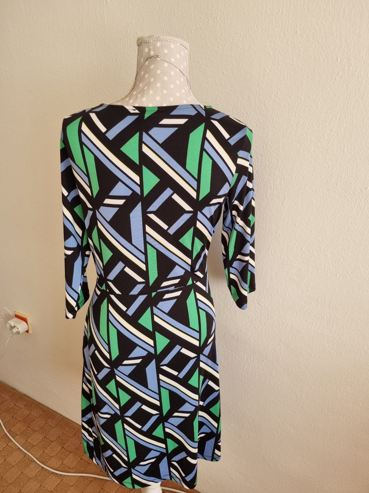 1x oblečené, elastické šaty, zelena čierna biela svetlomodra farba, , dĺžka 99, prsia 47x2, pás 39x2, boky 47x2 všetko merané v kľude, rukáv od krku 49