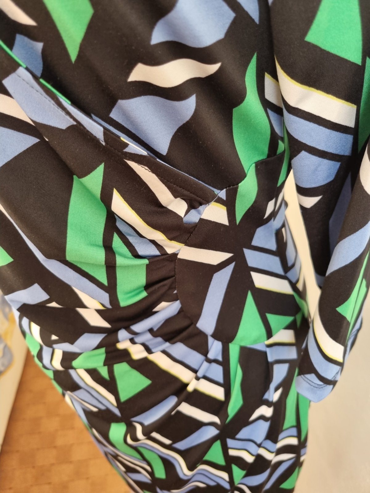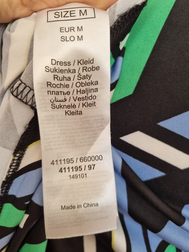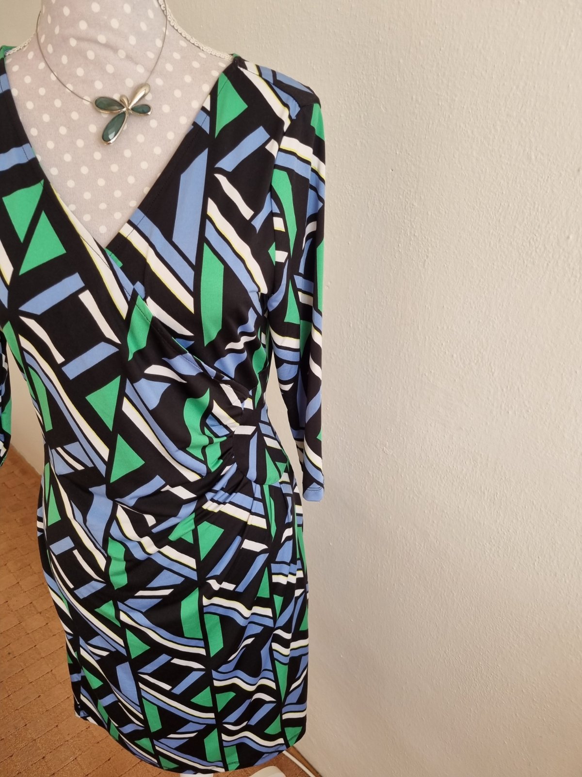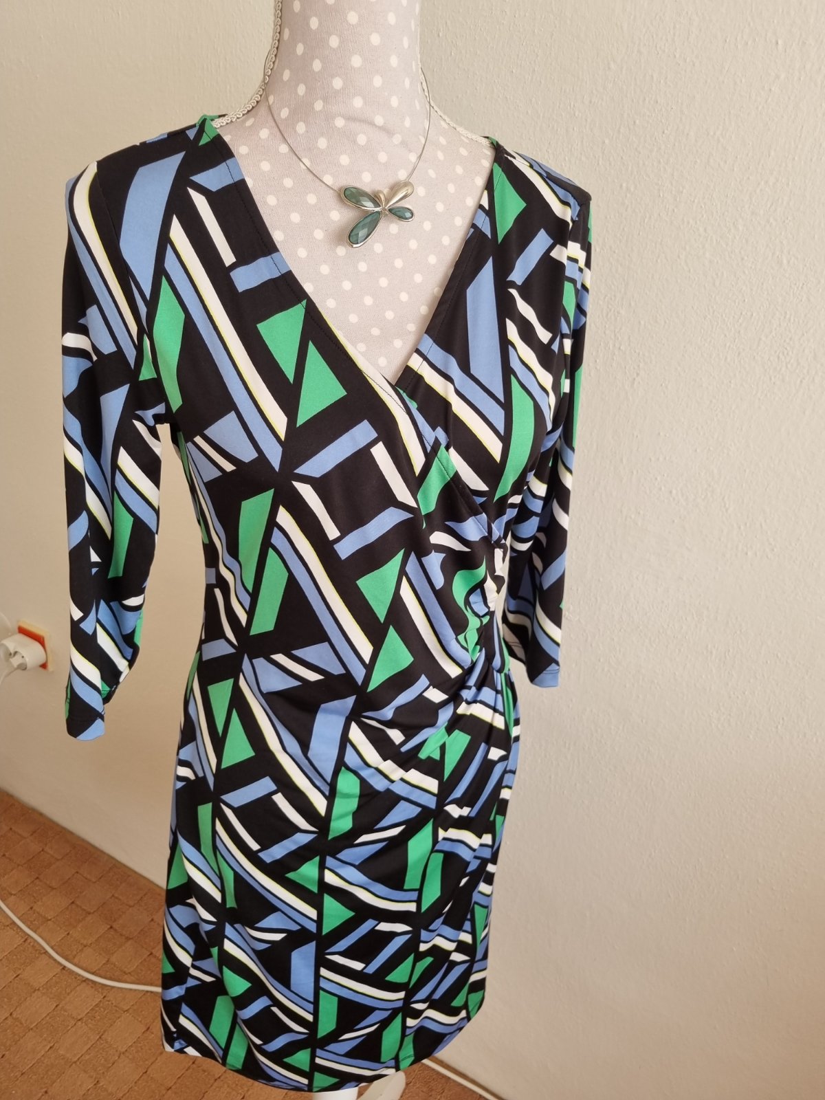 1x oblečené, elastické šaty, zelena čierna biela svetlomodra farba, , dĺžka 99, prsia 47x2, pás 39x2, boky 47x2 všetko merané v kľude, rukáv od krku 49