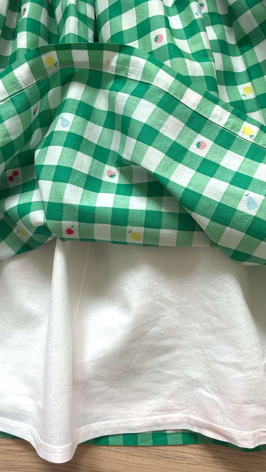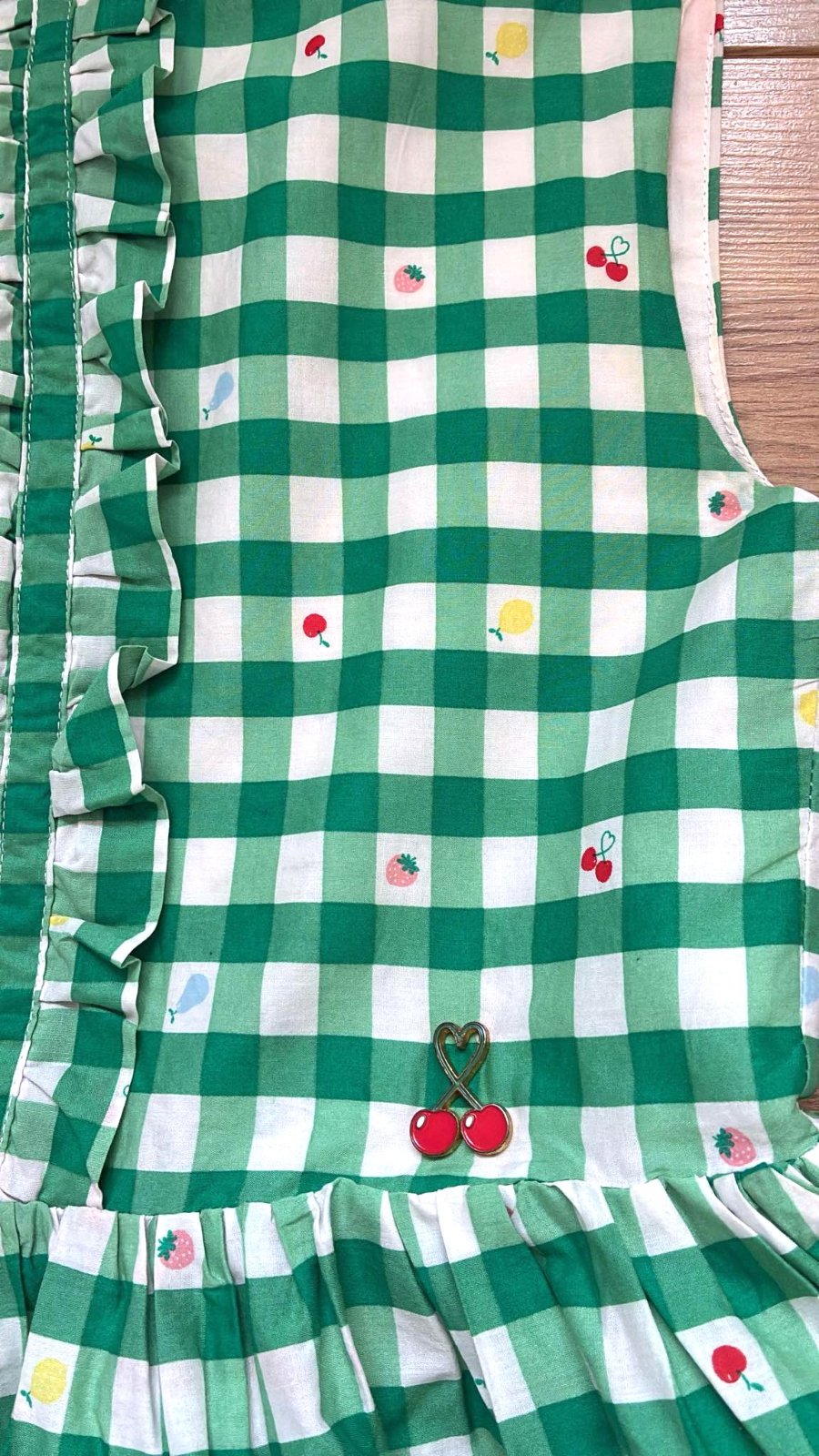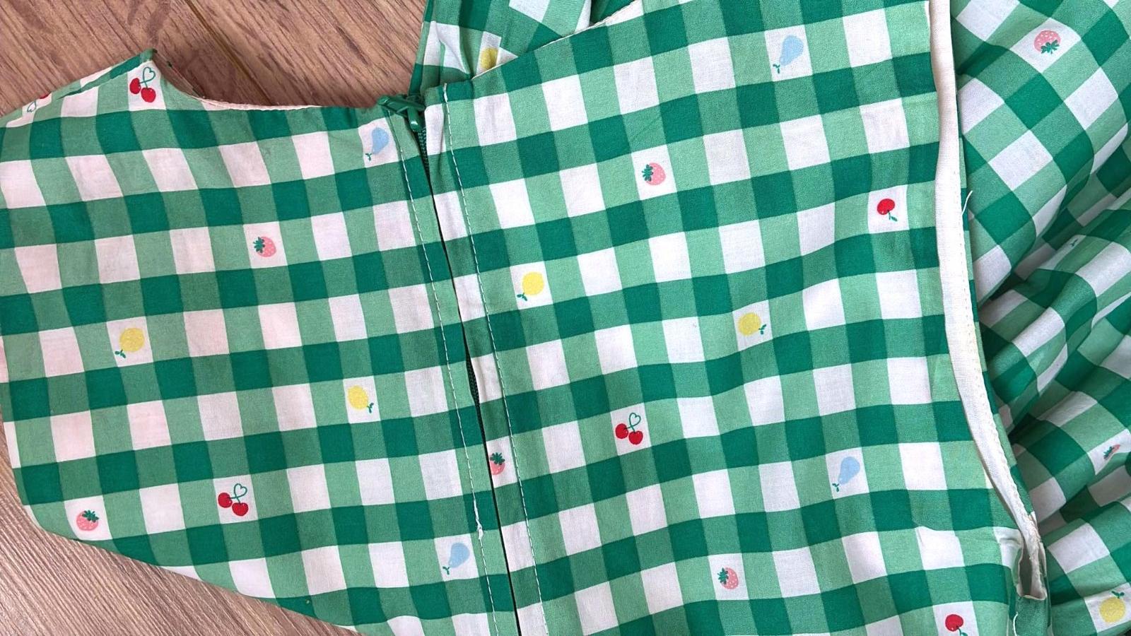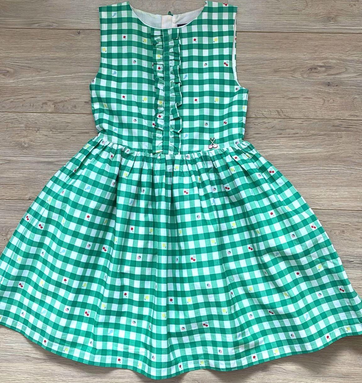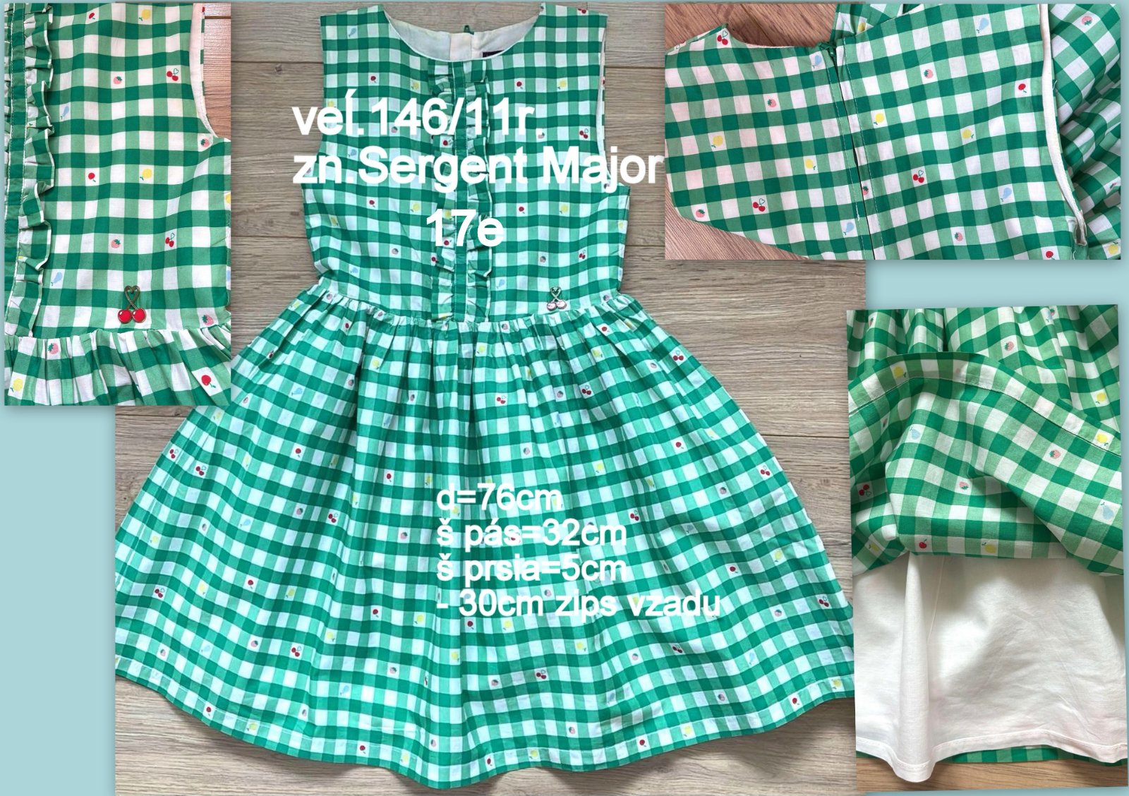 Predám letné šaty kvalitnej francúzskej značky v zeleno-bielom károvanom vzore (vichy kocka), doladené malým ovocím, pri páse malá 3D aplikácia čerešní, sú zdobené jemným volánikom na hrudi, majú bohatú nariasenú sukňu s bielou spodničkou, ktorá krásne drží tvar sukni a aj nepresvitá. Vzadu praktické zapínanie na 30cm dlhý zips, d´76cm, š prsia=35cm, š pá= 32cm, materiál priedušný, príjemný na nosenie v lete, 100% bavlna, top stav ako nové.