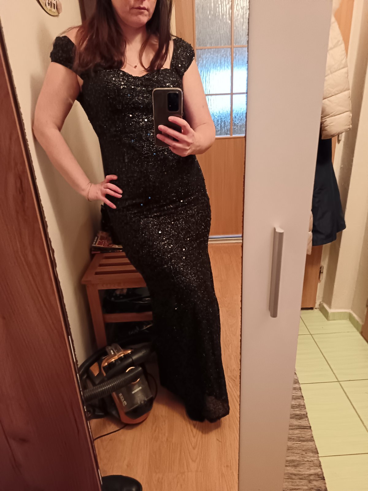 Krásne obtiahnuté dlhé šaty značky Lifeline, rafinované, vyšívané flitrami a mierne strečové. Sú podšité po kolená. Od kolien dolu transparentné. PC vysoká.